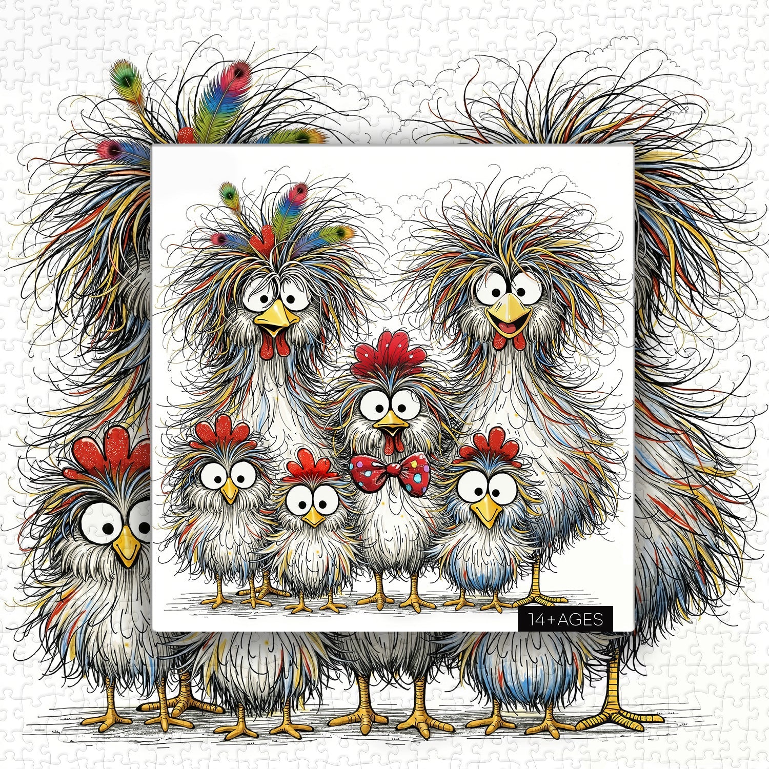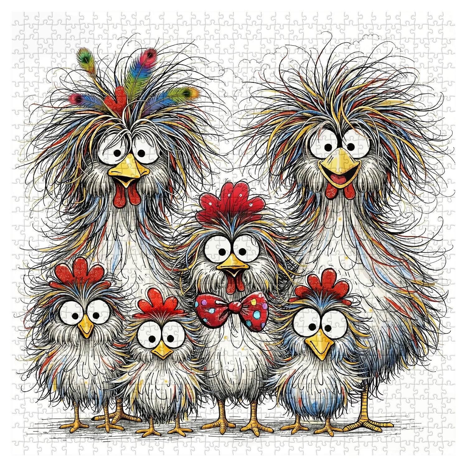 Whimsical Chicken Family Group: A family of five chickens (2 adults, 3 chicks) is depicted with exaggerated, fluffy multicolored feathers (white base with blue/yellow/red streaks) and oversized googly eyes.