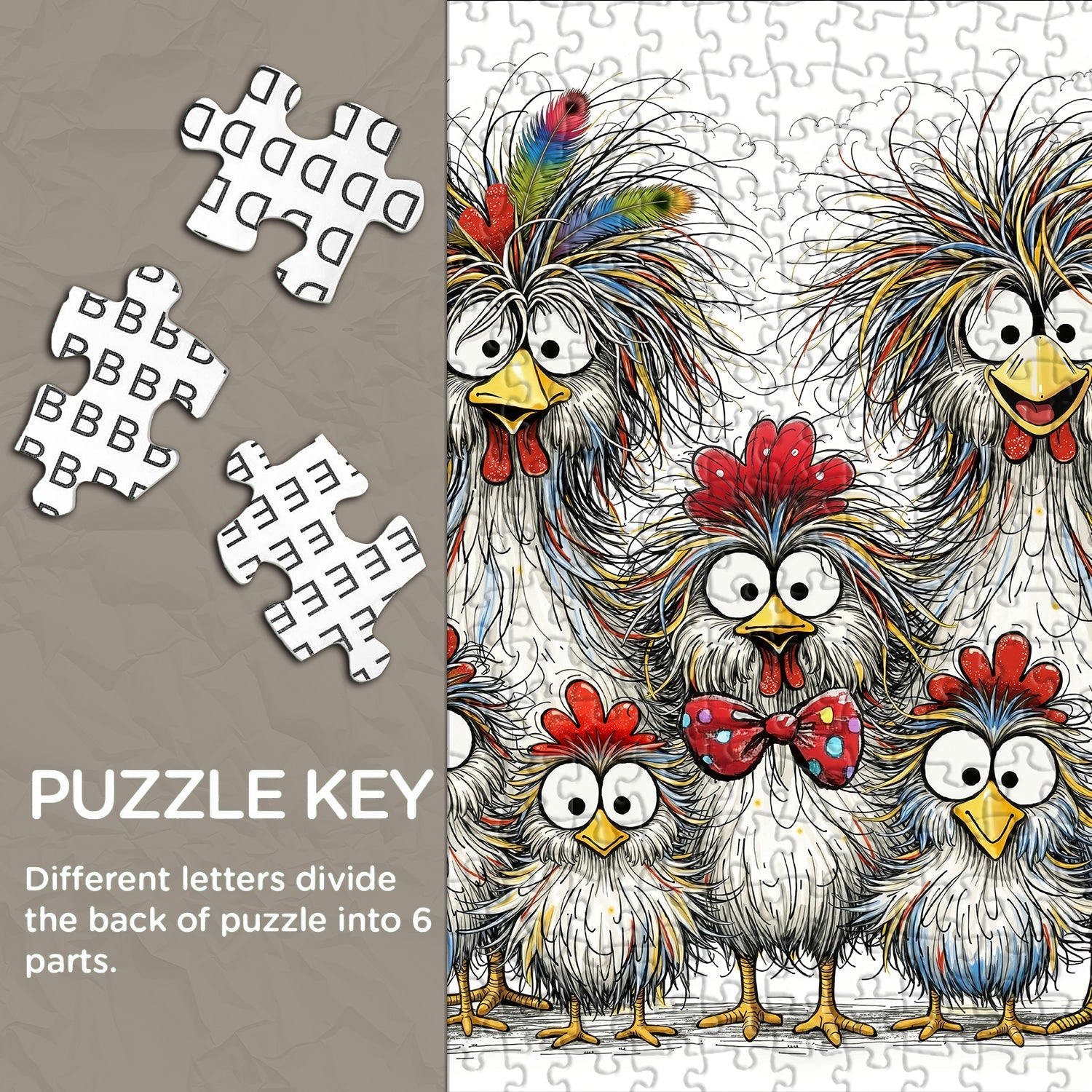 Cartoonish, Expressive Features: All chickens have wide, surprised expressions (open beaks, large eyes) and messy, frizzy feathers, enhancing their comical, lighthearted vibe.