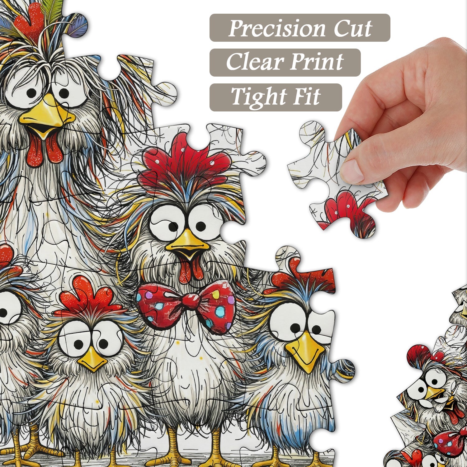 Playful Accessory Details: One chick wears a red polka-dot bow tie, while an adult chicken has a peacock feather accent in its crest — adding quirky, charming touches.