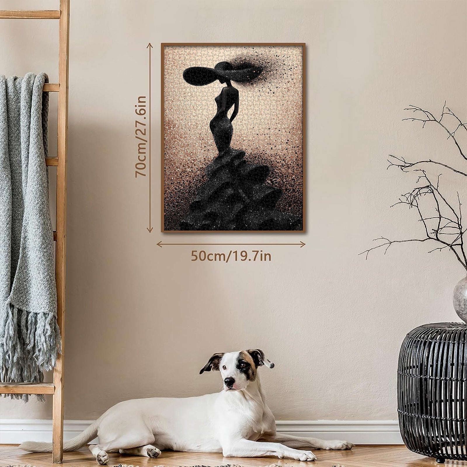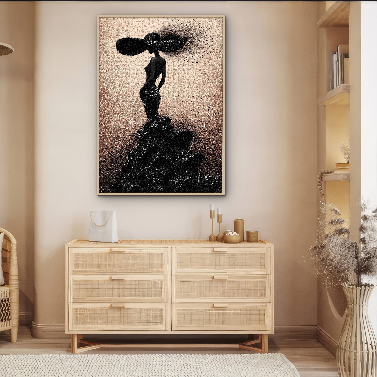 Main Image: The core of the picture is a black silhouette of a woman. She stands gracefully sideways, with beautiful body curves, exuding a quiet and noble temperament.
