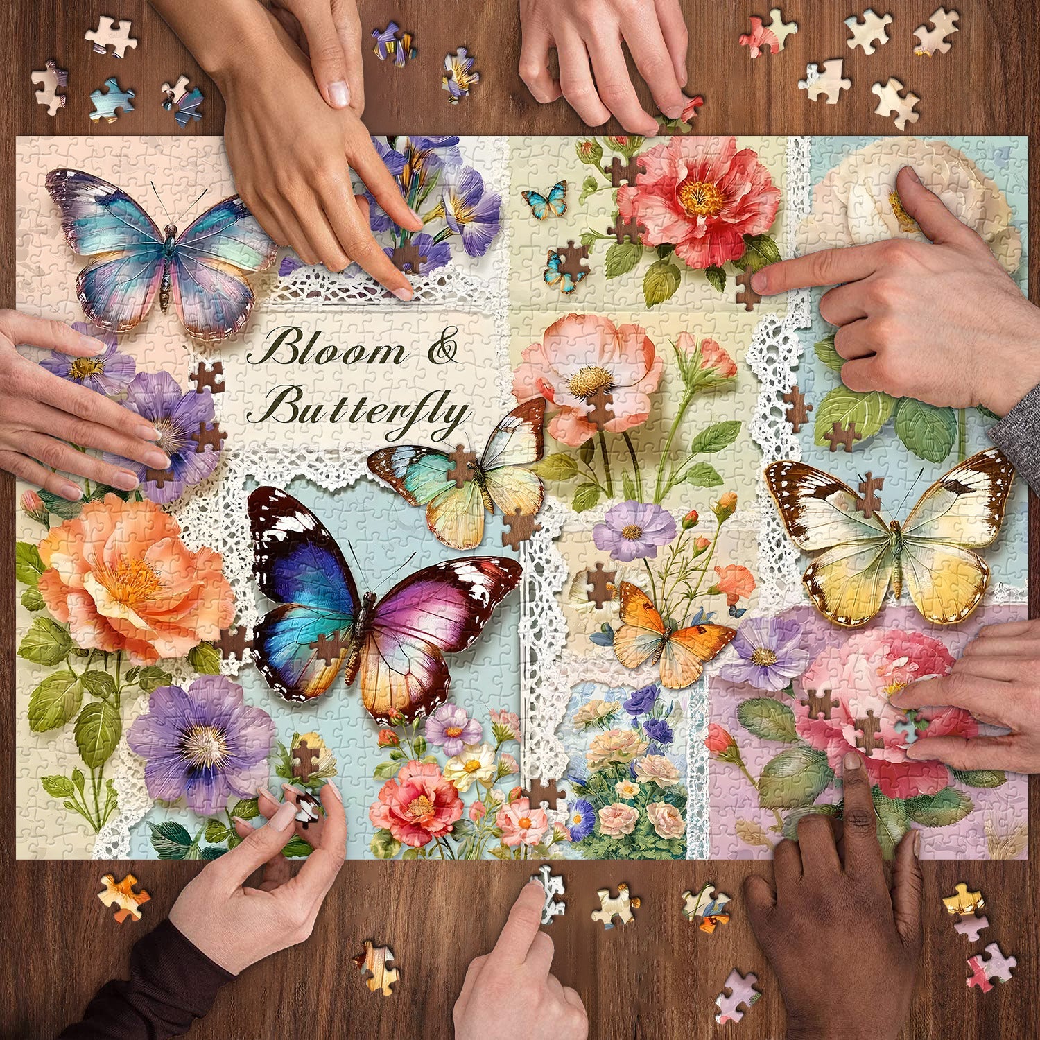 Artistic Theme & Visual Details:Centered on the "Bloom & Butterfly" concept, this puzzle showcases a lush, whimsical design—including full-bloom florals (peach poppies, blush roses, purple wildflowers) with textured petals, plus multi-hued butterflies (iridescent blue, gradient purple-yellow, cream-brown patterns);the patchwork layout is accented with delicate lace trim, adding a vintage, handmade-like charm.