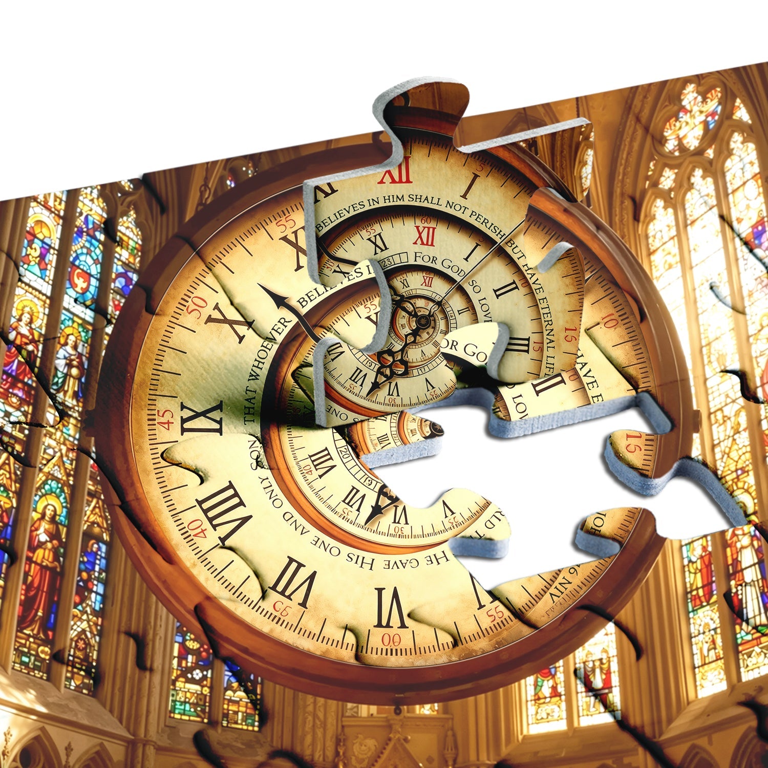 Blend of Function & Symbolism: The clock (a marker of time) combined with the cathedral’s sacred space and biblical text creates a symbolic link between time, faith, and spirituality.