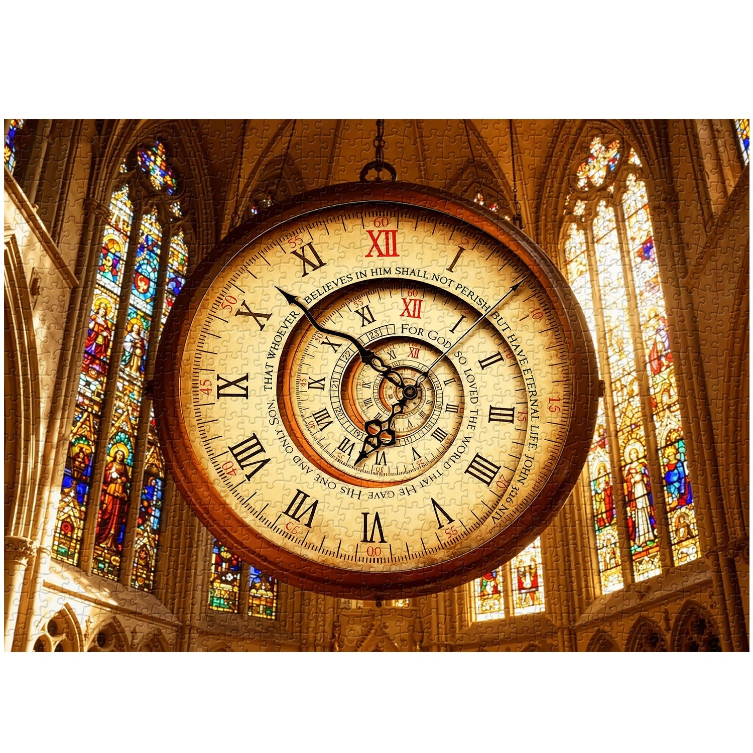 Inscribed Religious Text: The clock face displays a biblical verse (from John 3:16: "For God so loved the world..."), tying the timepiece to the cathedral’s spiritual context.
