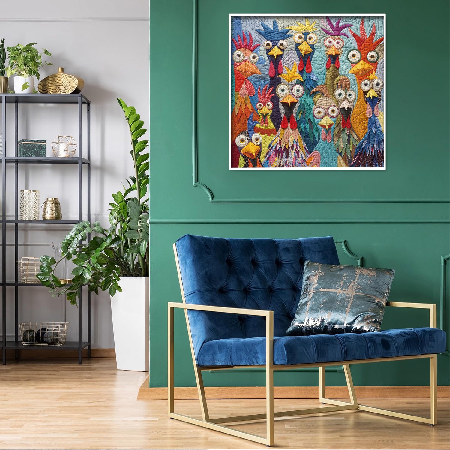 Whimsical Design: The chickens have exaggerated facial features and playful postures, contributing to a whimsical and humorous artistic style.