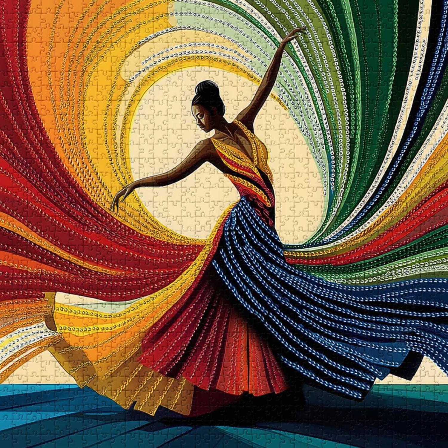 Background Elements:Swirling, multicolored patterns form the background, echoing the colors of the dancer's dress and adding a sense of movement.