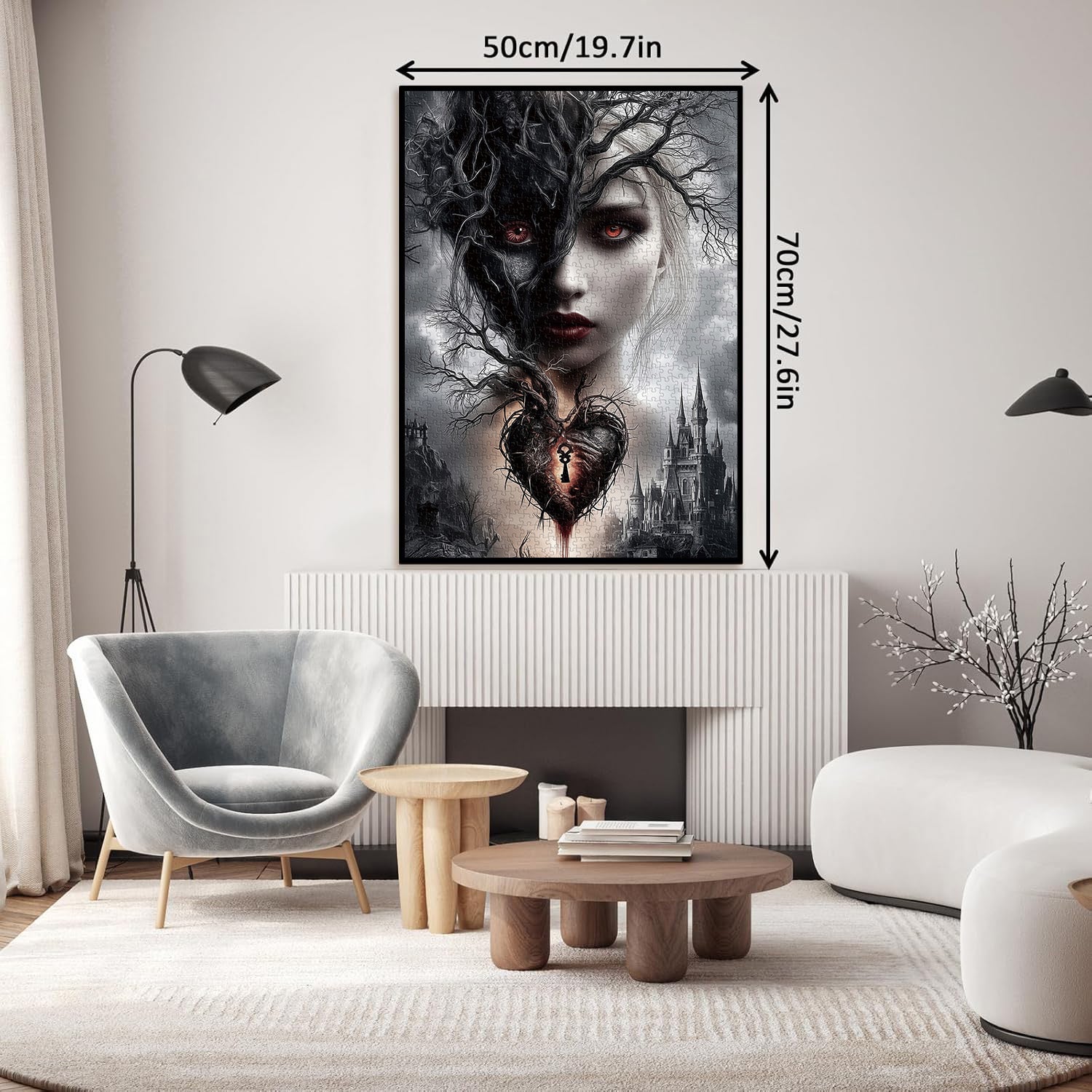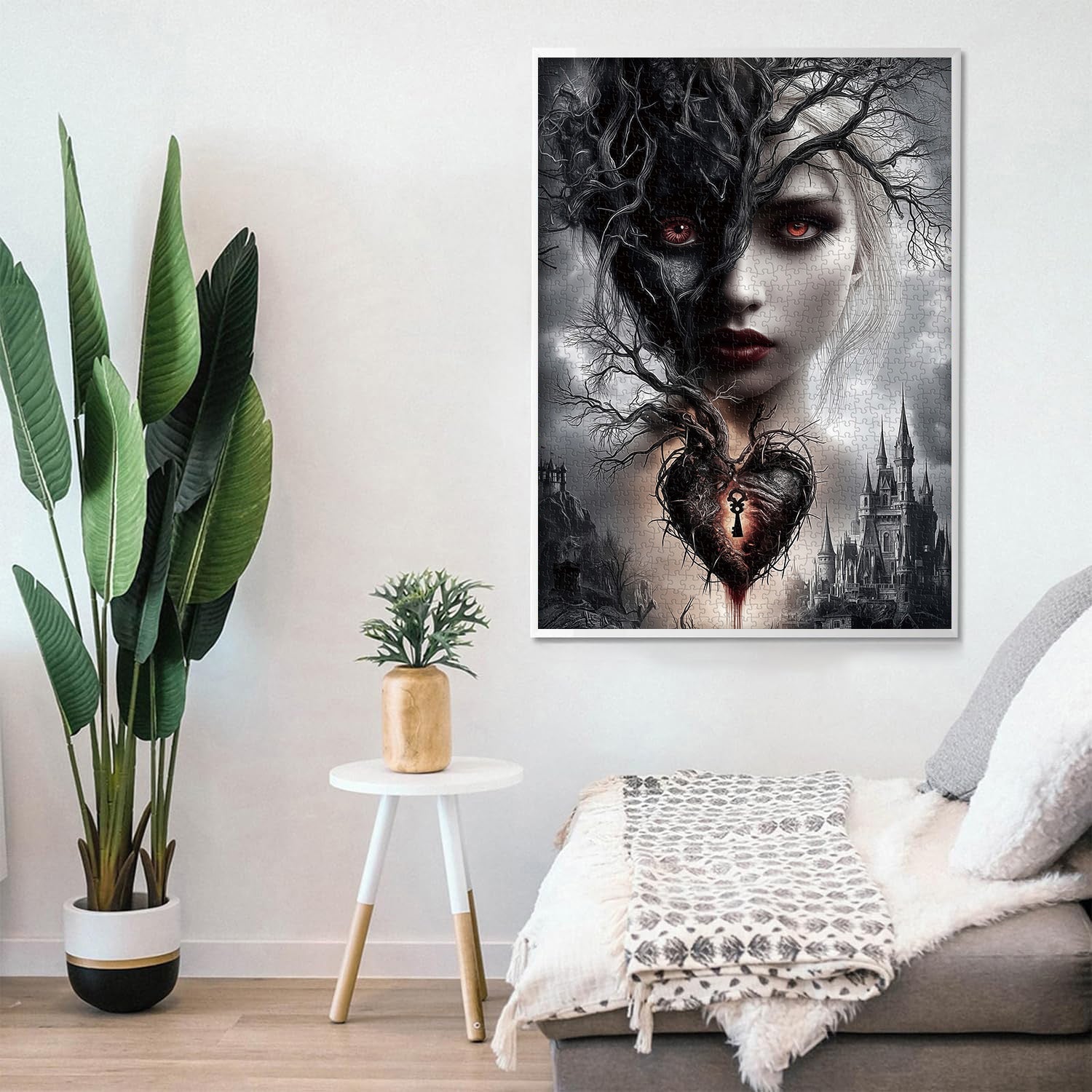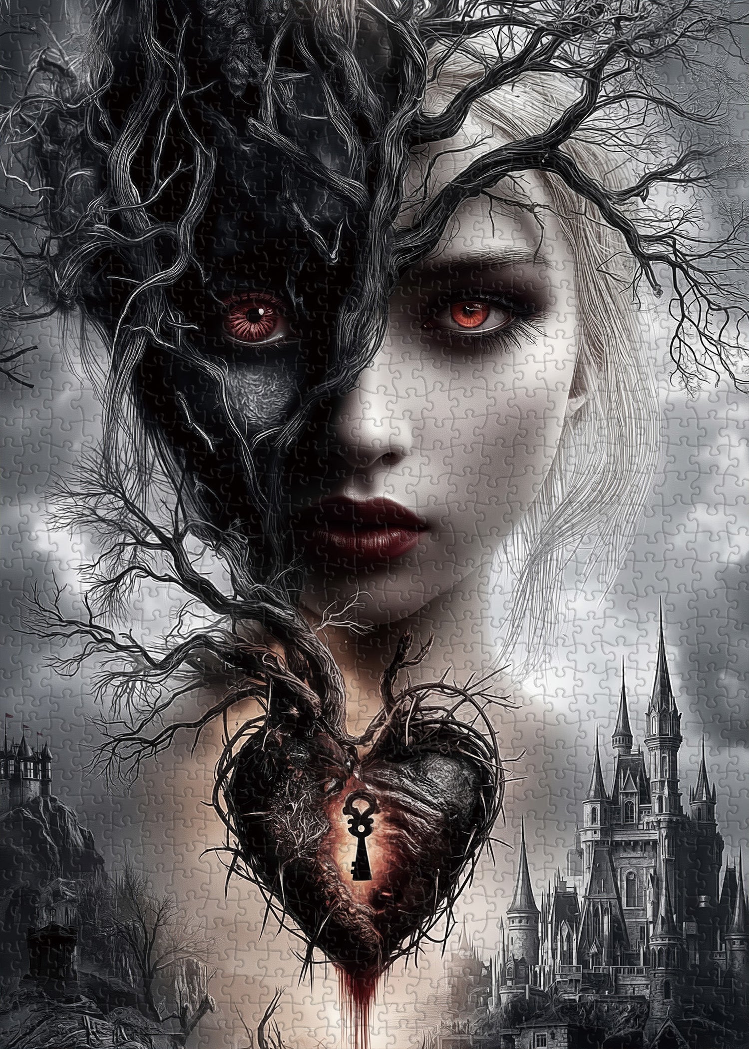 Sinister, Twisted Foliage: Gnarled, bare branches weave through the portrait (blending into the shadow half and heart), enhancing the eerie, gothic aesthetic.