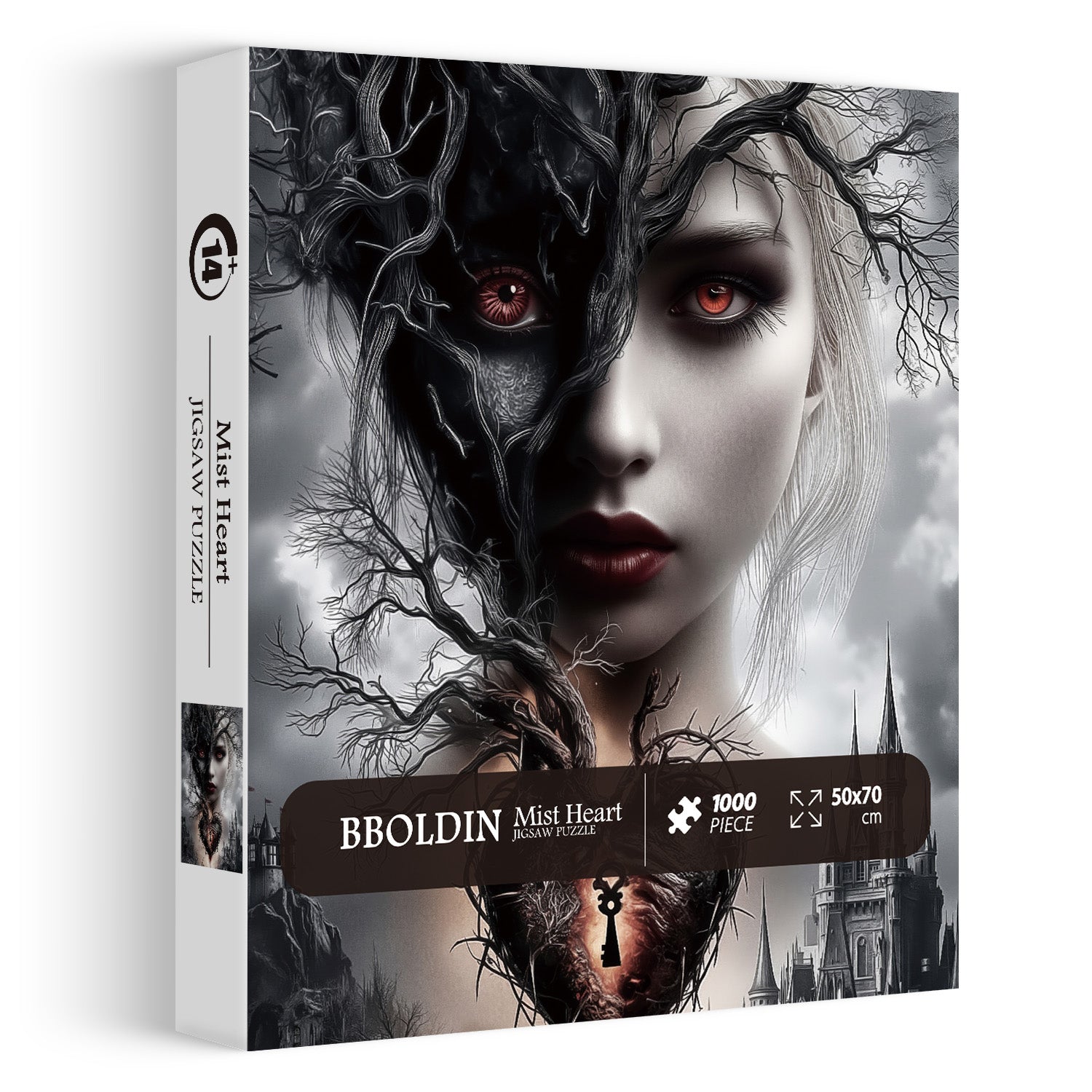 Gothic Heart Motif: A twisted, thorny heart (with a keyhole at its center) hangs below the face, with a single key inserted; a red "drip" detail adds a dark, dramatic touch.