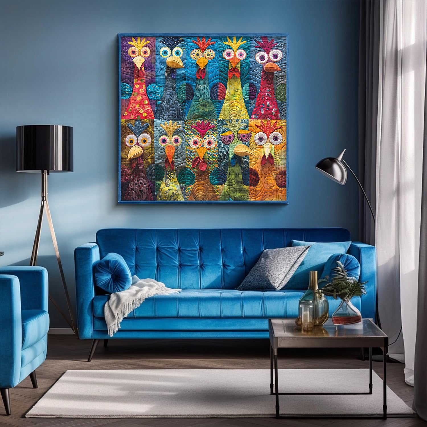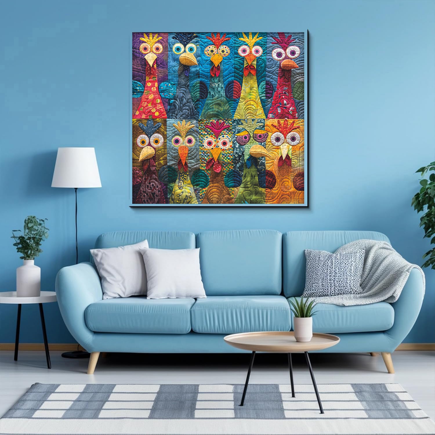 Whimsical Design: The chickens have exaggerated, cartoonish eyes and features, contributing to a playful and whimsical artistic style.