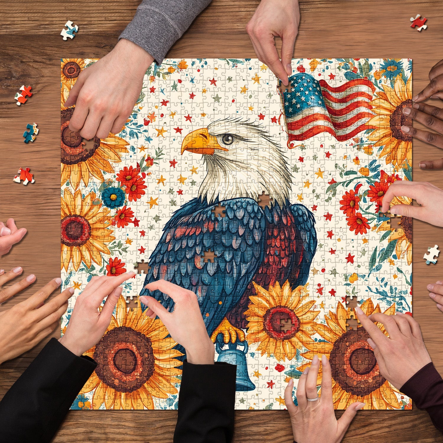 Patriotic Symbolism & Folk-Art Flair 🦅 The puzzle features a whimsical folk-art illustration of America’s iconic bald eagle, paired with the waving U.S. flag, sunflowers, and a liberty bell, set against a star-dappled, floral backdrop—every detail celebrating national pride with vibrant red, white, and blue hues.