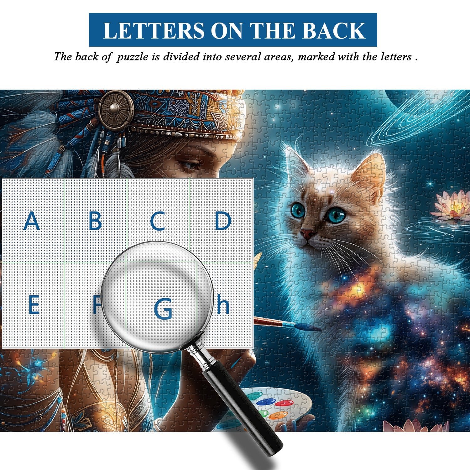 Surreal Artist & Cosmic Cat Scene: A woman (in ornate, feathered headdress and beaded accessories) paints a ginger cat — whose body contains a swirling cosmic galaxy — blending cultural elements with fantasy.