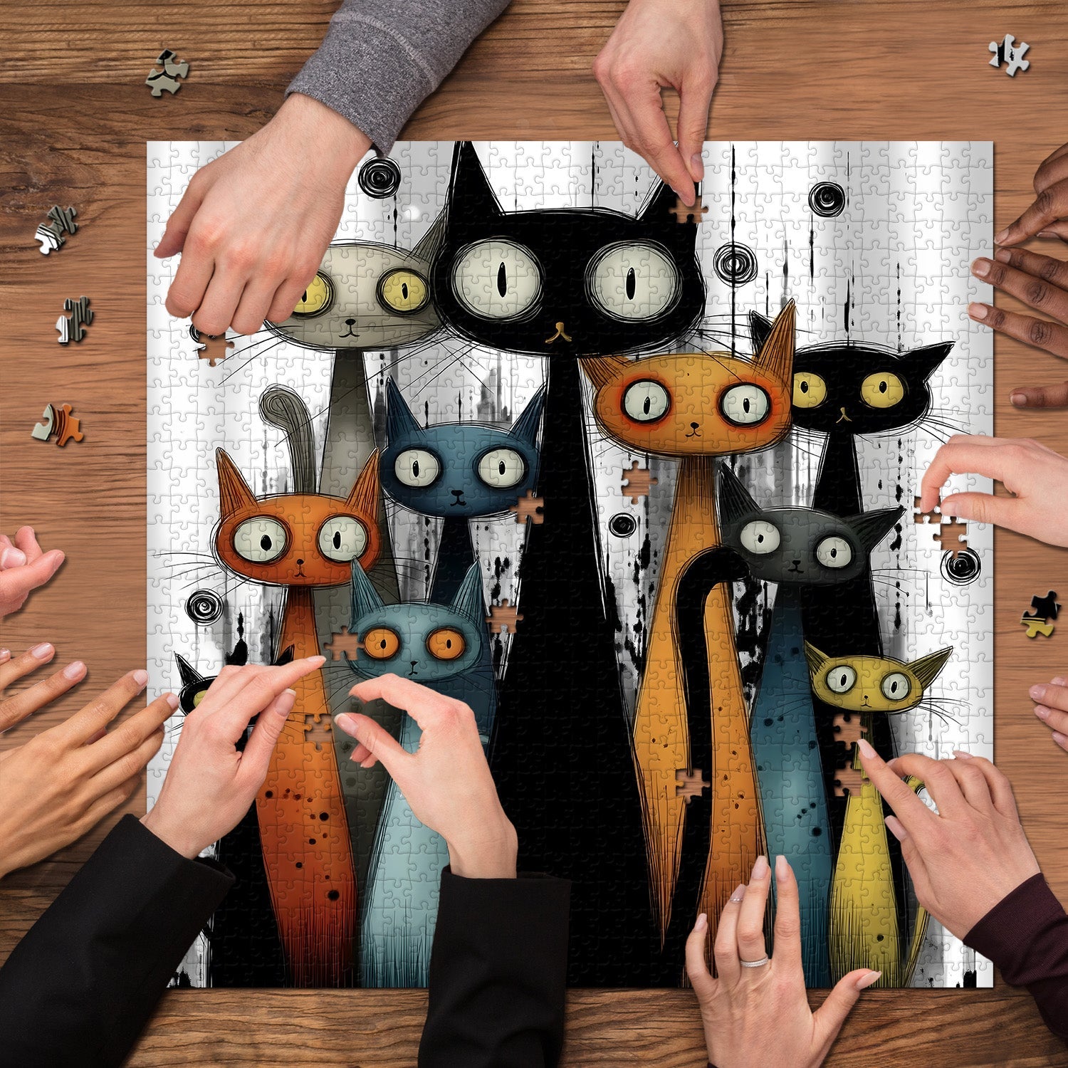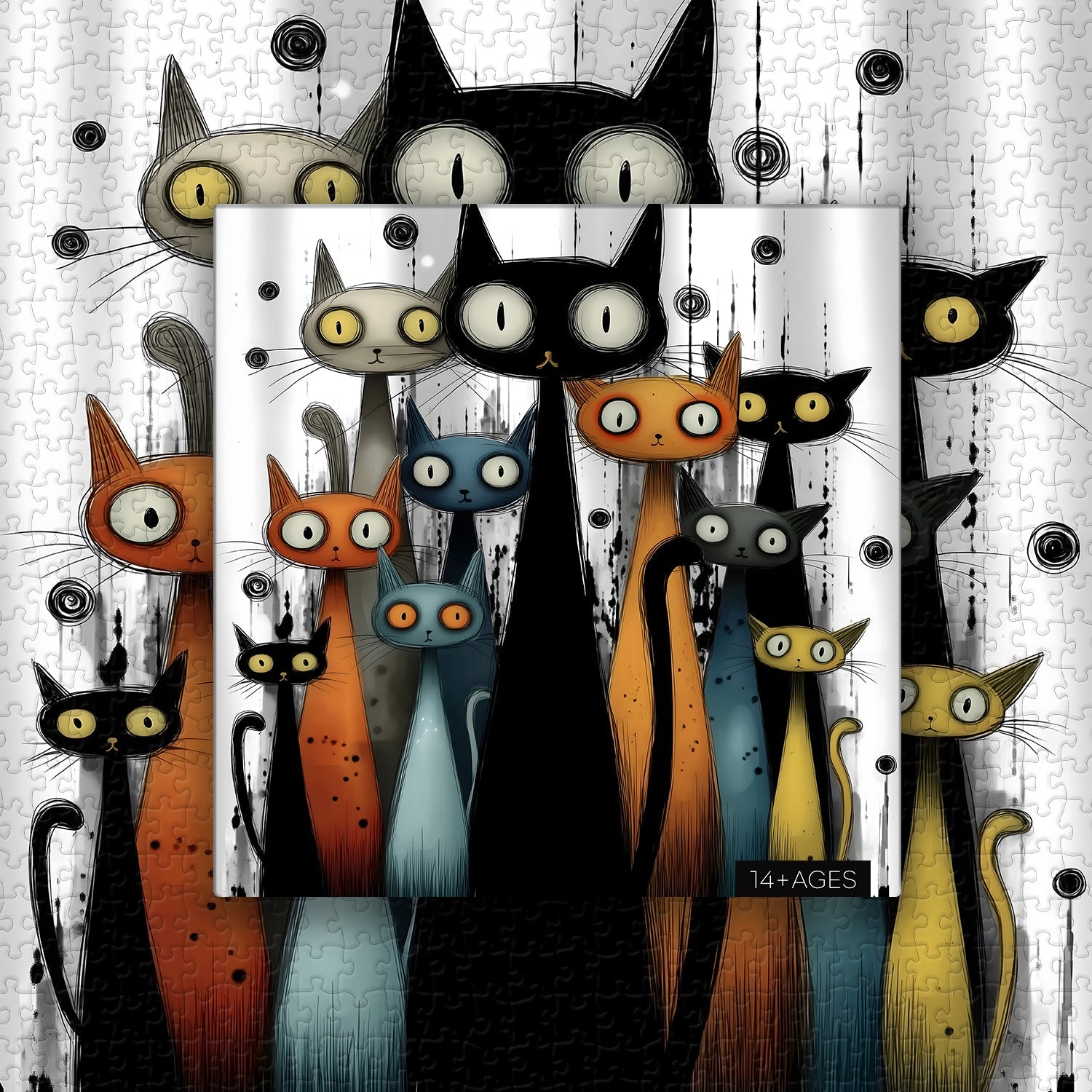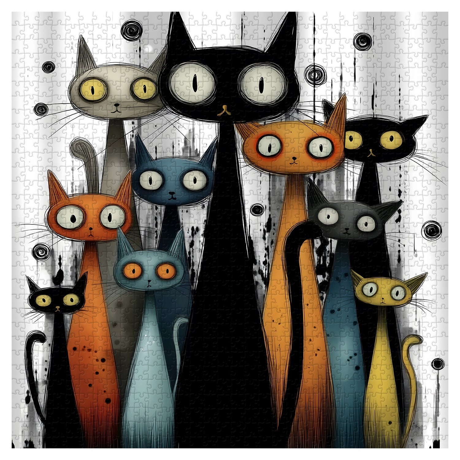 Whimsical Cat Ensemble: A group of stylized cats with exaggerated features, including large eyes and elongated bodies, forms the central subject, each with distinct colors like black, orange, blue, and gray.