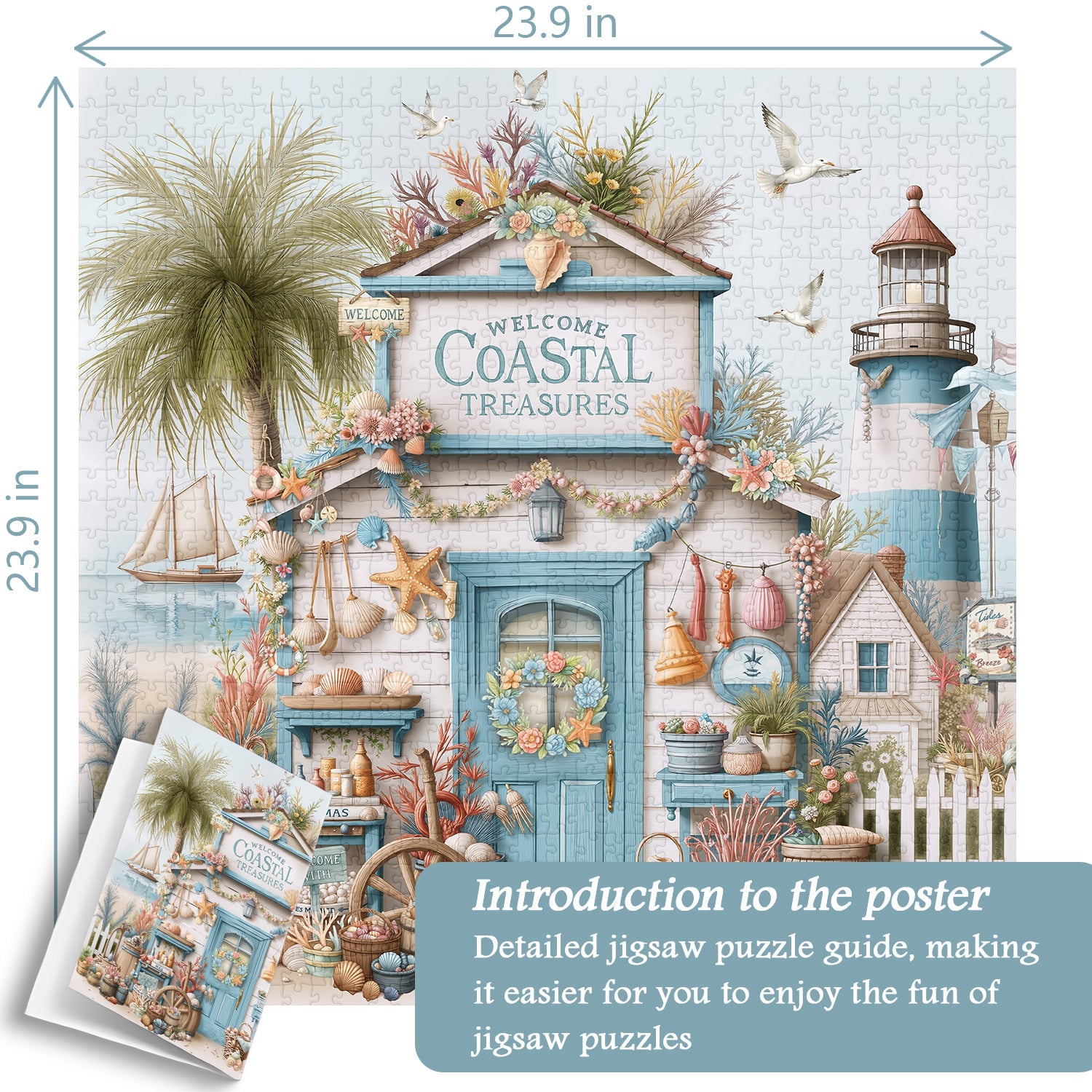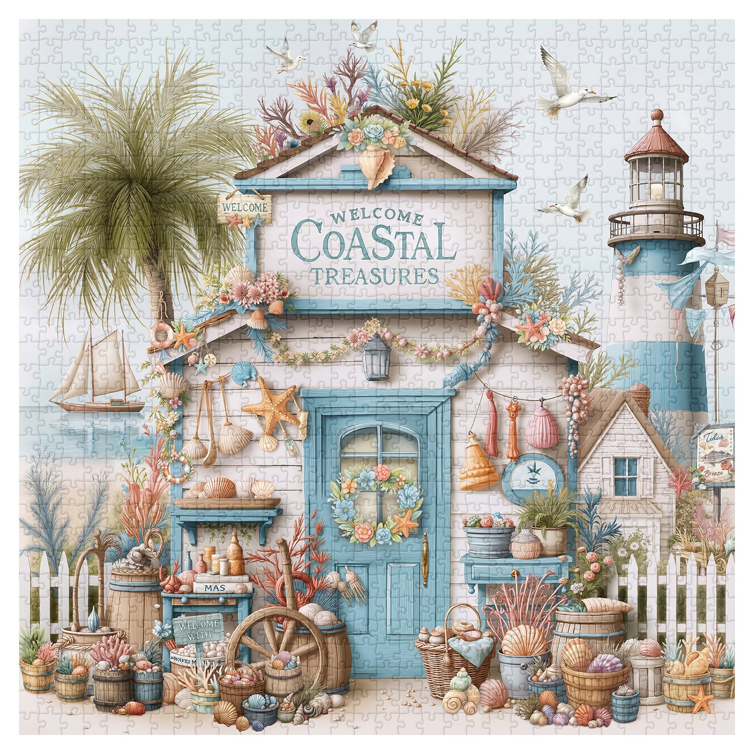 "Coastal Treasures" Shop: A charming shop named "Coastal Treasures" is the central focus, adorned with a sign and surrounded by various seaside - themed decorations.