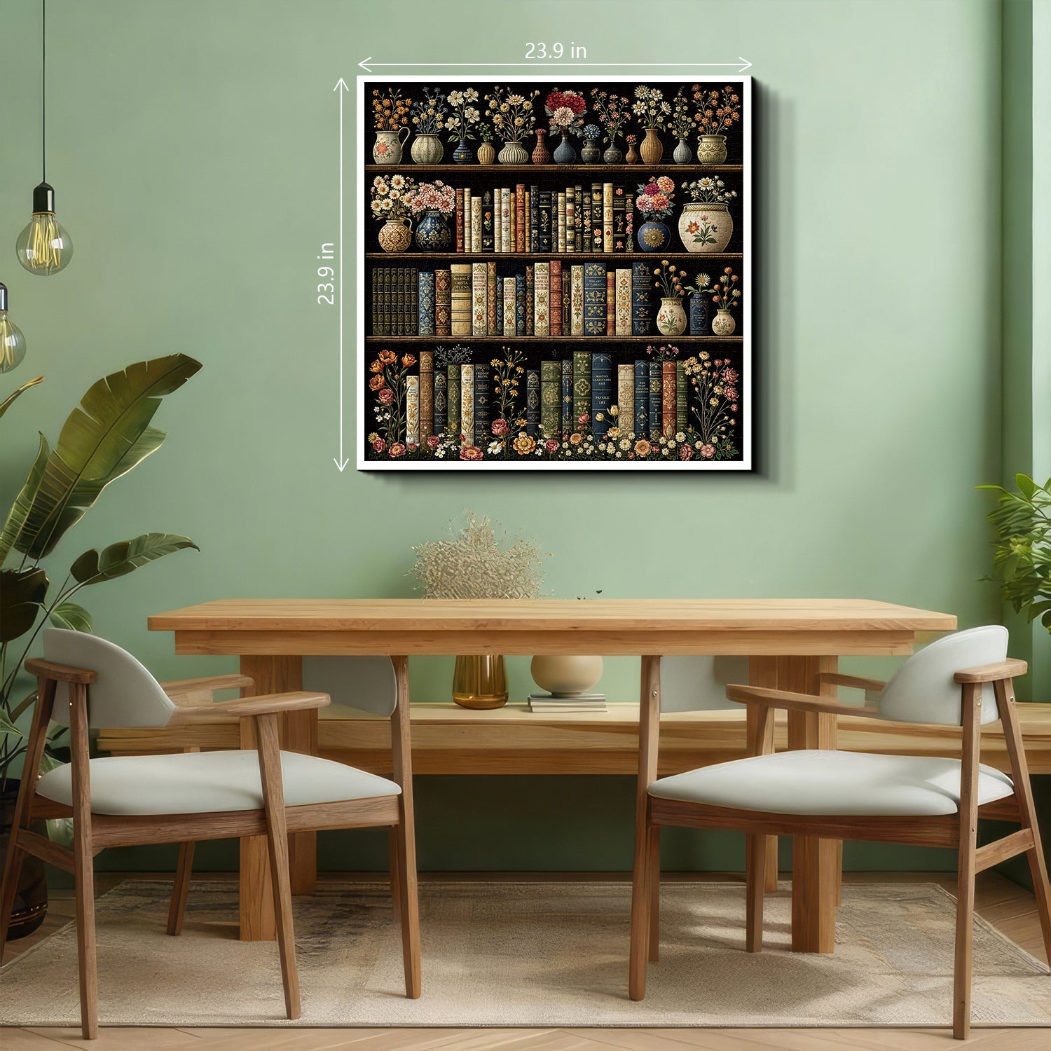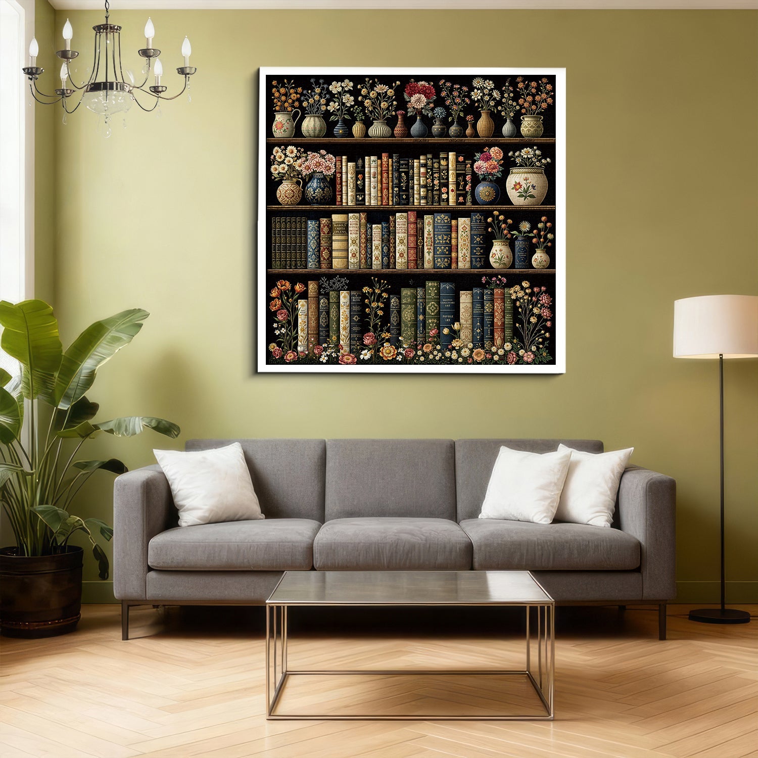 Layered Shelf Composition: The shelves are arranged in layers, each with a mix of books and floral displays, creating a visually rich and balanced composition.