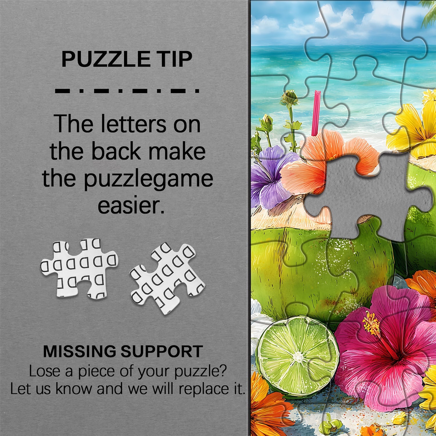 Textural Artistry: Features hyper-detailed, tactile elements: the rough, fibrous texture of coconut shells, delicate petal veins of tropical flowers, dewy droplets on fruit, and the gentle brushstroke texture of the ocean waves—elevating the puzzle experience to a sensory, almost tactile immersion.
