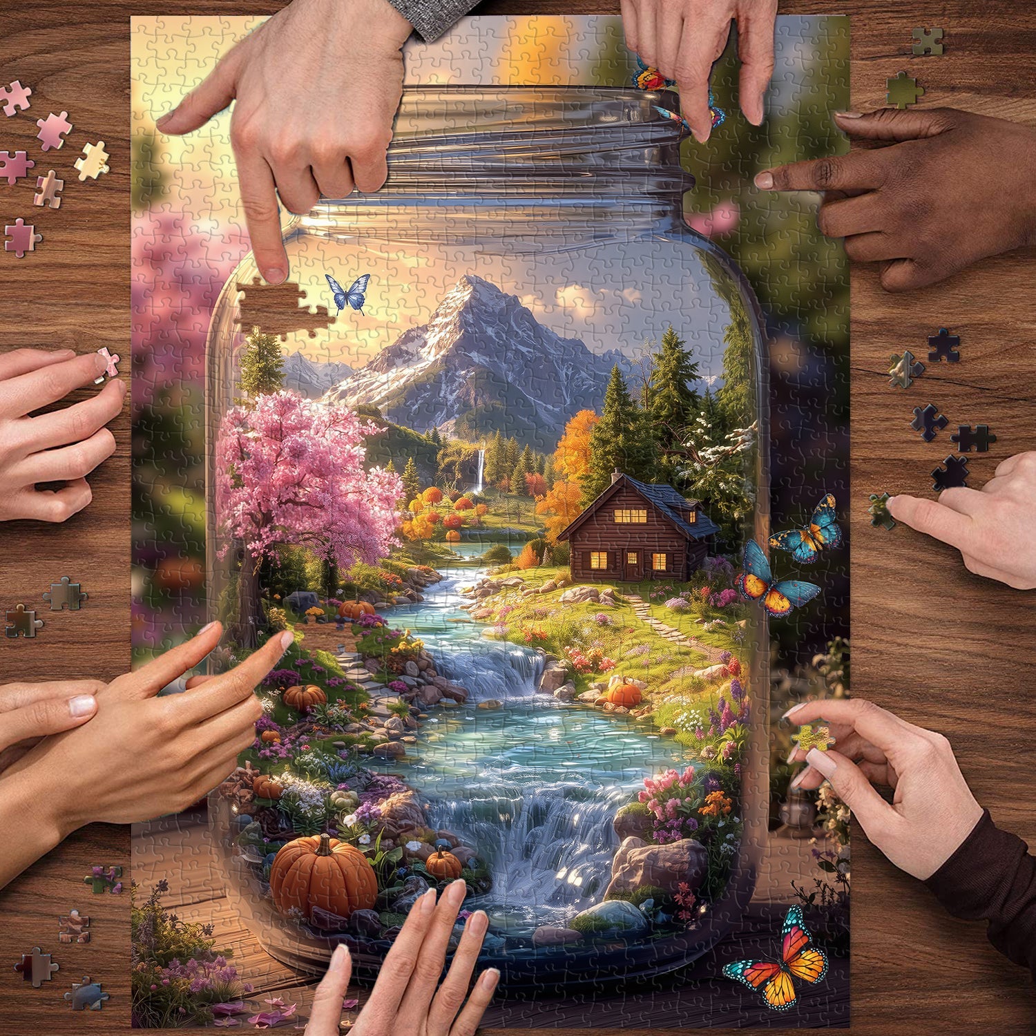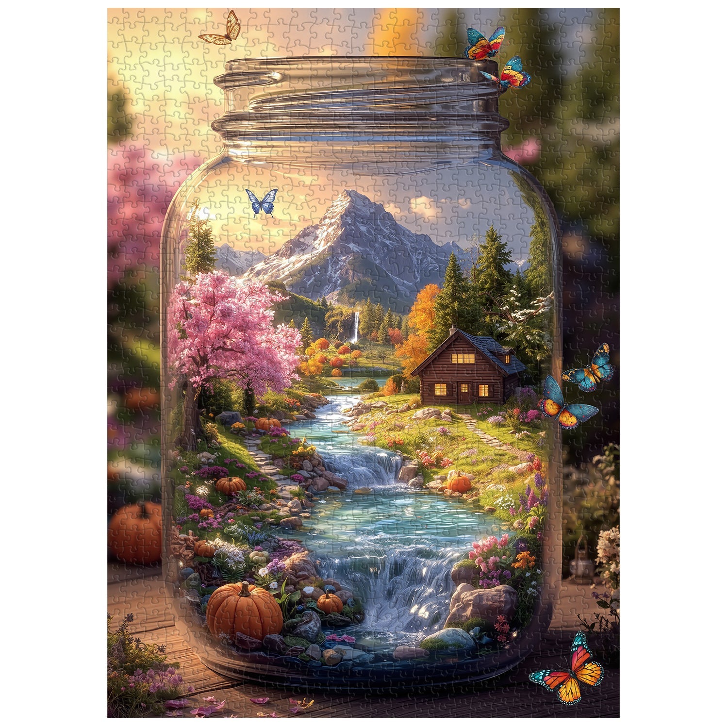 Landscape Details: Inside the jar, there’s a snow-capped mountain, a cascading river with waterfalls, a pink-blossomed tree, autumn-colored foliage, and scattered pumpkins, blending multiple seasons.