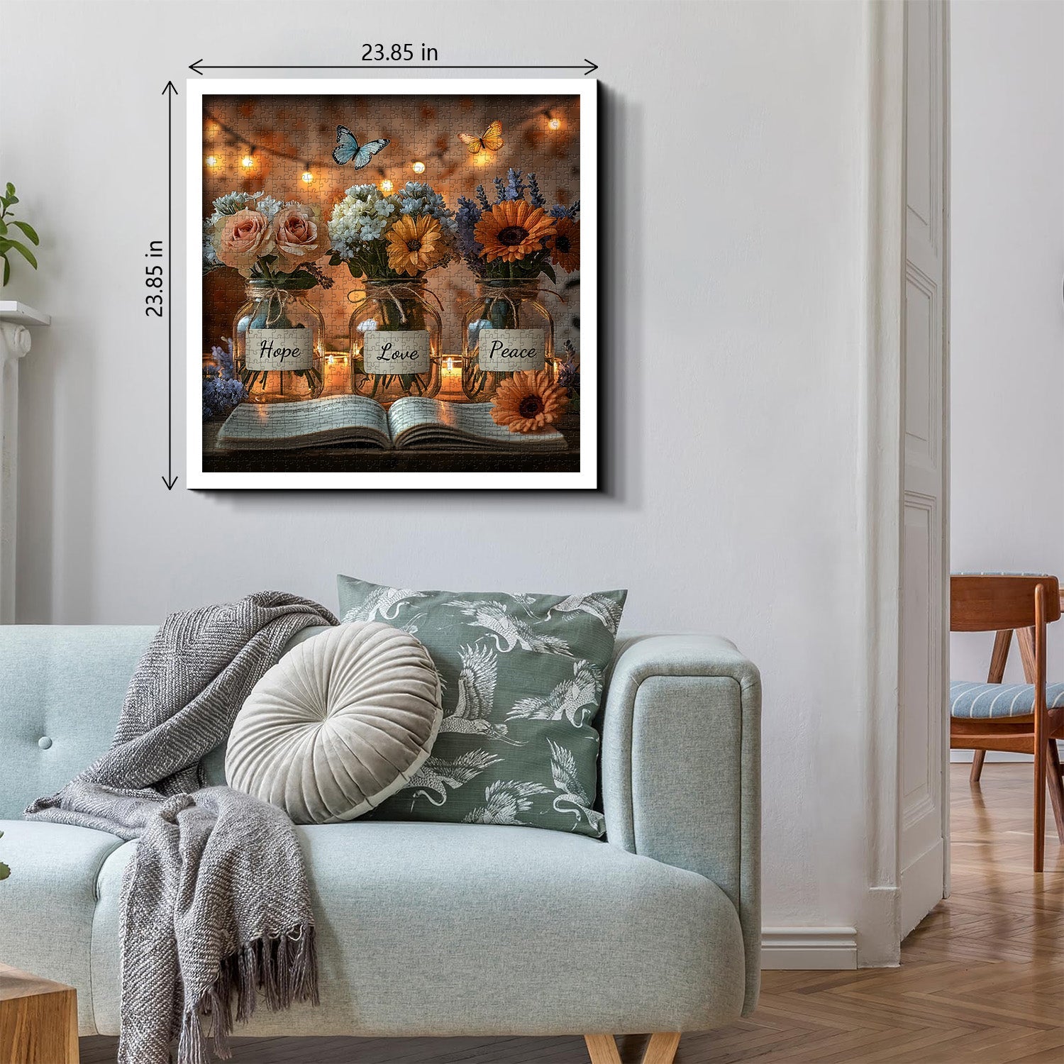 Floral Arrangement: The image features three beautiful glass jars filled with vibrant flowers, each representing a different theme: "Hope," "Love," and "Peace." The flowers in the jars include roses, sunflowers, and other assorted blooms.