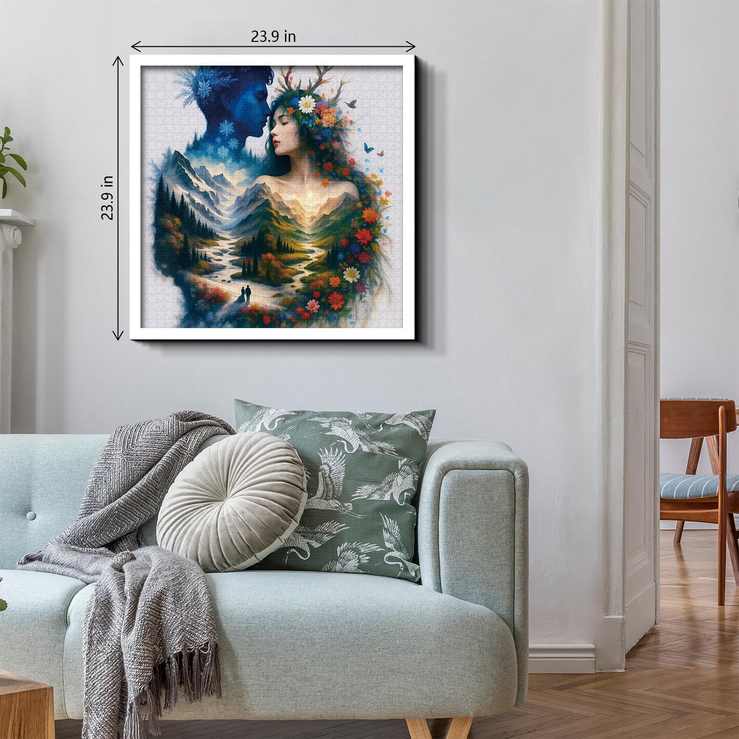Erzählkomposition: Die Komposition erzählt eine Geschichte durch die Kombination von menschlichen Figuren, Naturlandschaften und saisonalen Elementen und lädt den Betrachter ein, die symbolische Verbindung zwischen Liebe, Natur und den wechselnden Jahreszeiten zu erkunden.