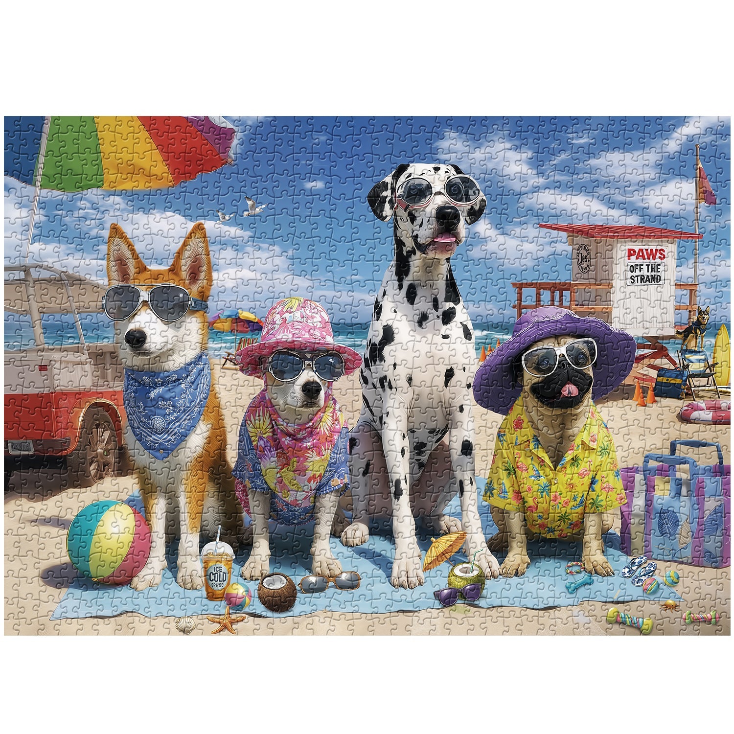 Background Elements: A vibrant rainbow umbrella, a red vintage vehicle, and a lifeguard stand (with the sign "PAWS OFF THE STRAND") add whimsy and context to the coastal setting.