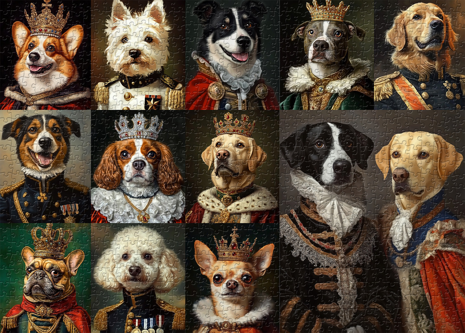 Reichhaltiger Charakterinhalt:Das Bild zeigt eine Sammlung fein detaillierter Hundeporträts, wobei jeder Hund in königlicher oder militärischer Kleidung gekleidet ist, die Persönlichkeit, Status und Charme hervorhebt.