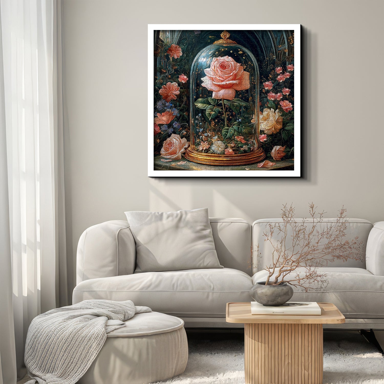 Kleinere Blumen und Blätter im Inneren der Cloche: Im Inneren der Cloche befinden sich neben der Hauptrose kleinere Blüten und üppiges grünes Blattwerk, was die detaillierte und lebendige Komposition unterstreicht.