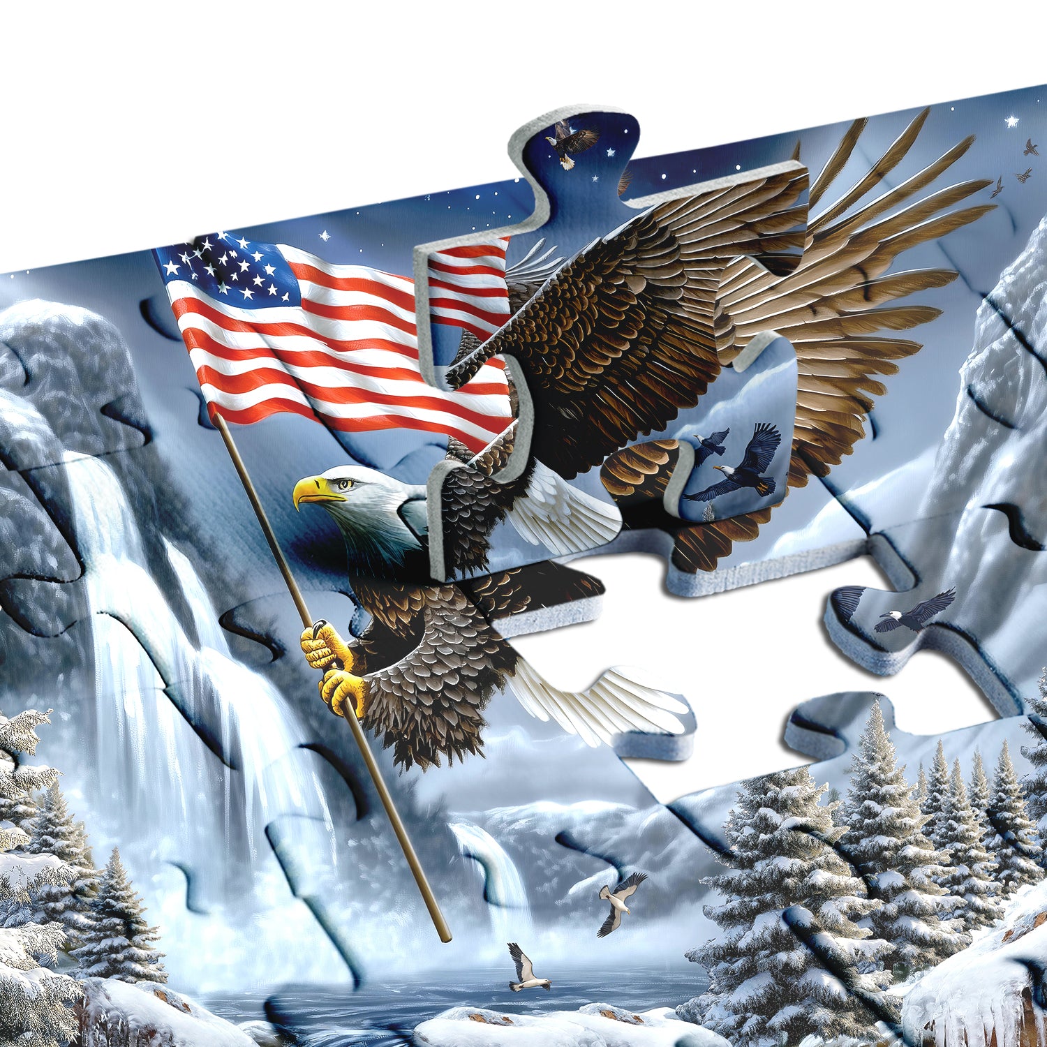 American Flag: The vibrant American flag, with its iconic stars and stripes, is prominently held by the eagle, fluttering against the wintry backdrop.