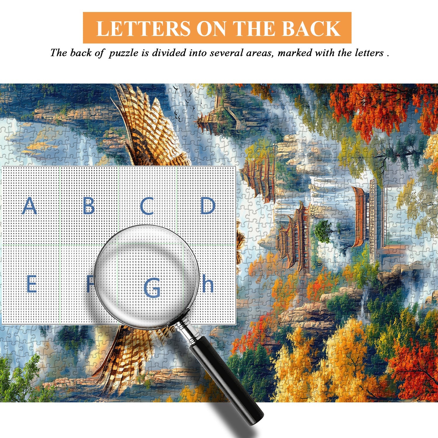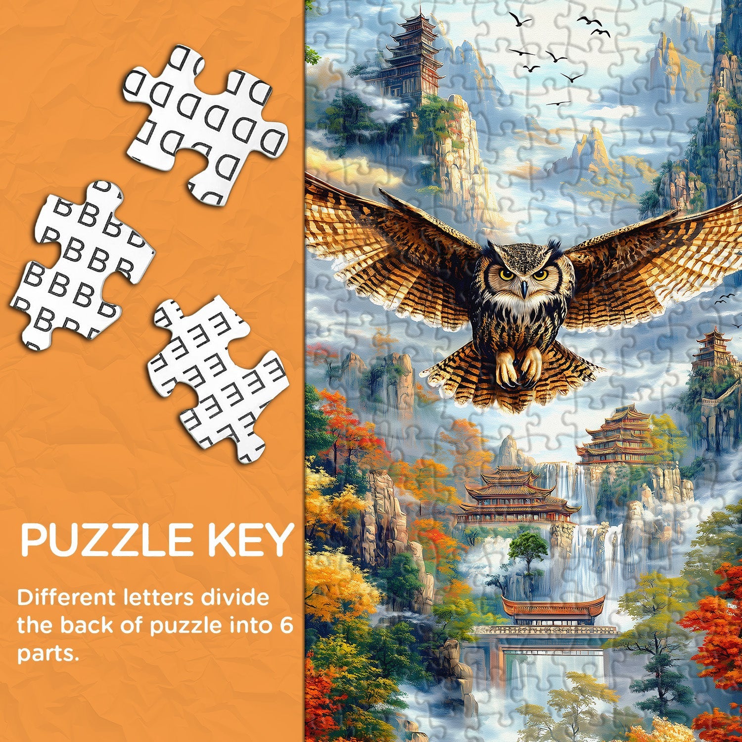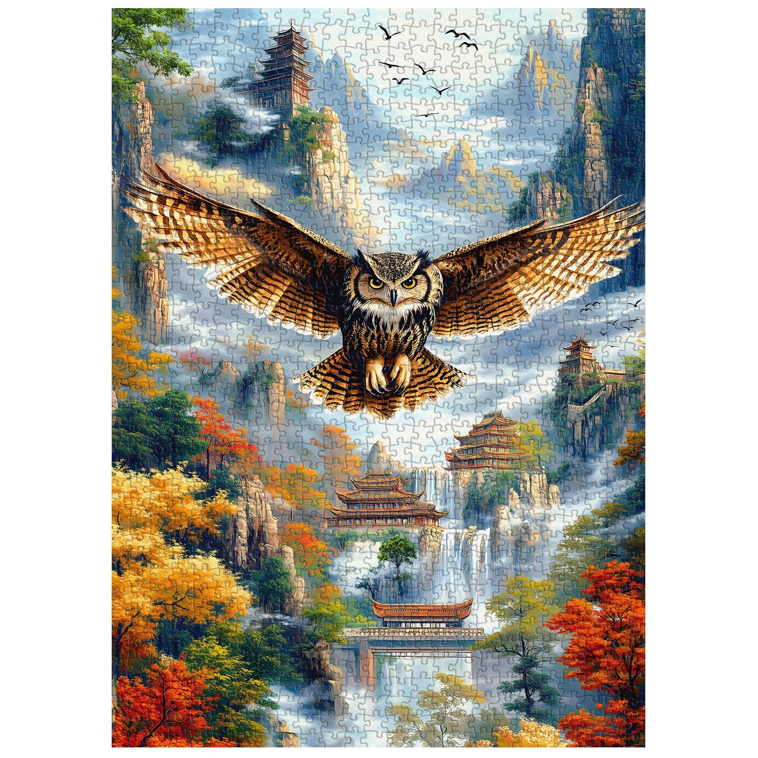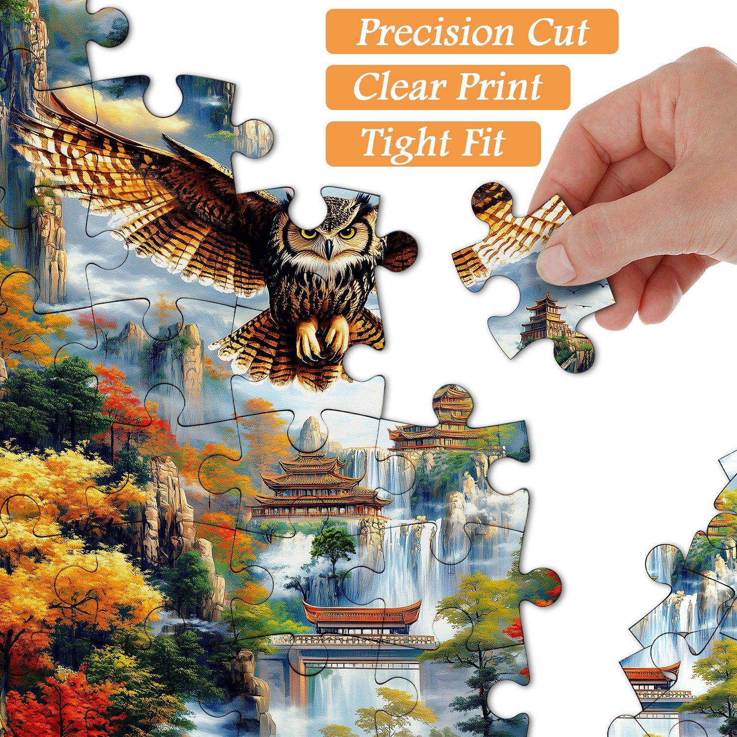 Stunning Artistic Vision: Immerse yourself in a breathtaking blend of Eastern landscape painting and wildlife art, featuring a majestic owl soaring above mist-shrouded mountains, ancient pagodas, and vibrant autumn foliage. Every piece reveals intricate details and rich, atmospheric colors that bring this fantasy scene to life.