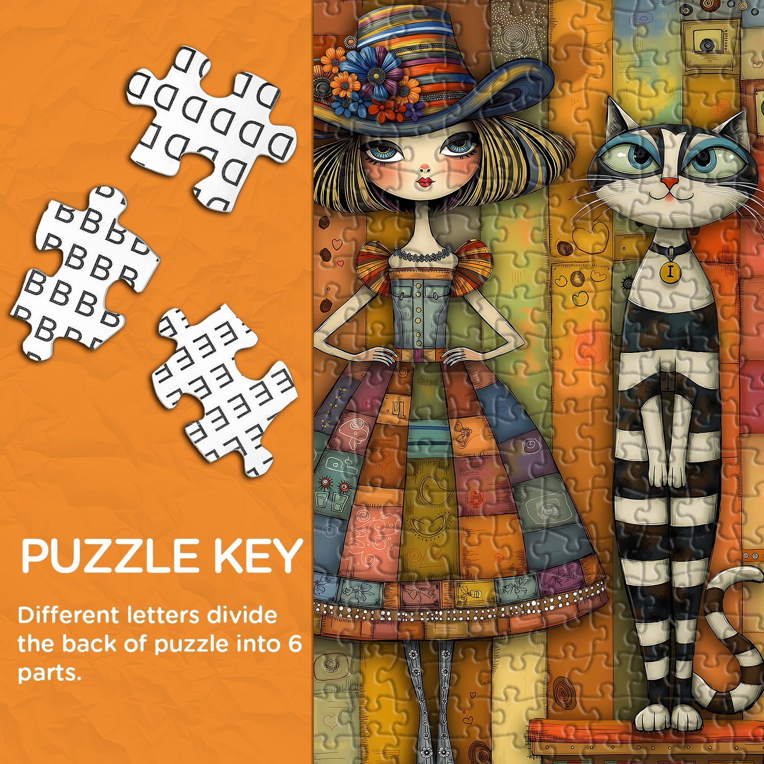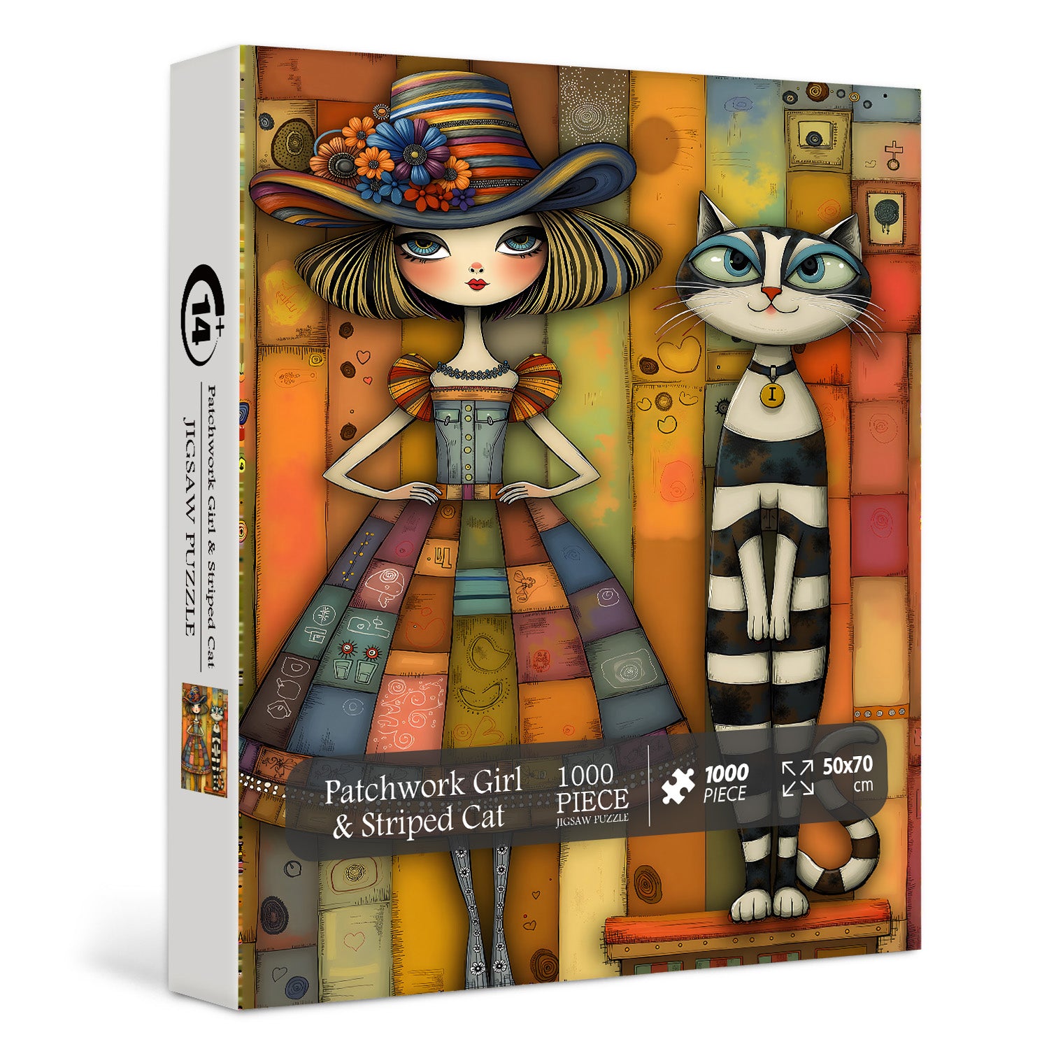 Rompecabezas de niña y gato a rayas de patchwork, 1000 piezas