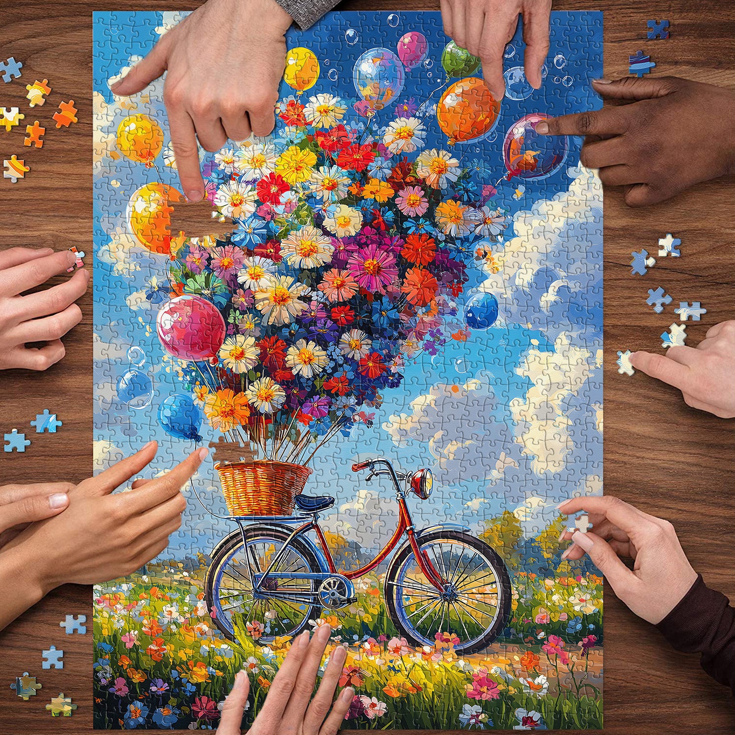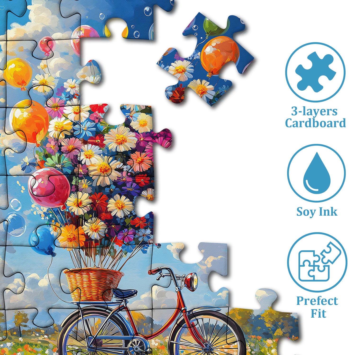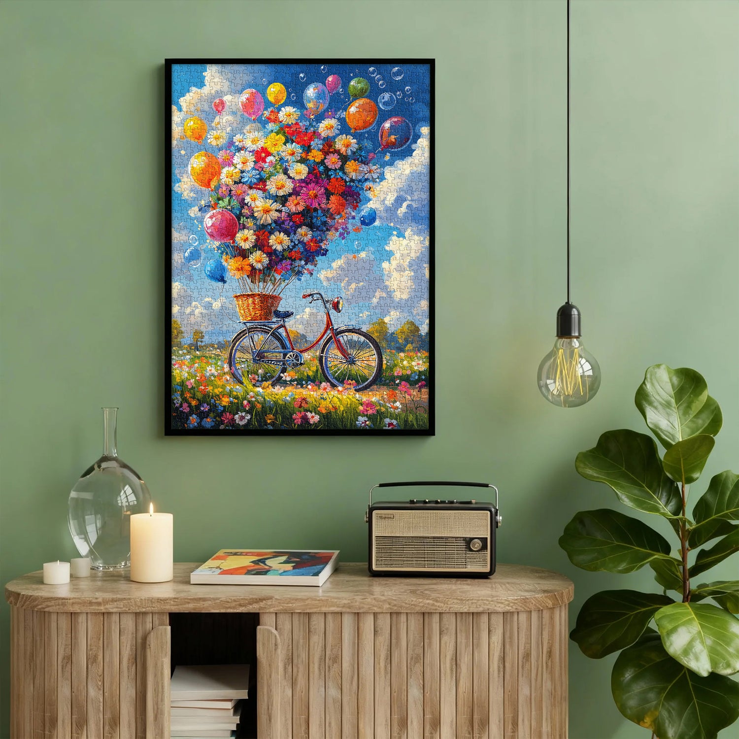 Palette de couleurs: L'image est pleine de teintes vives, dont le rouge du vélo, les fleurs multicolores (rouge, jaune, rose, bleu, etc.), les ballons colorés et le ciel bleu, créant une atmosphère joyeuse et animée.