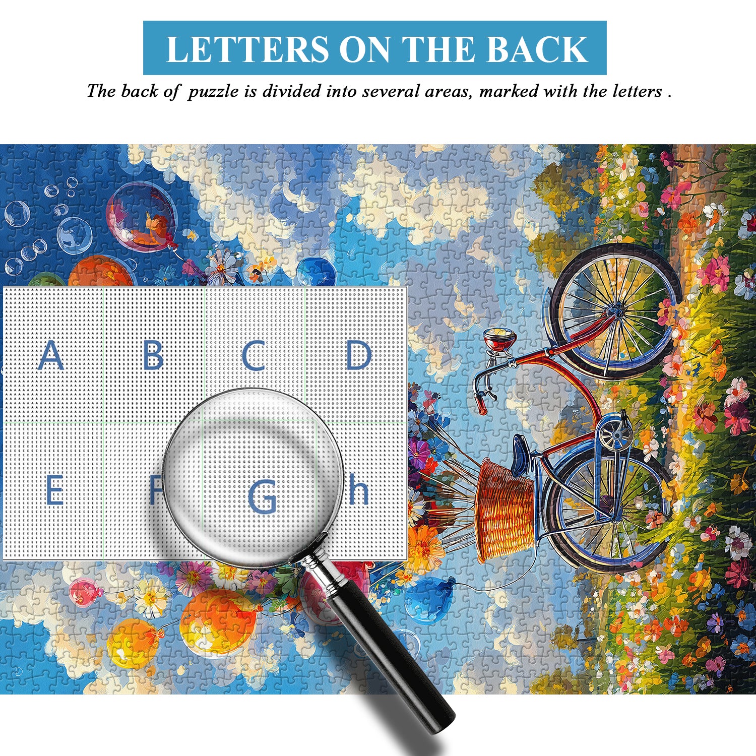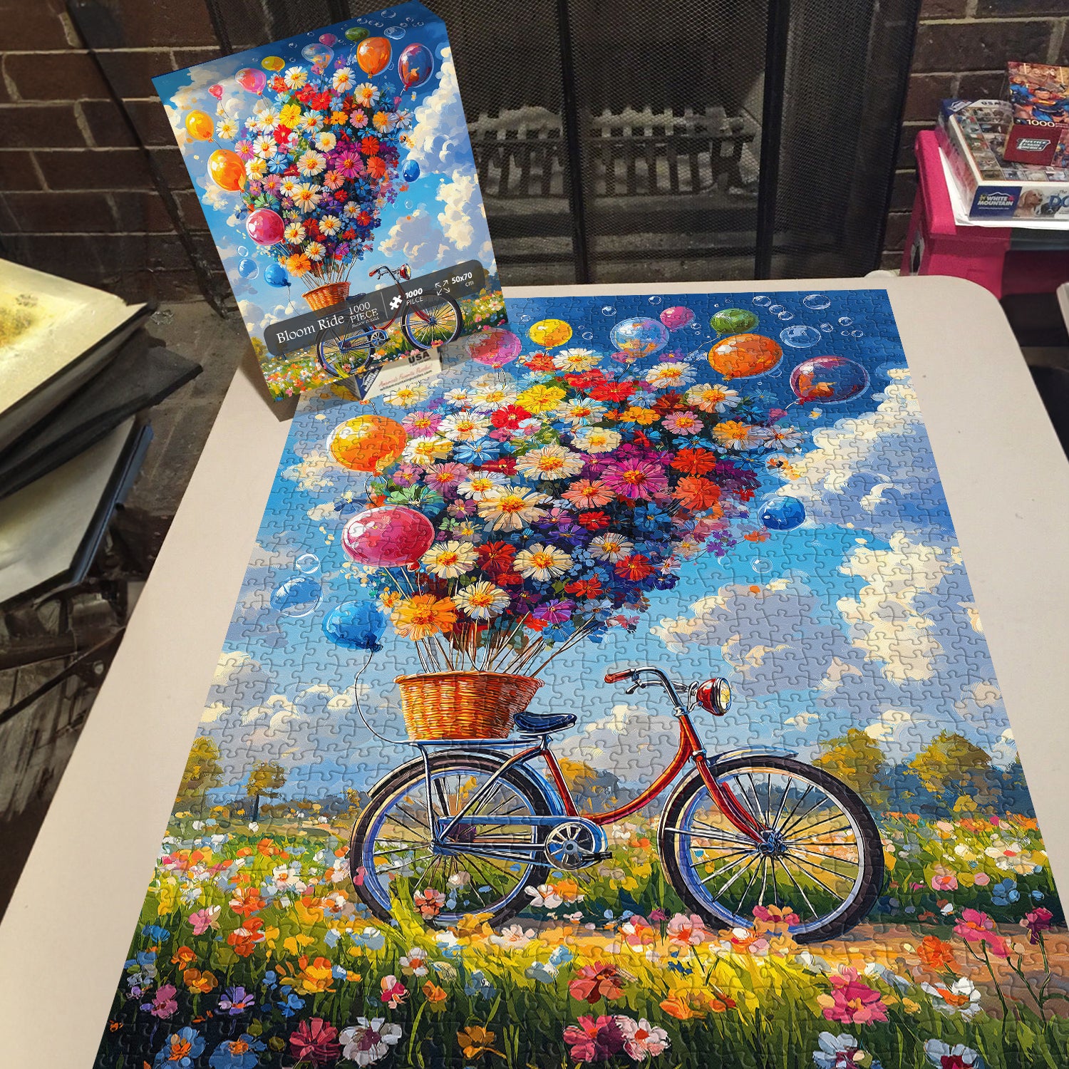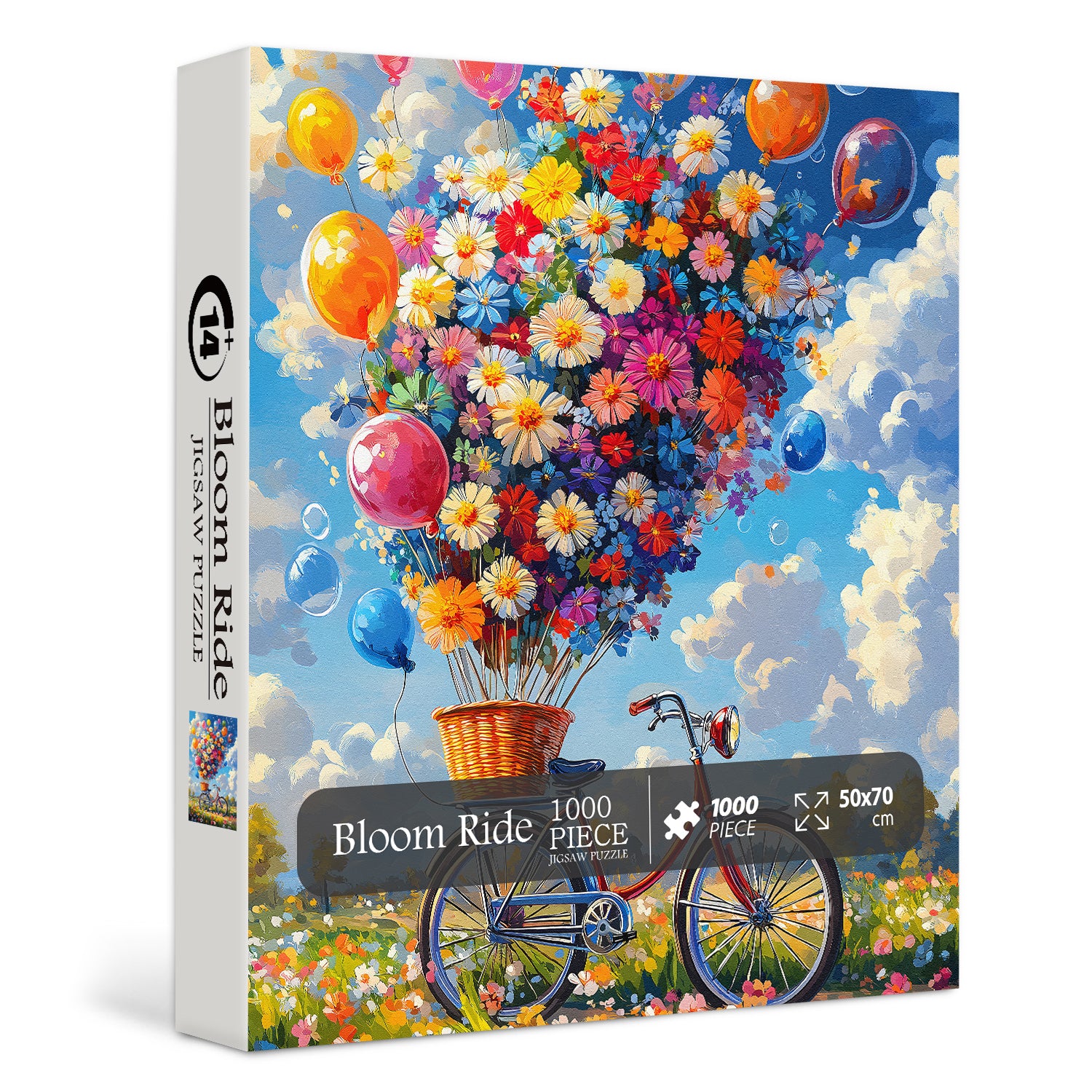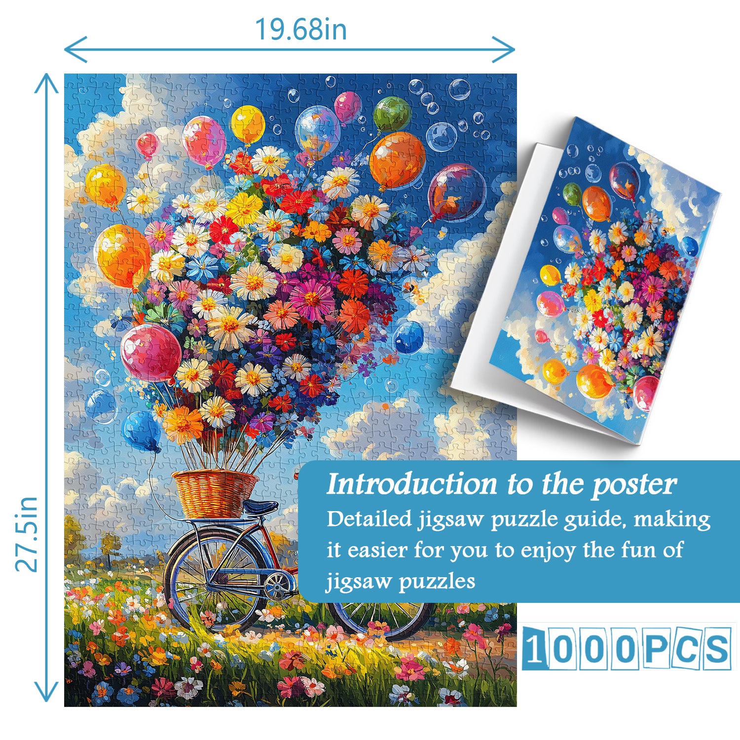 Palette de couleurs: L'image est pleine de teintes vives, dont le rouge du vélo, les fleurs multicolores (rouge, jaune, rose, bleu, etc.), les ballons colorés et le ciel bleu, créant une atmosphère joyeuse et animée.