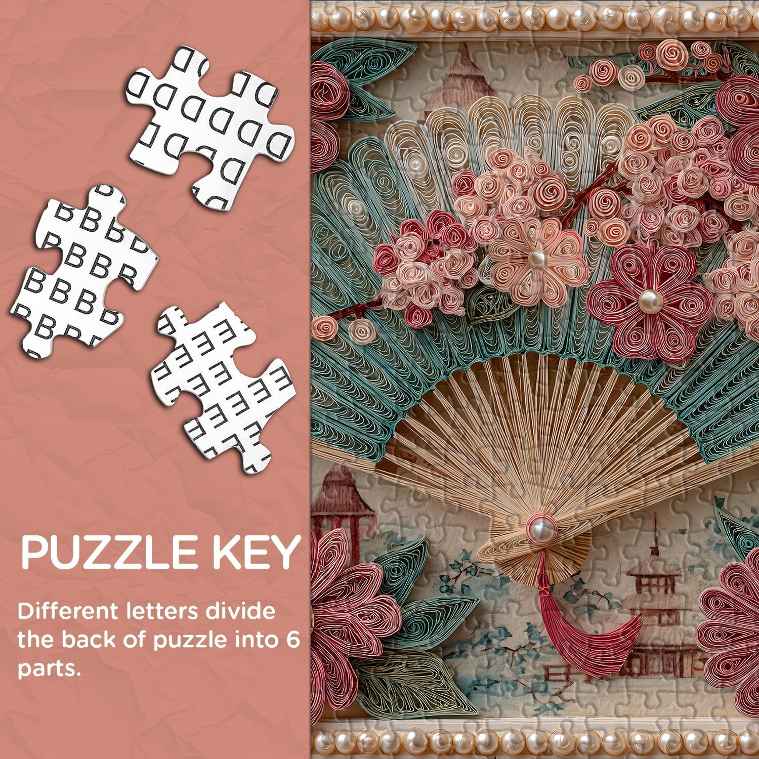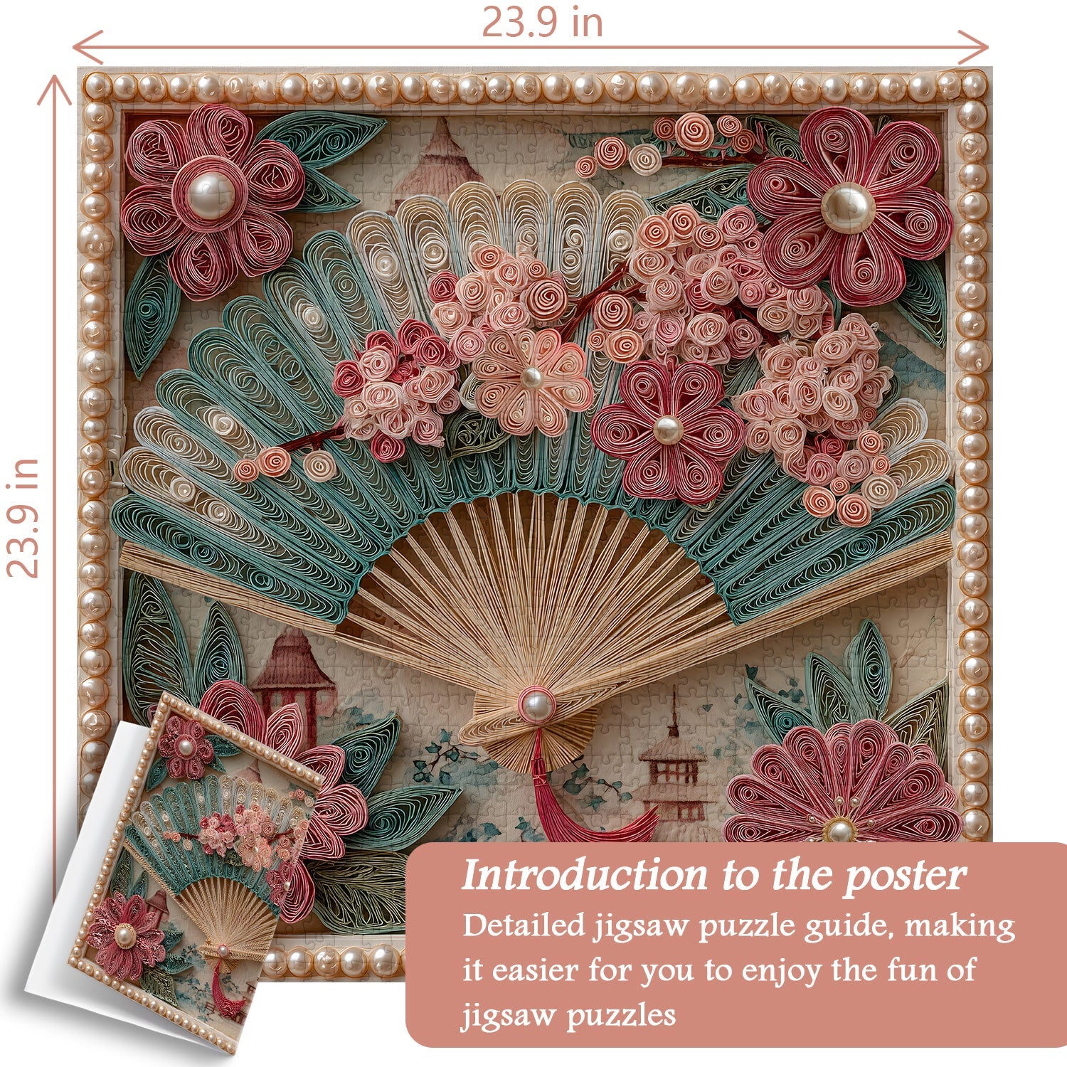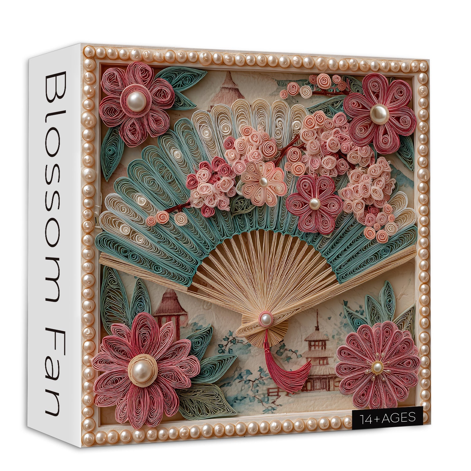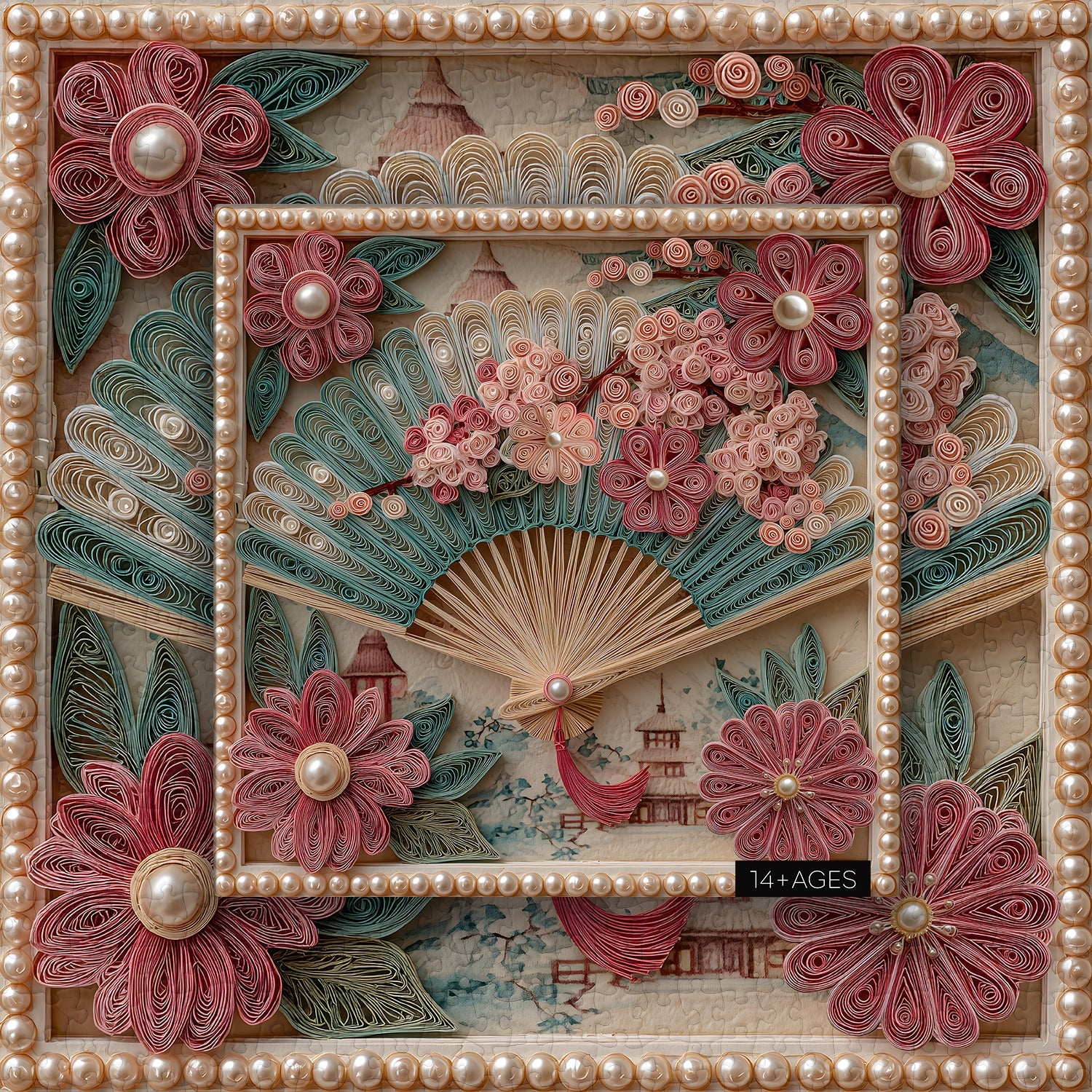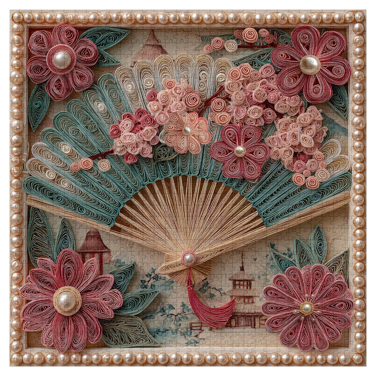 Design élégant : Un éventail décoratif magnifiquement conçu entouré de motifs floraux complexes dans des tons rose tendre et bleu sarcelle.