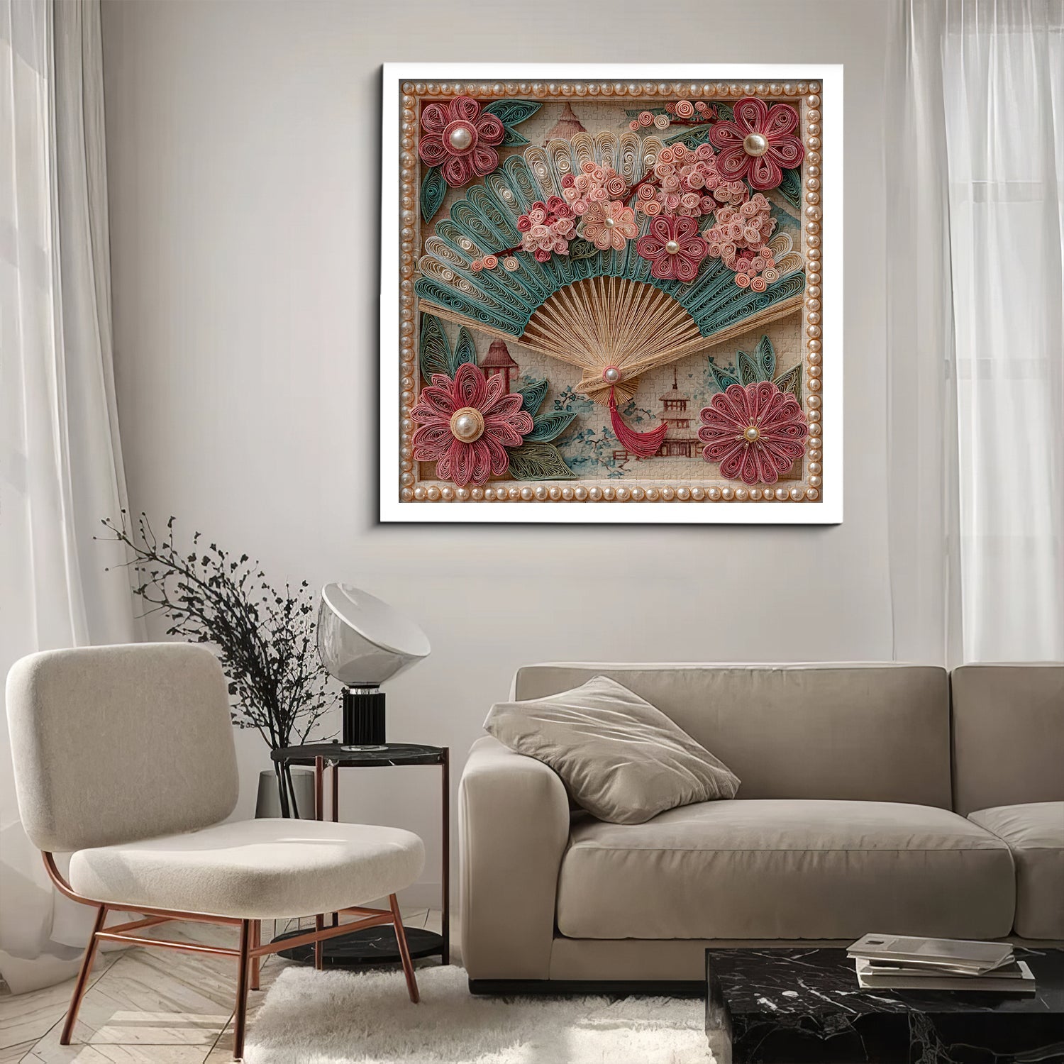 Cadre luxueux : Une bordure ornée de perles rehausse l'aspect raffiné et sophistiqué de l'œuvre.