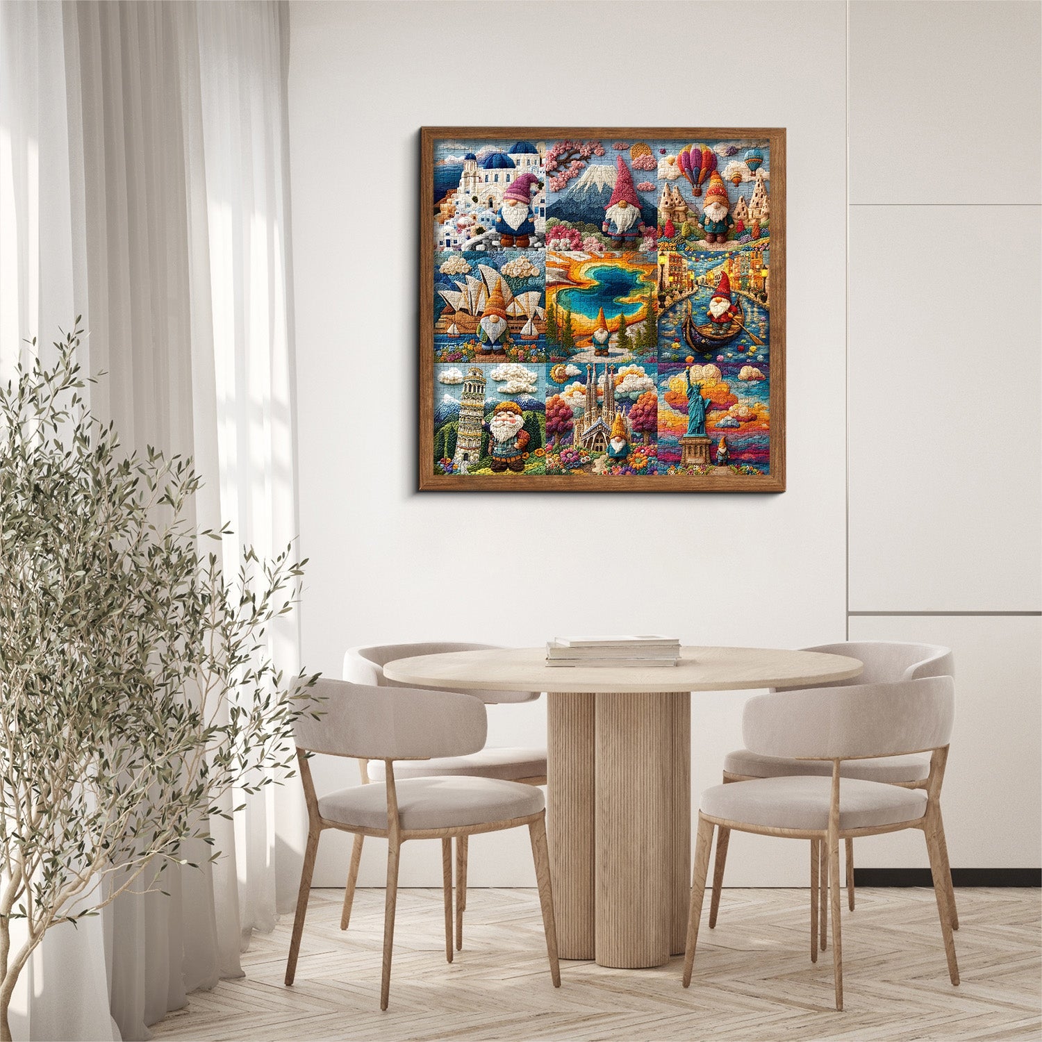 Gnomes: Divers gnomes avec des chapeaux et des tenues de différentes couleurs sont présentés dans chaque section, agissant comme de jolis guides pour différentes scènes.