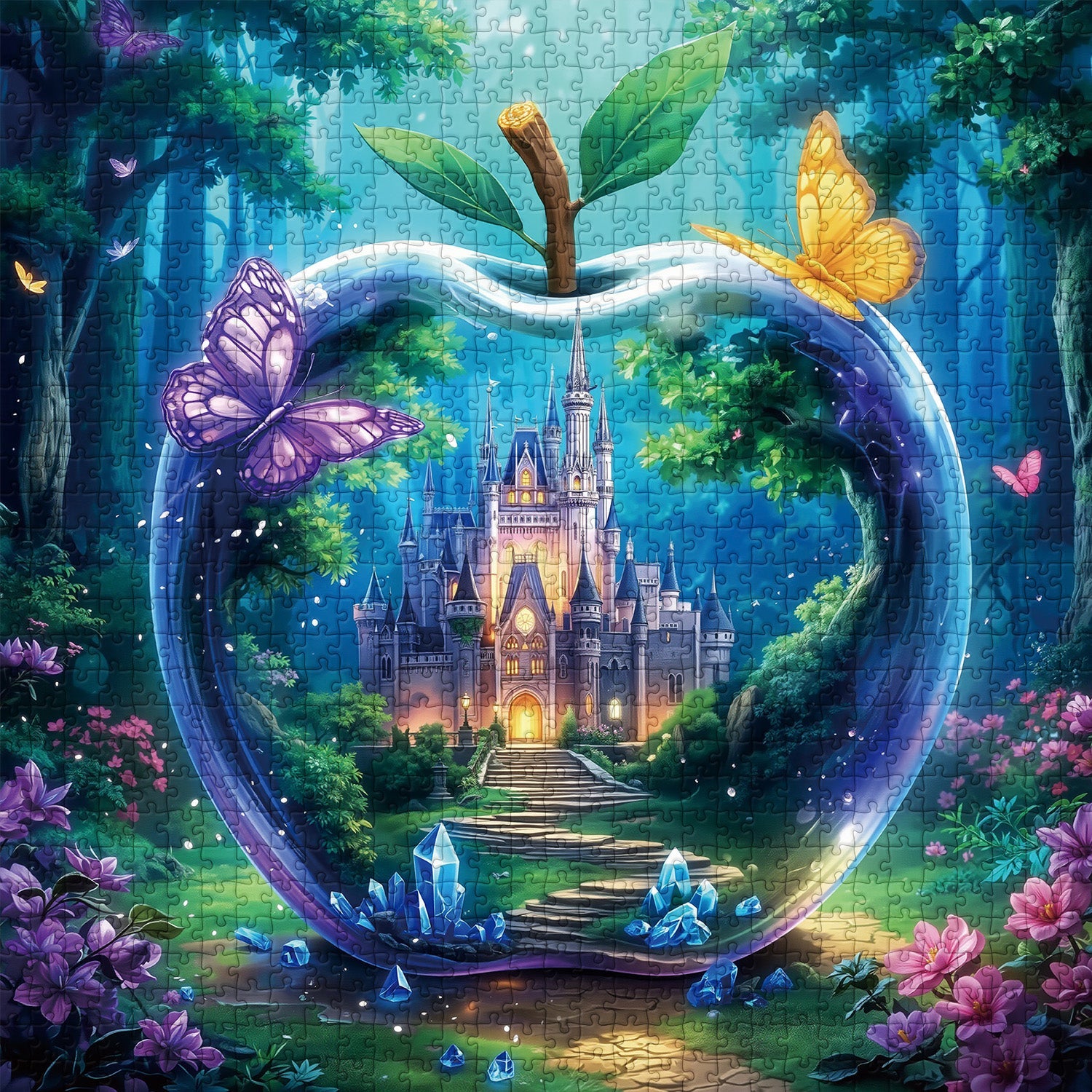 Pomme de cristal enchantée avec intérieur du château: Une grosse pomme violette translucide (en forme de cœur) sert de contenant à un grand château de conte de fées illuminé, mêlant éléments magiques et naturels.