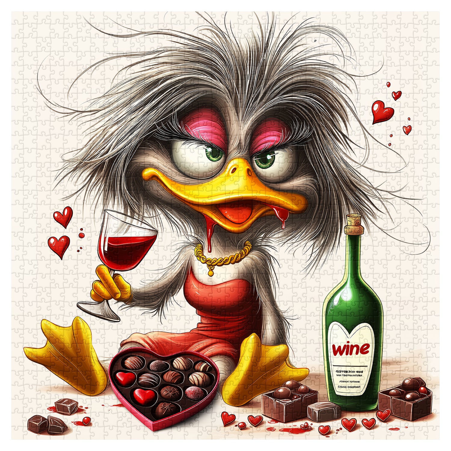 😉🧩Détails et humour: Le canard a une expression quelque peu exagérée et humoristique, avec des taches rouges (peut-être du vin) autour de son bec, ajoutant une ambiance ludique et légèrement chaotique aux éléments à thème romantique.