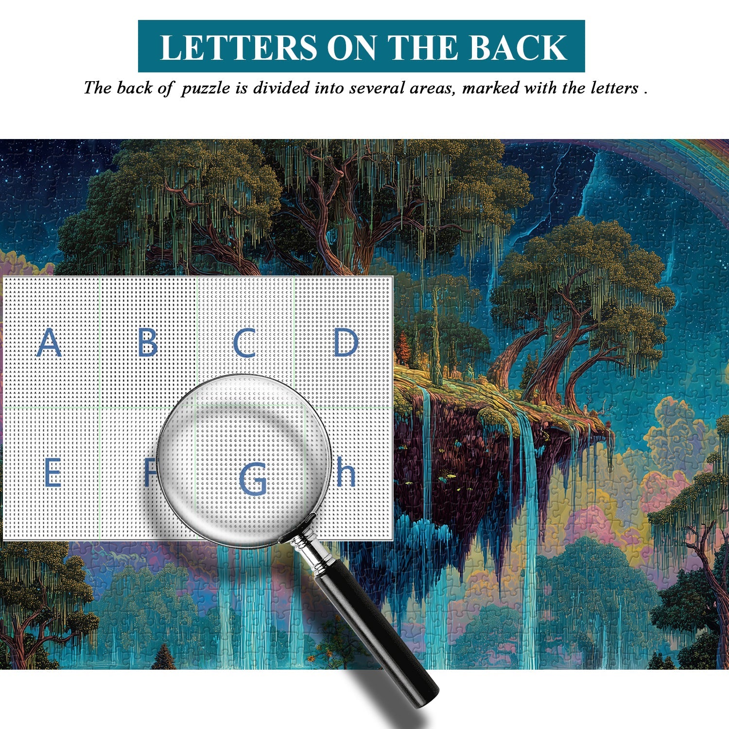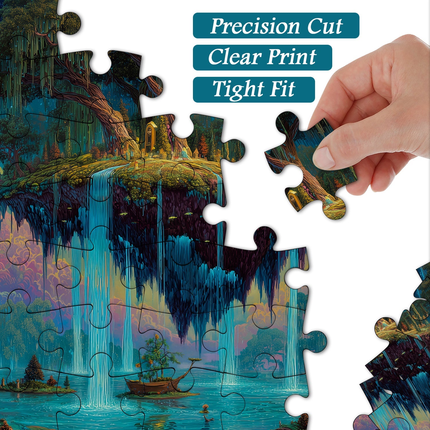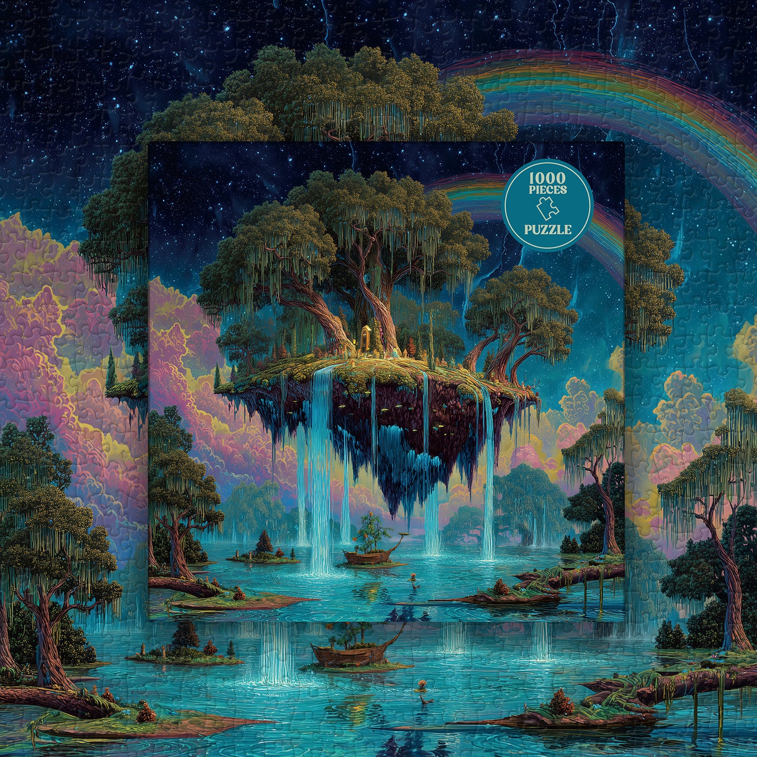Palette de couleurs vives: La pièce utilise un mélange de bleus profonds (ciel/eau), de verts émeraude (feuillage), d'or chauds (la petite structure) et de pastels doux (nuages) pour équilibrer l'obscurité mystique avec une luminosité éthérée.