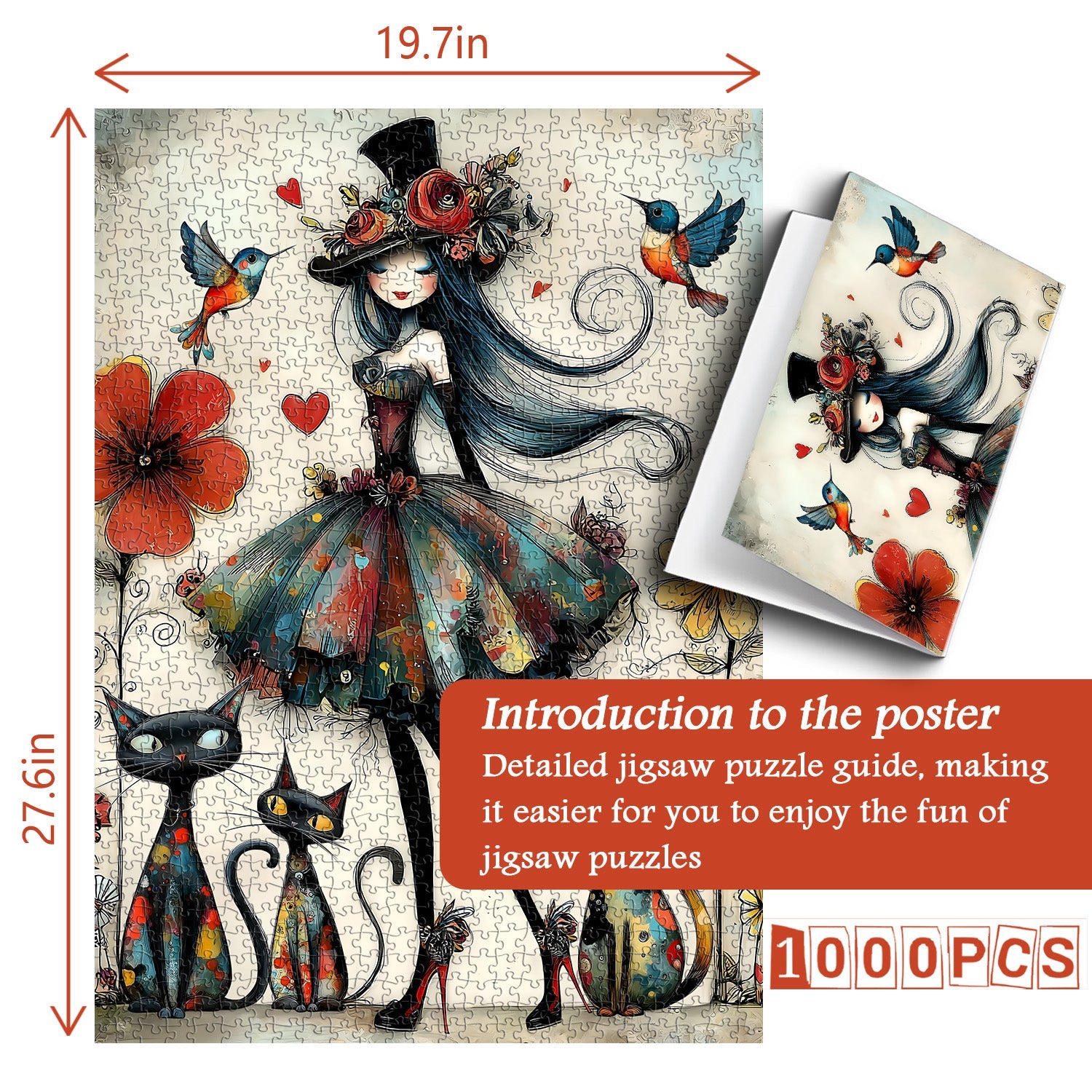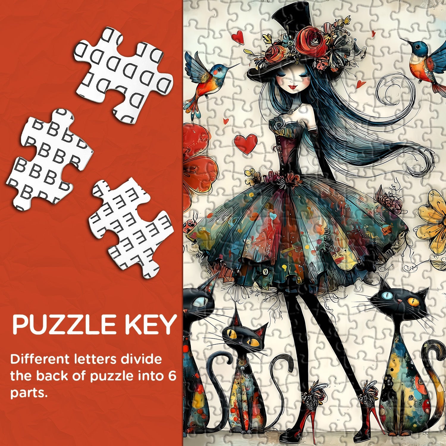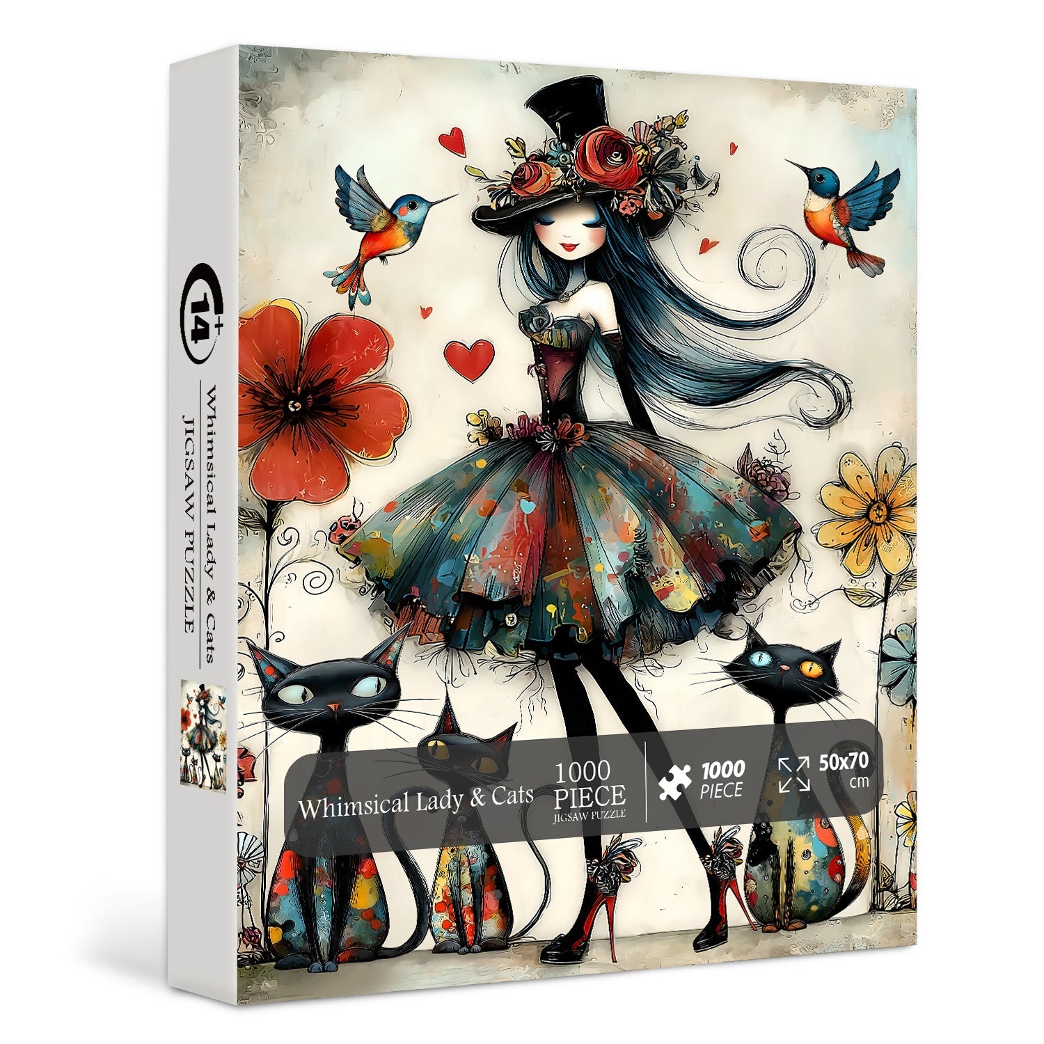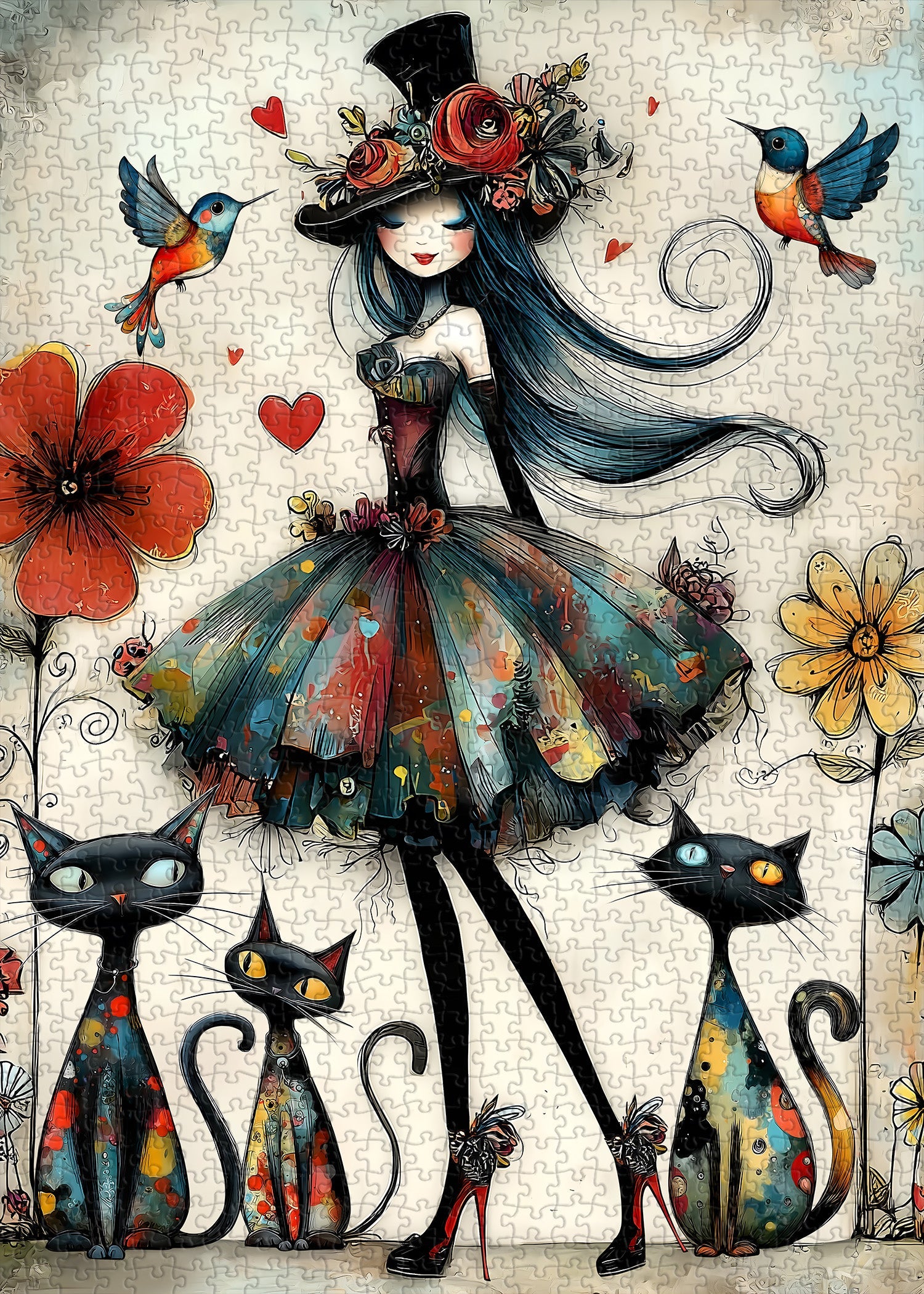 Art bohème-chic fantaisiste Mélange captivant de style bohème et de fantaisie sombre, ce puzzle présente une dame élégante avec un chapeau fleuri, des chats vibrants et des colibris, créant un visuel unique et artistiquement expressif qui se démarque des puzzles standards.