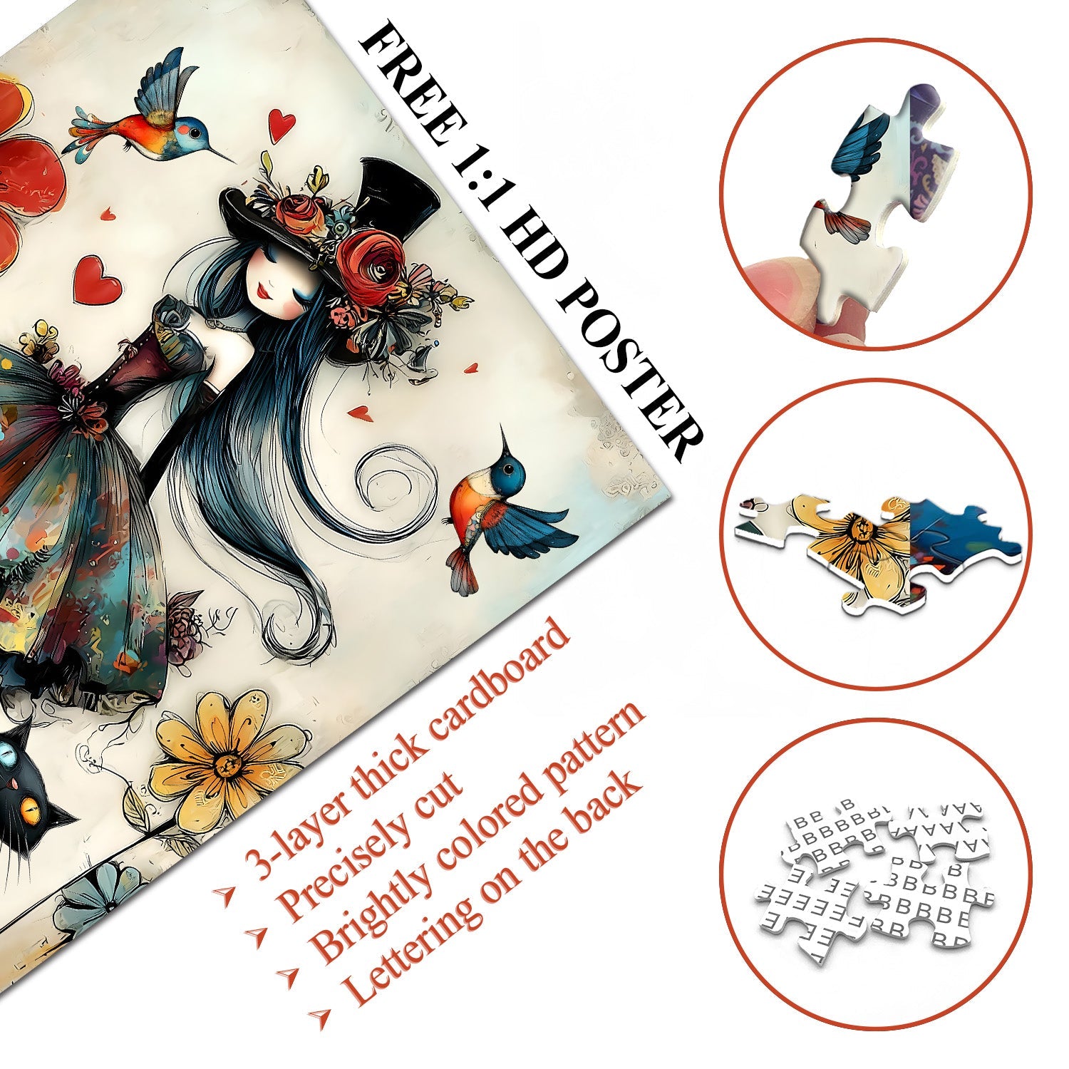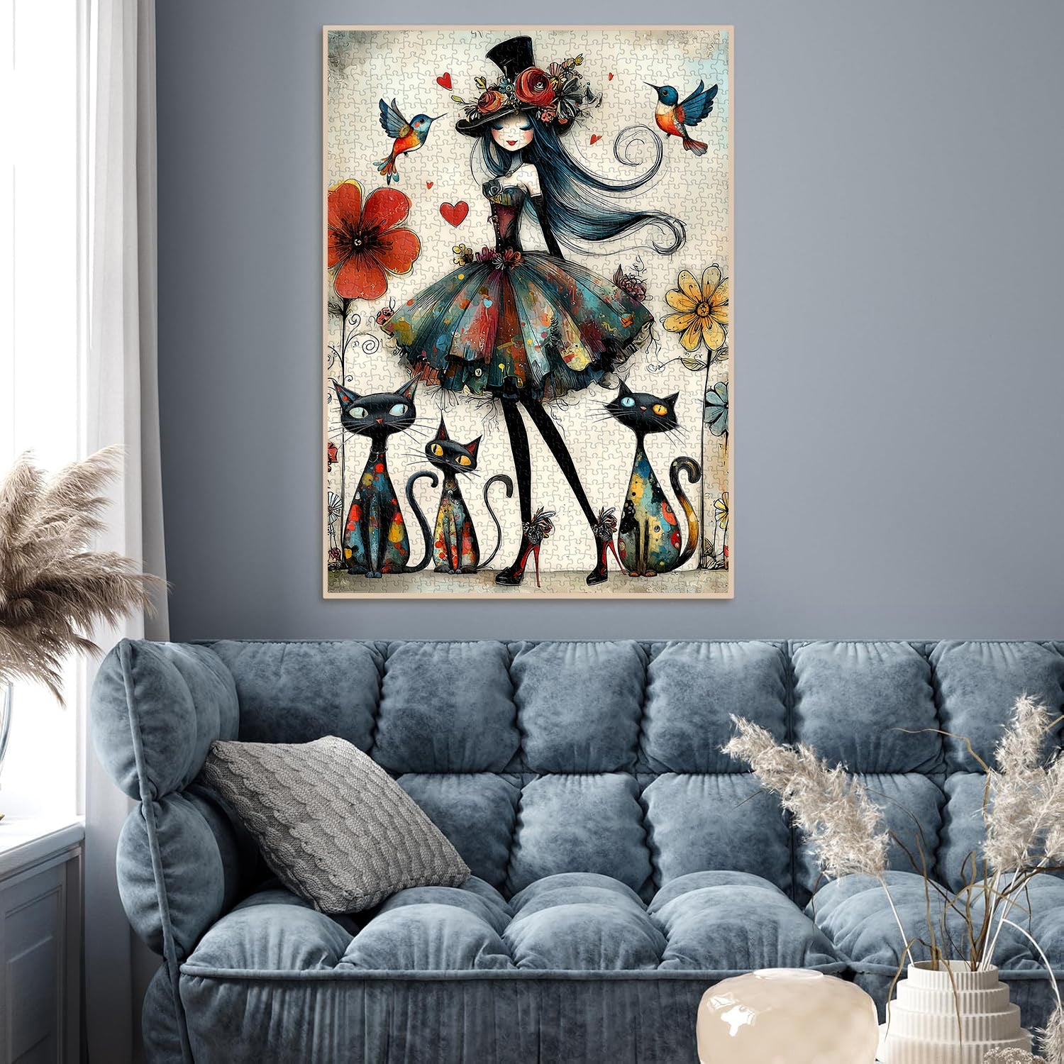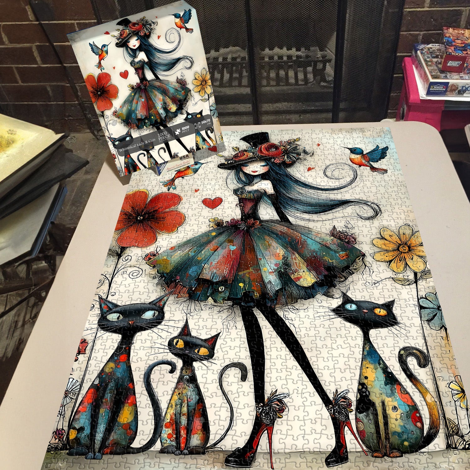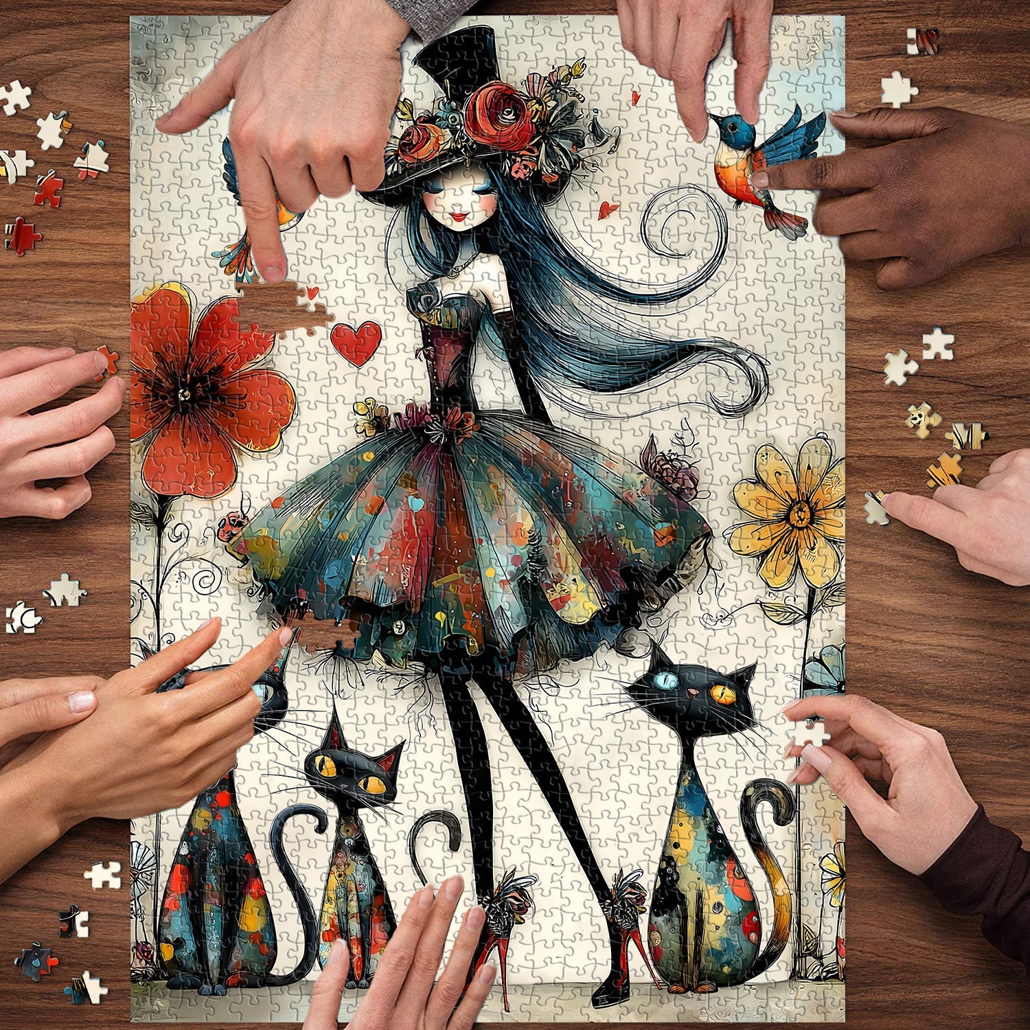 Art bohème-chic fantaisiste Mélange captivant de style bohème et de fantaisie sombre, ce puzzle présente une dame élégante avec un chapeau fleuri, des chats vibrants et des colibris, créant un visuel unique et artistiquement expressif qui se démarque des puzzles standards.