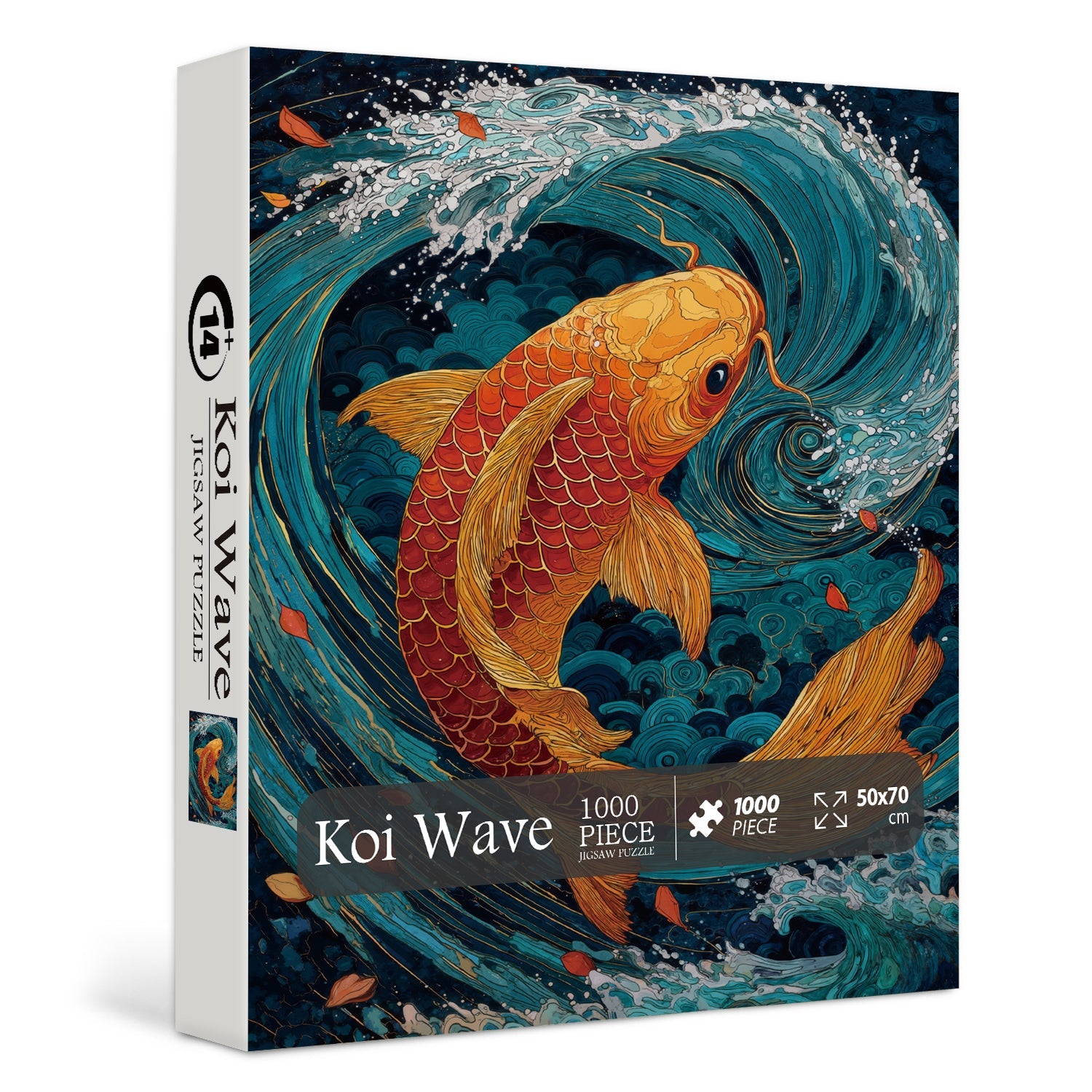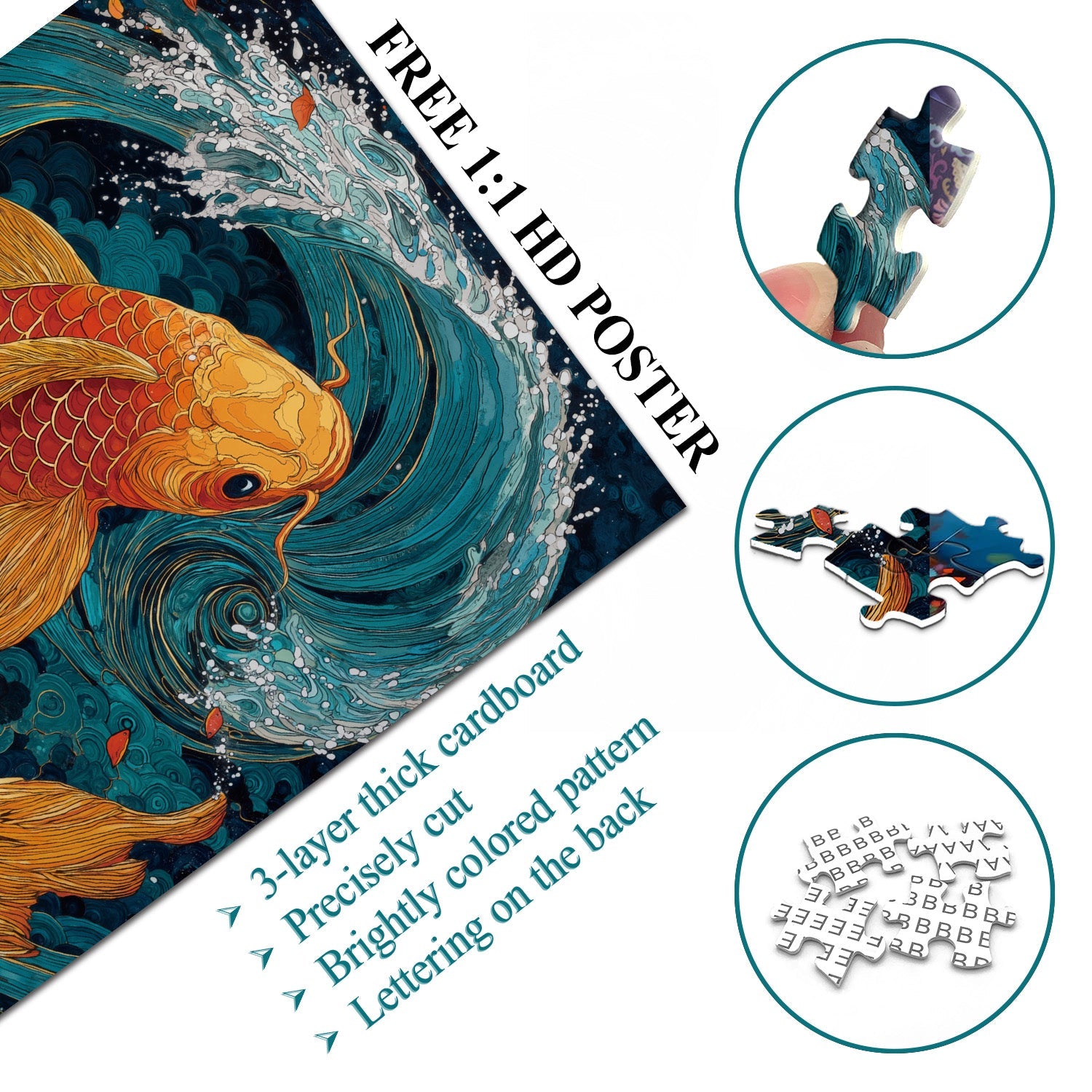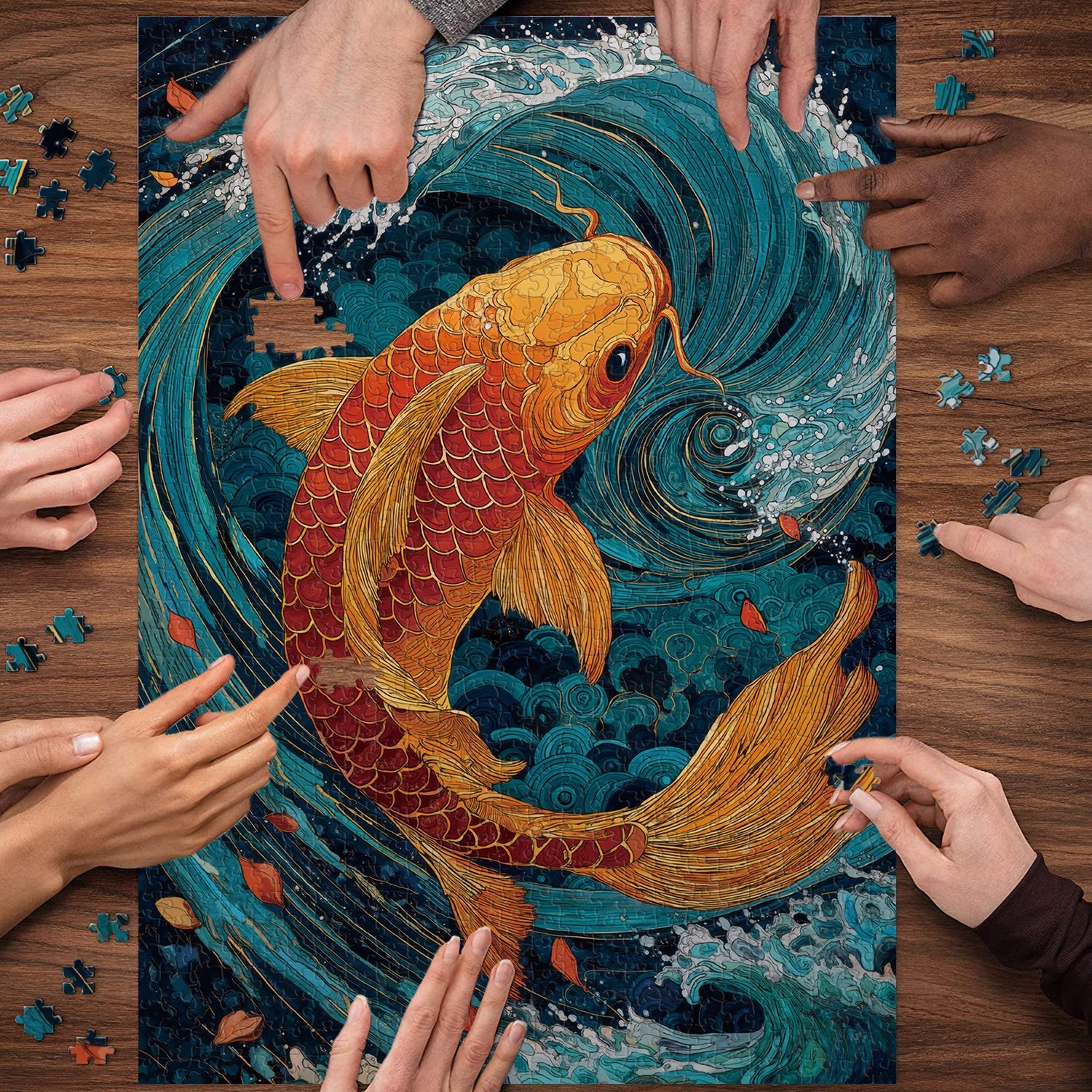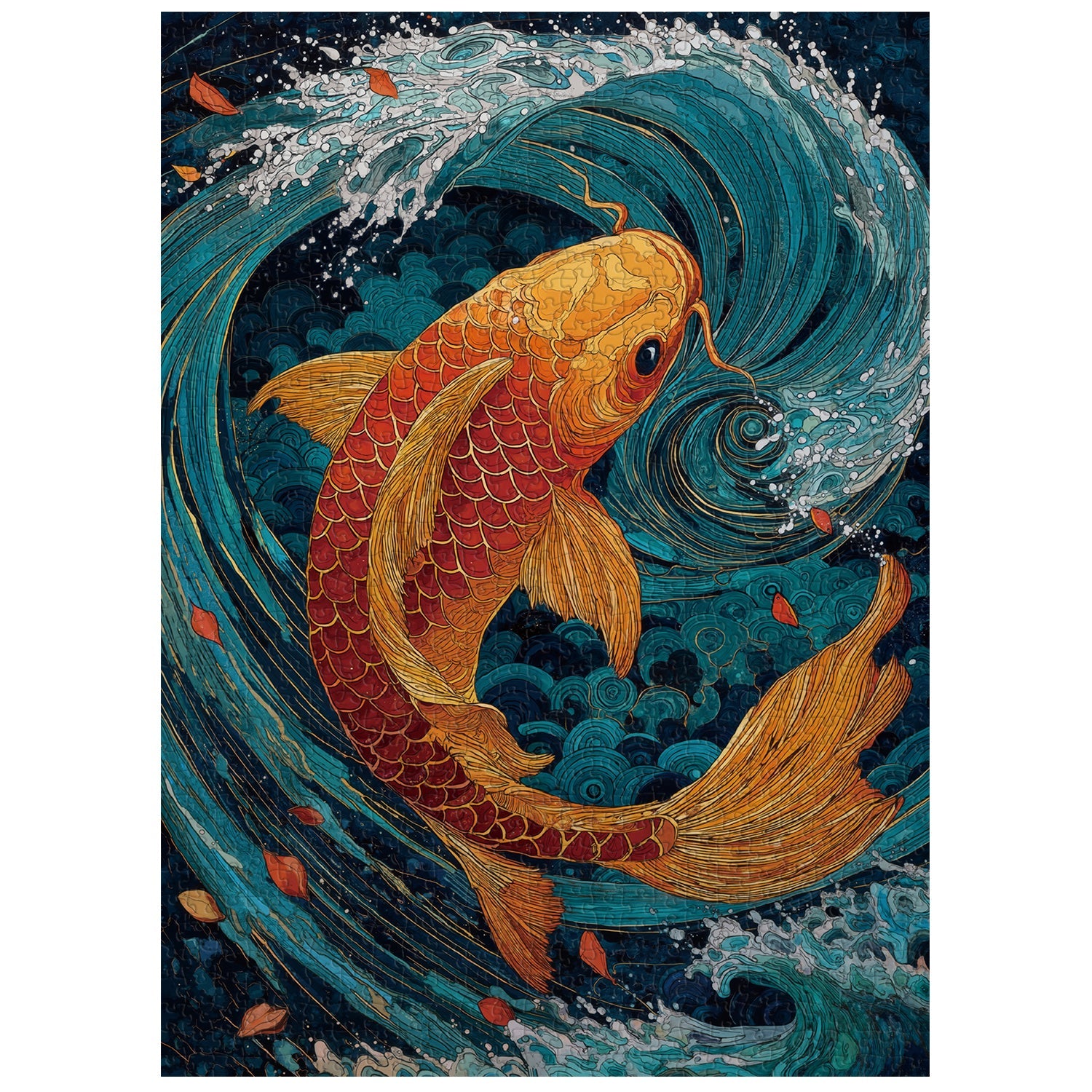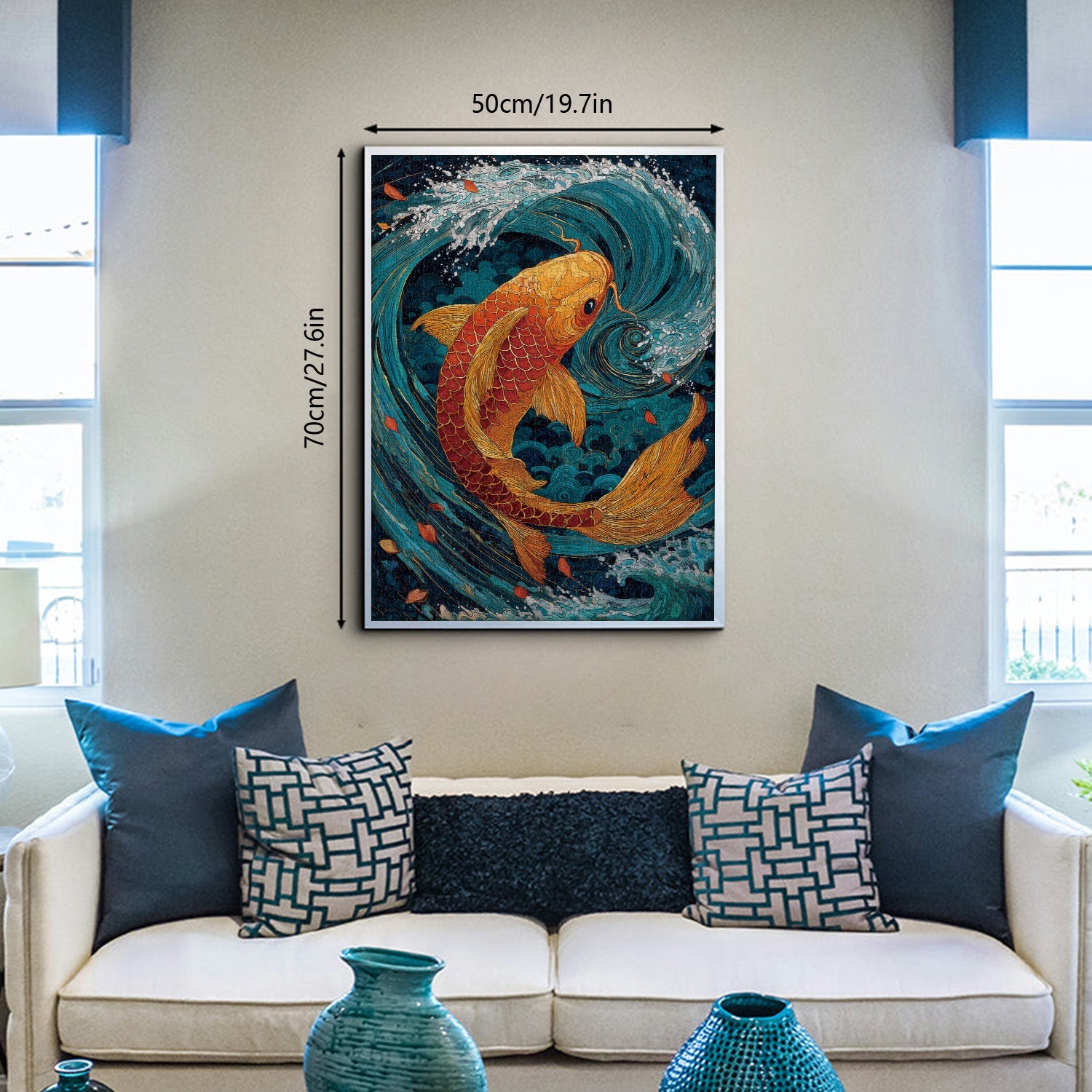 Palette de couleurs: La pièce utilise un contraste saisissant de or/rouge chaud (koi) et bleu sarcelle/marine froid (vagues), avec de subtils détails en noir et blanc (mousse, fond) pour souligner le dynamisme du sujet.