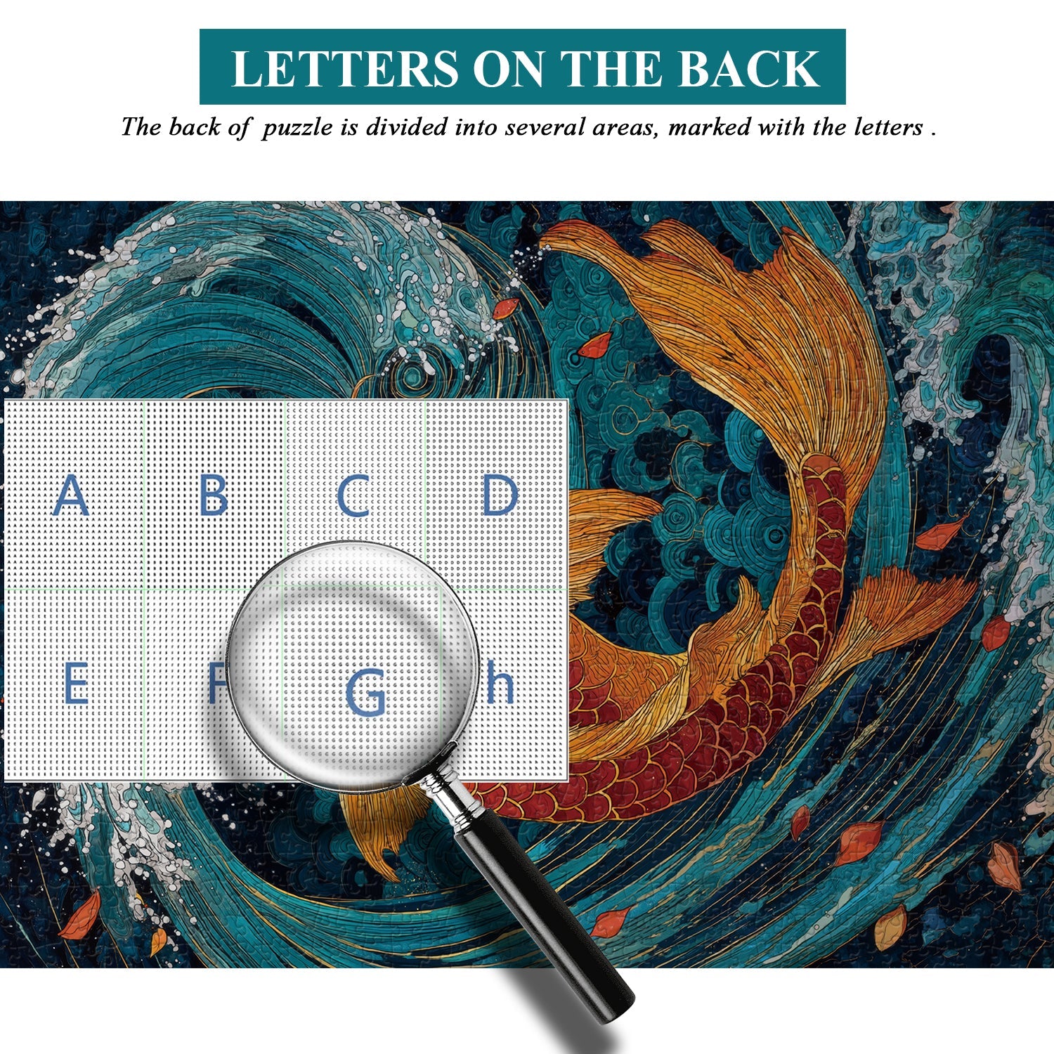 Éléments symboliques: Les feuilles flottantes rouges/brunes ajoutent une subtile touche saisonnière, tandis que le motif koi et vague évoque les thèmes de résilience et bonne fortune (commun dans le symbolisme de l'Asie de l'Est).