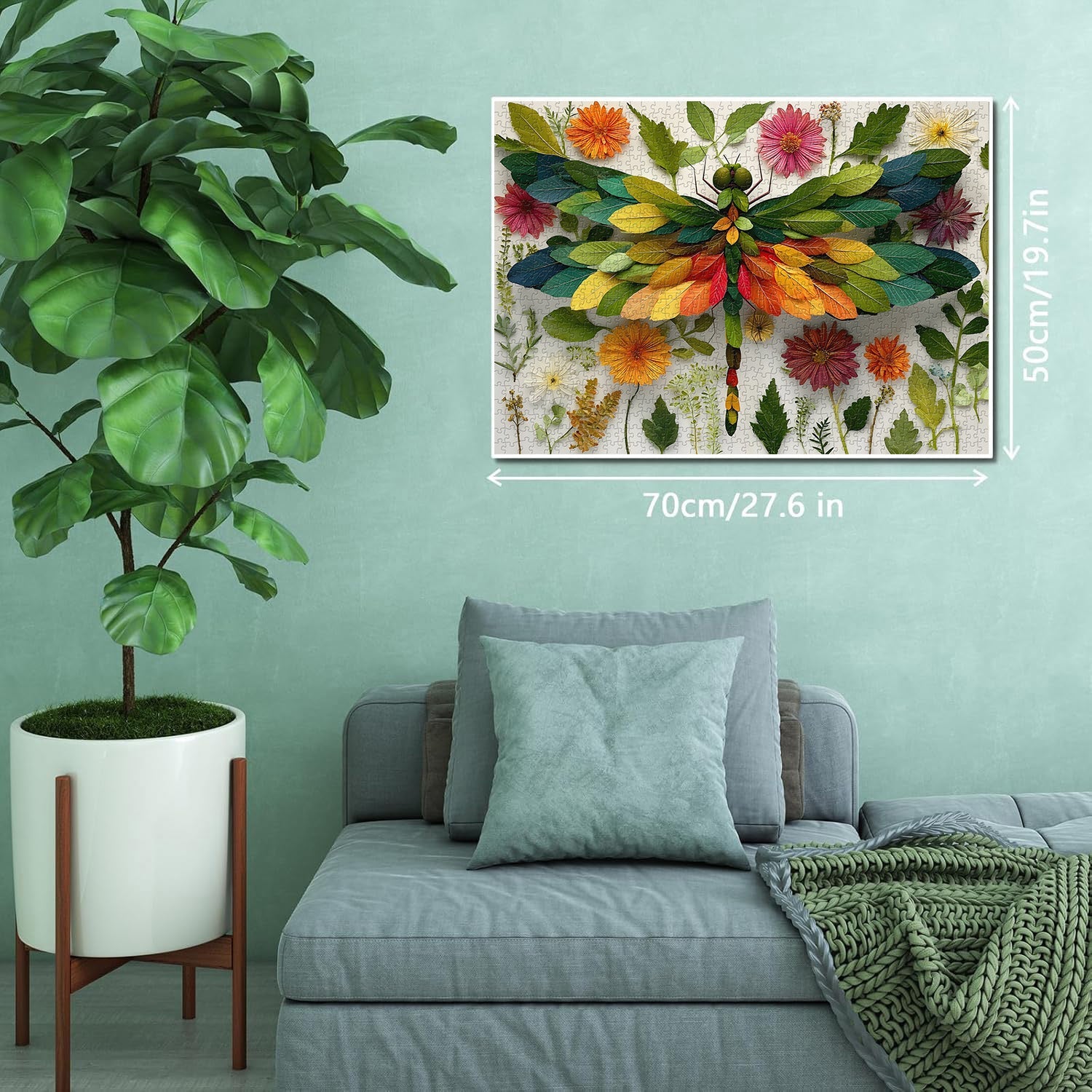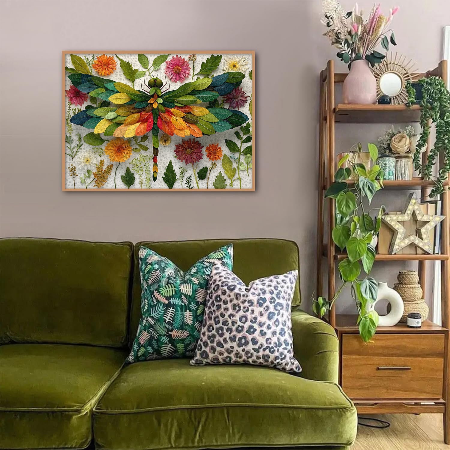 Détails texturés et superposés: La libellule et la flore environnante présentent des textures détaillées et des éléments superposés, mettant l'accent sur le savoir-faire et l'utilisation de matériaux naturels dans la composition.