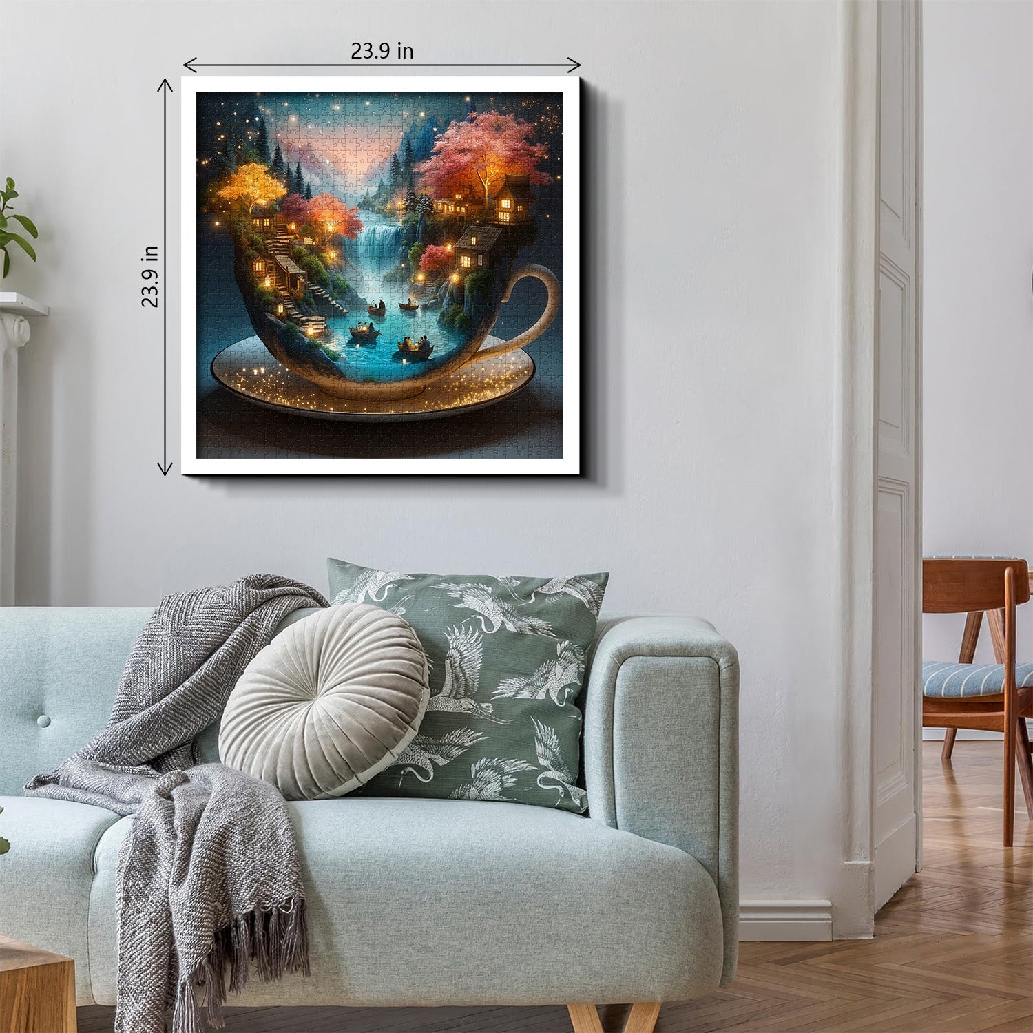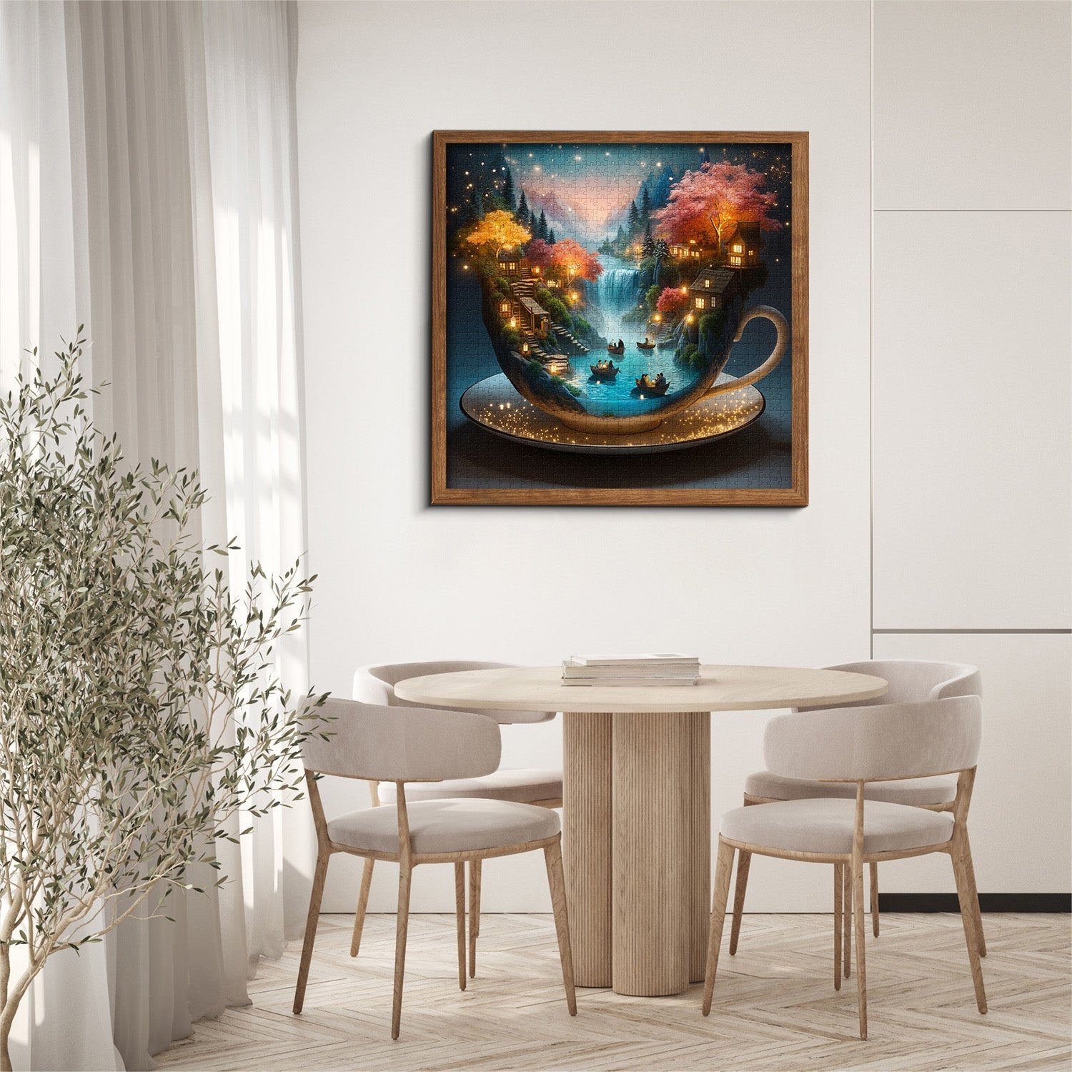 Contraste d'échelle fantaisiste: La tasse à thé géante (avec une soucoupe réaliste) encadre le petit village détaillé, mettant en valeur la fusion surréaliste et onirique d'objets du quotidien et d'un paysage fantastique.