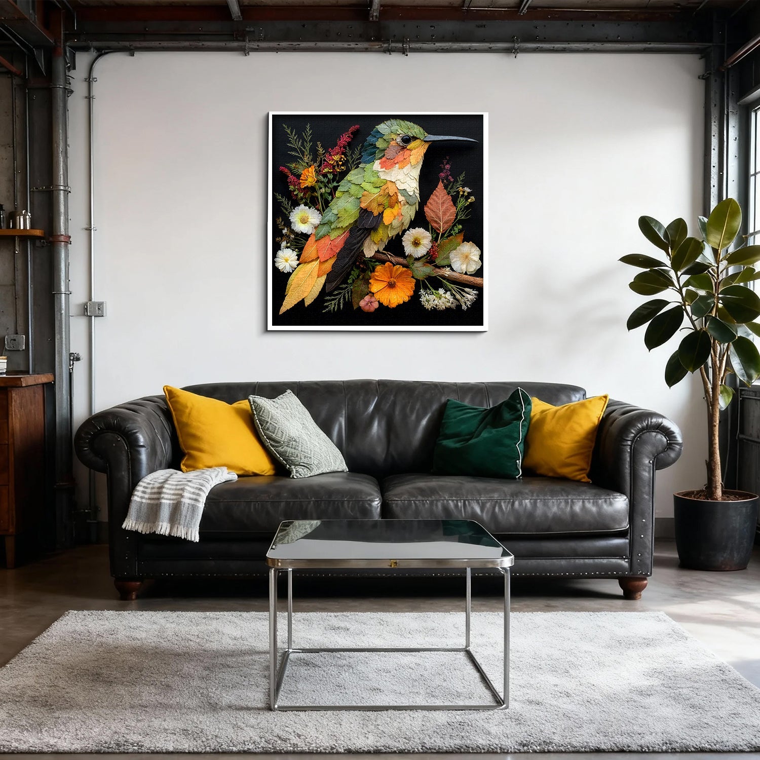 Détails superposés complexes: Les « plumes » des feuilles se chevauchent soigneusement pour reproduire la forme élégante du colibri, tandis que de petits détails (comme une feuille sombre pour la queue) ajoutent de la profondeur et du réalisme.