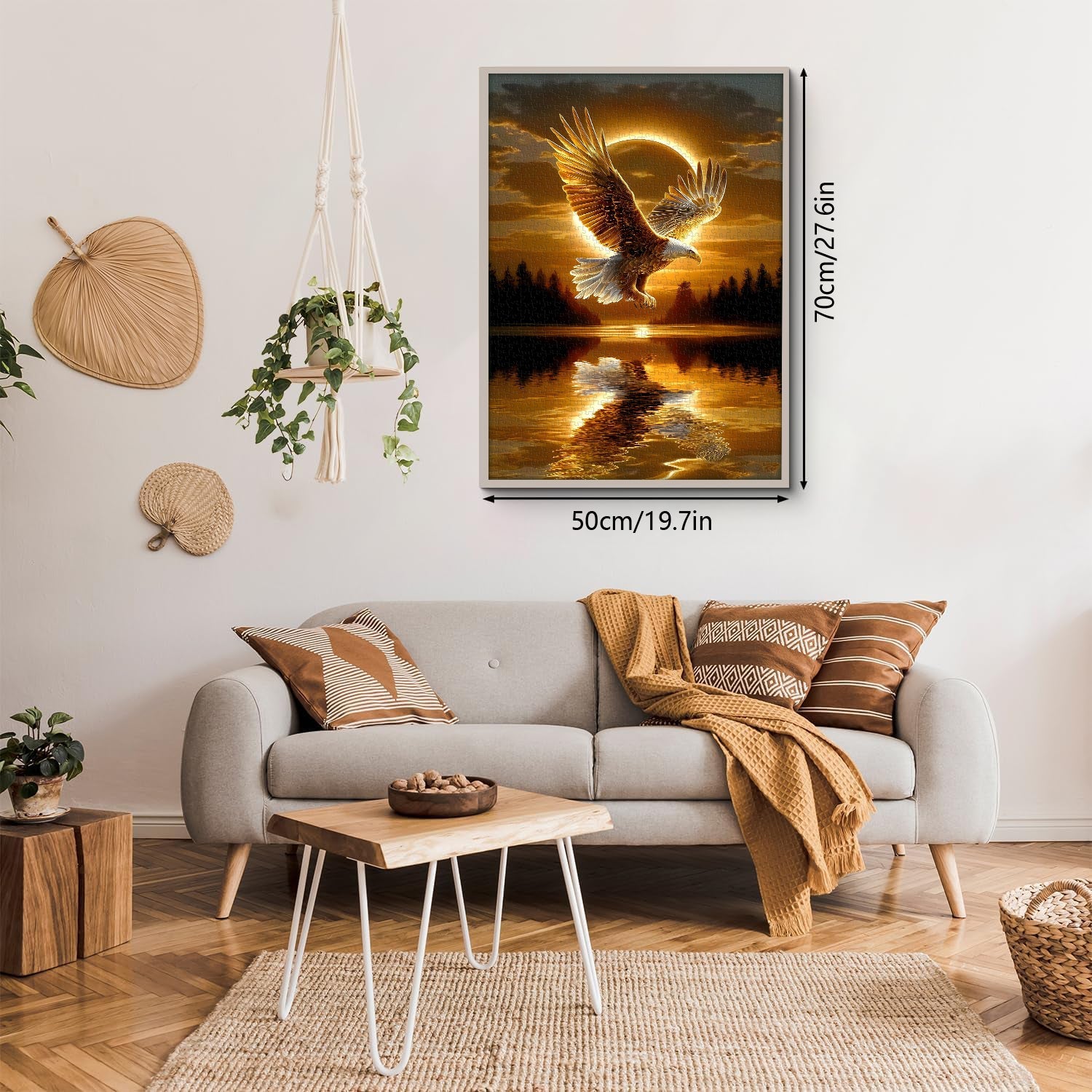 Réflexion: L'aigle et le corps céleste se reflètent vivement dans l'eau calme et ondulante en contrebas, créant un effet visuel symétrique et harmonieux.
