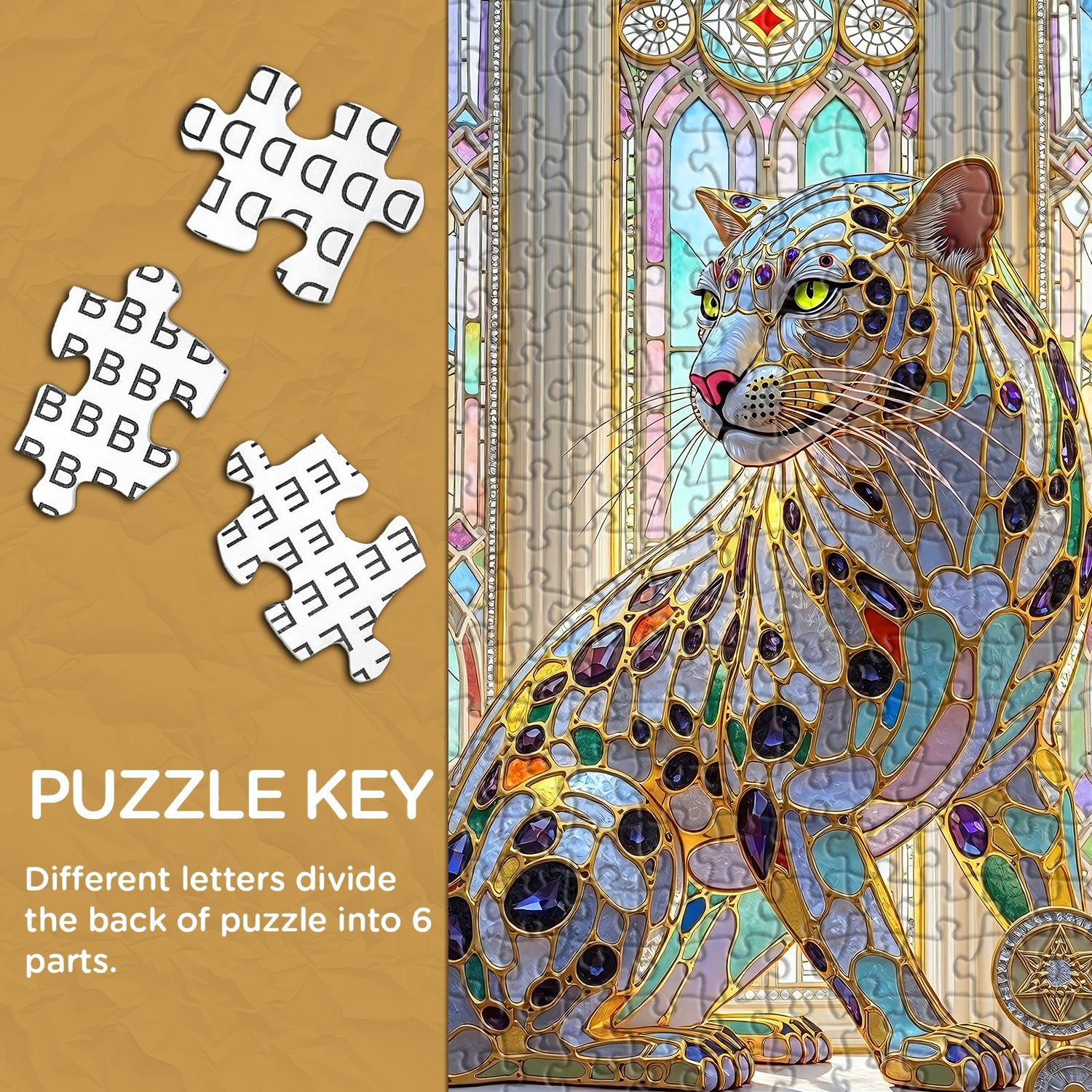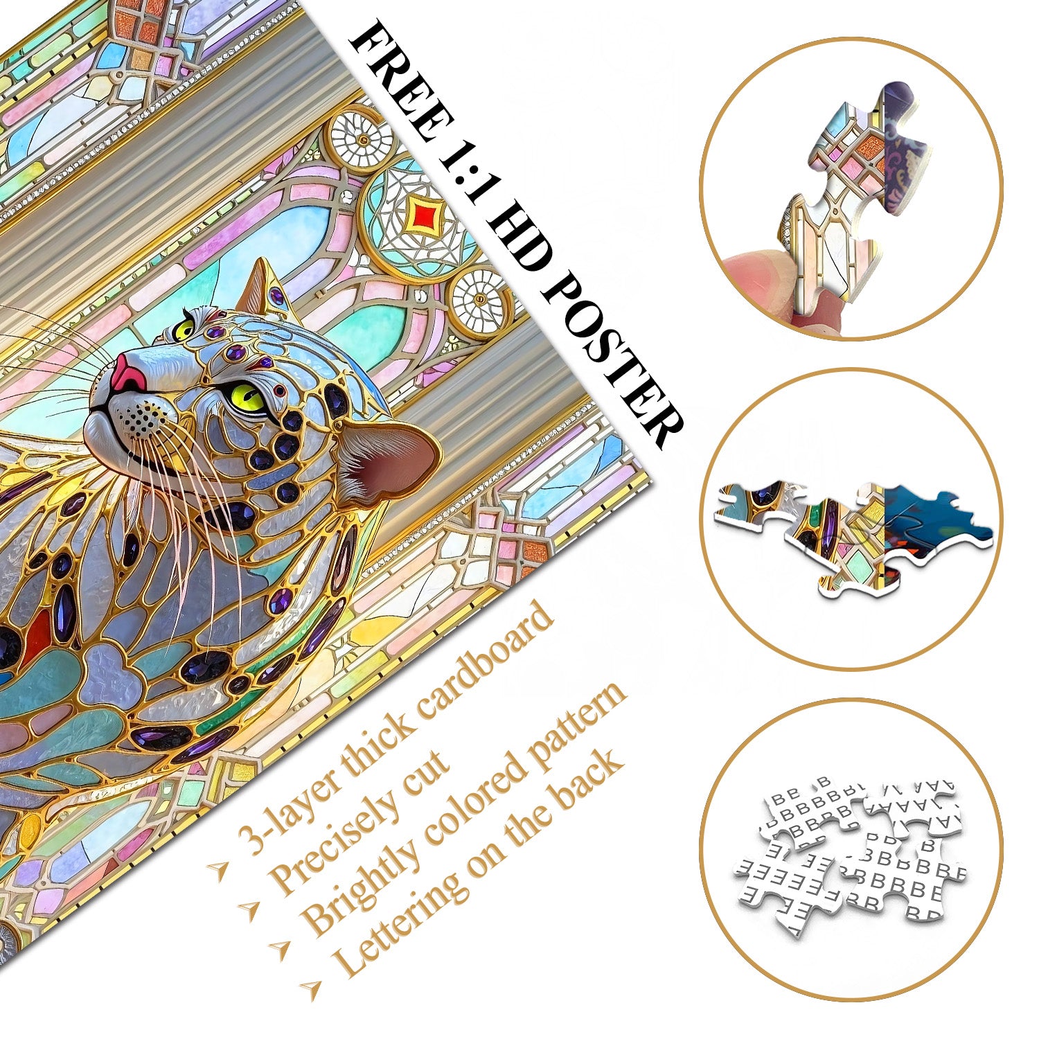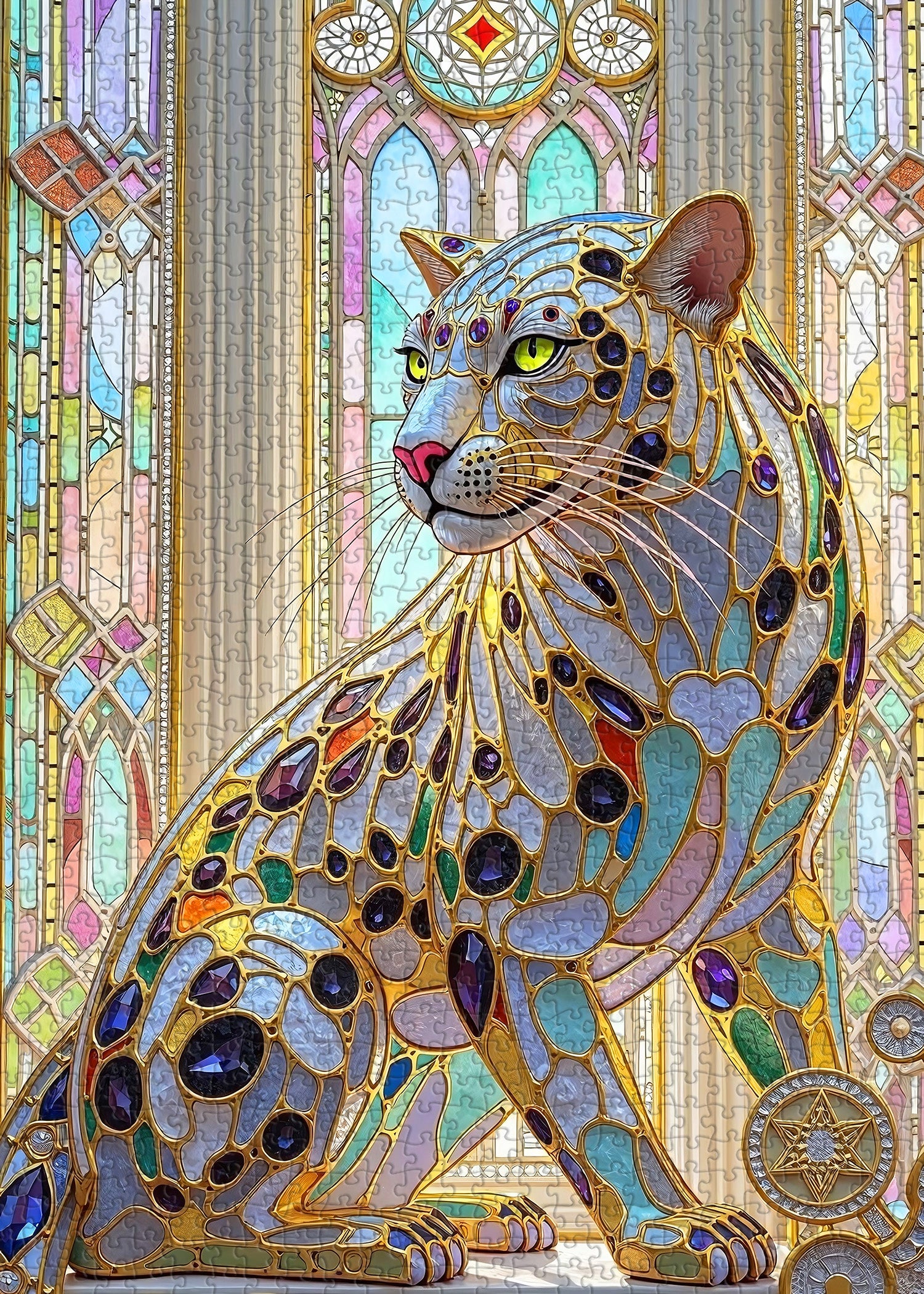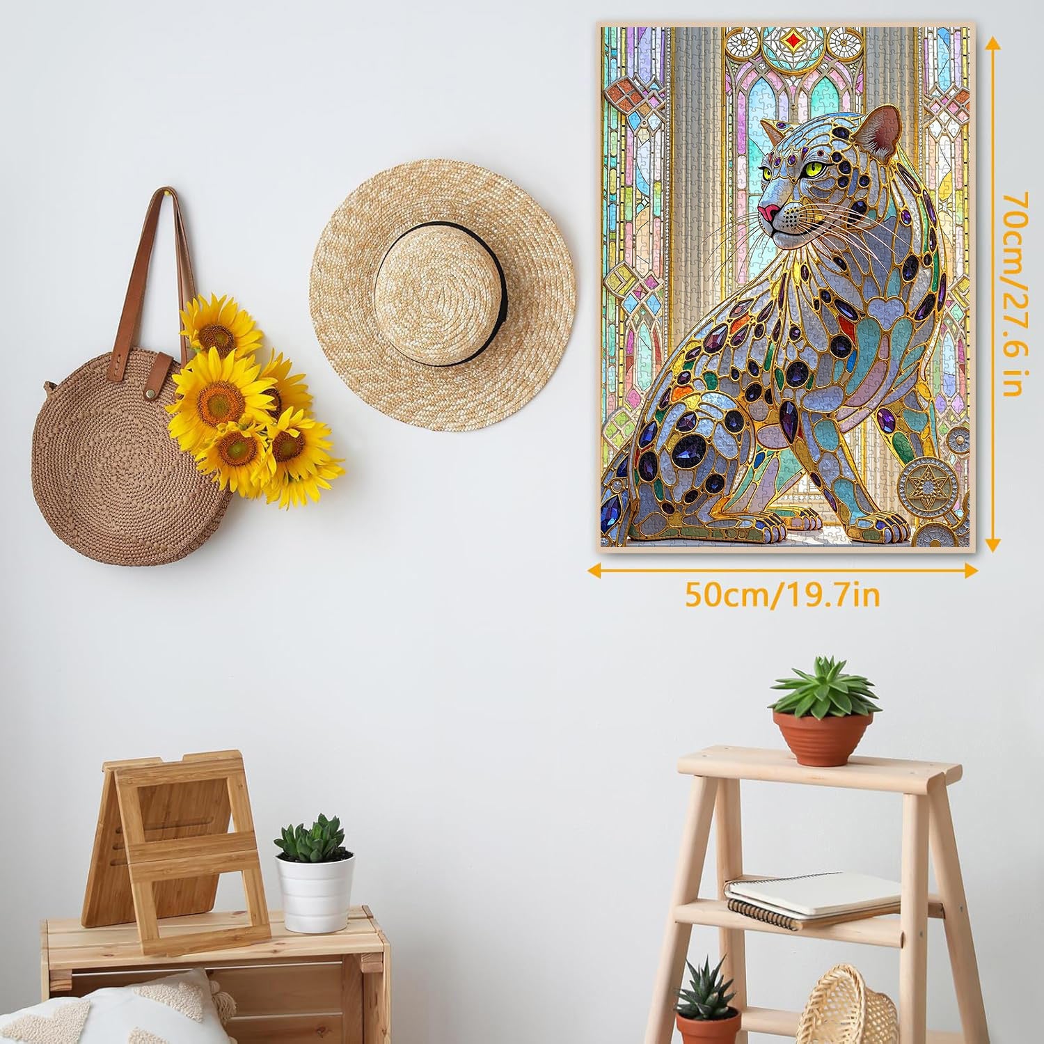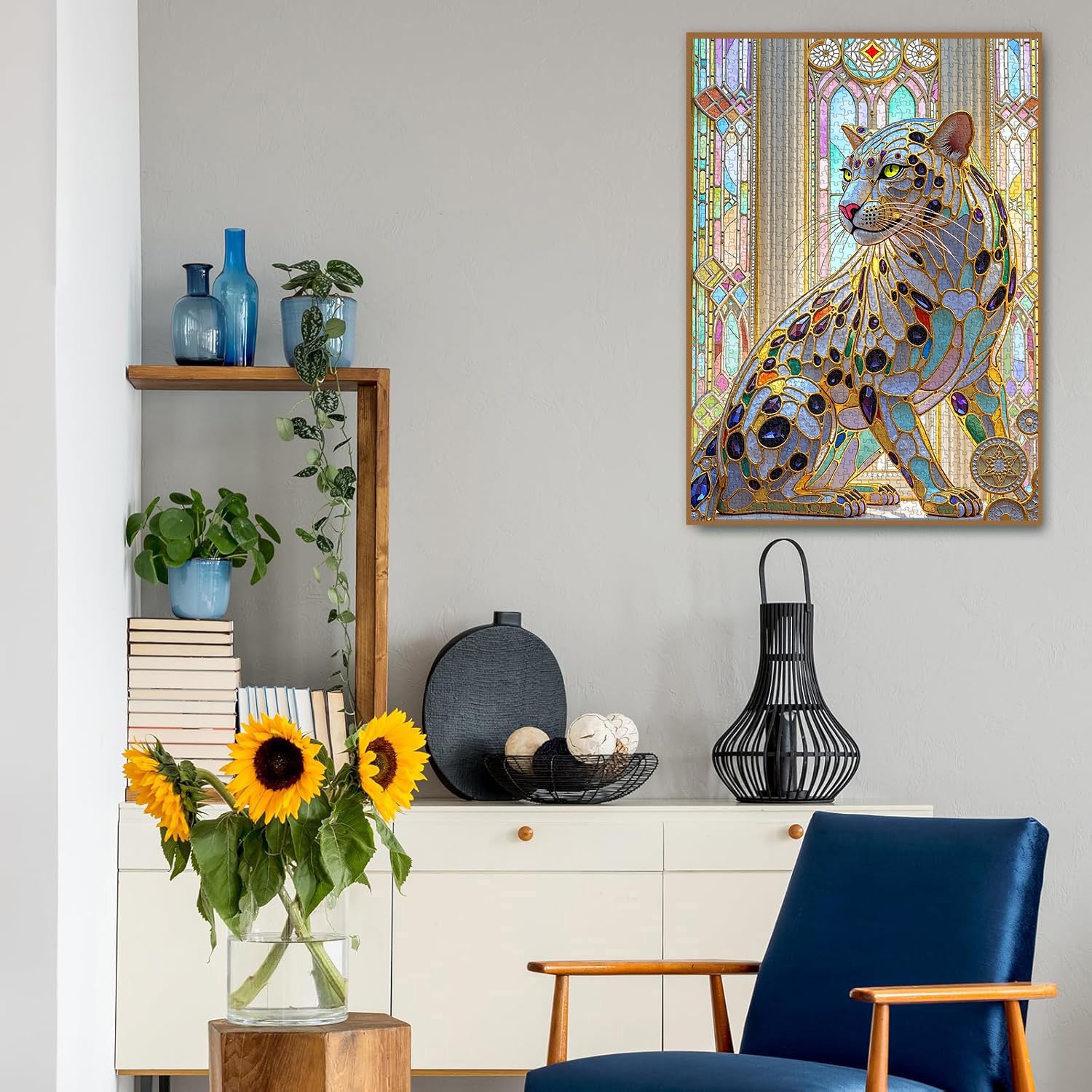 🐆🎨Style et sujet artistiques: Comporte un léopard confectionné dans un Style d'art en vitrail avec des contours dorés, mêlant un savoir-faire complexe et des couleurs vibrantes.