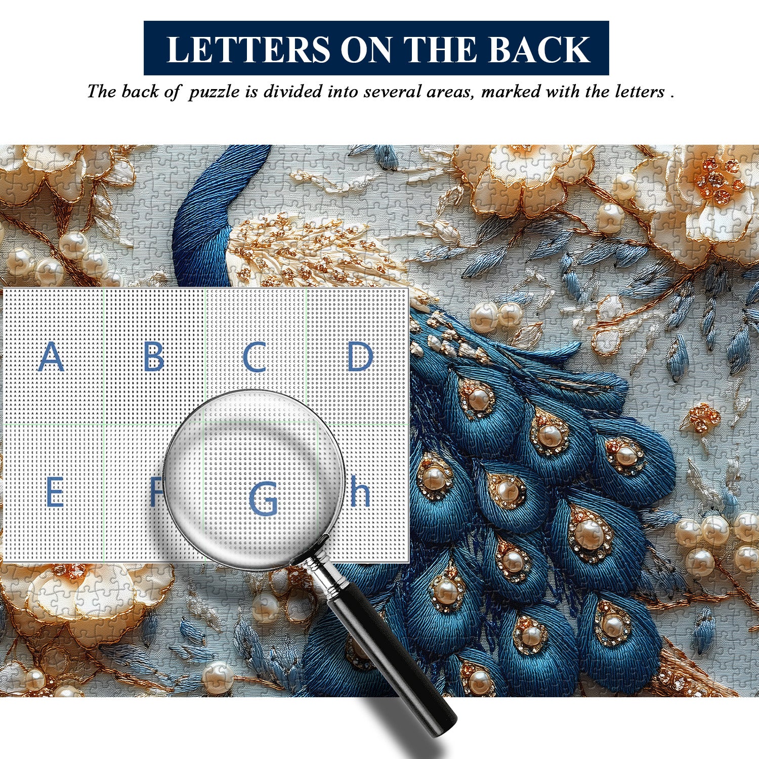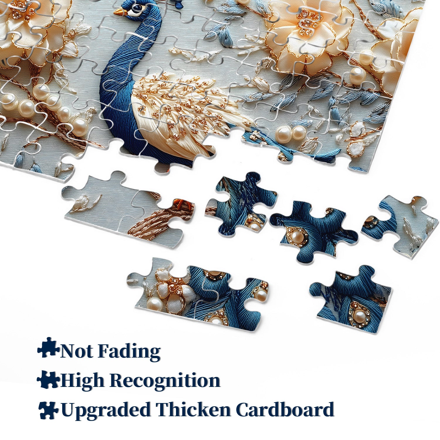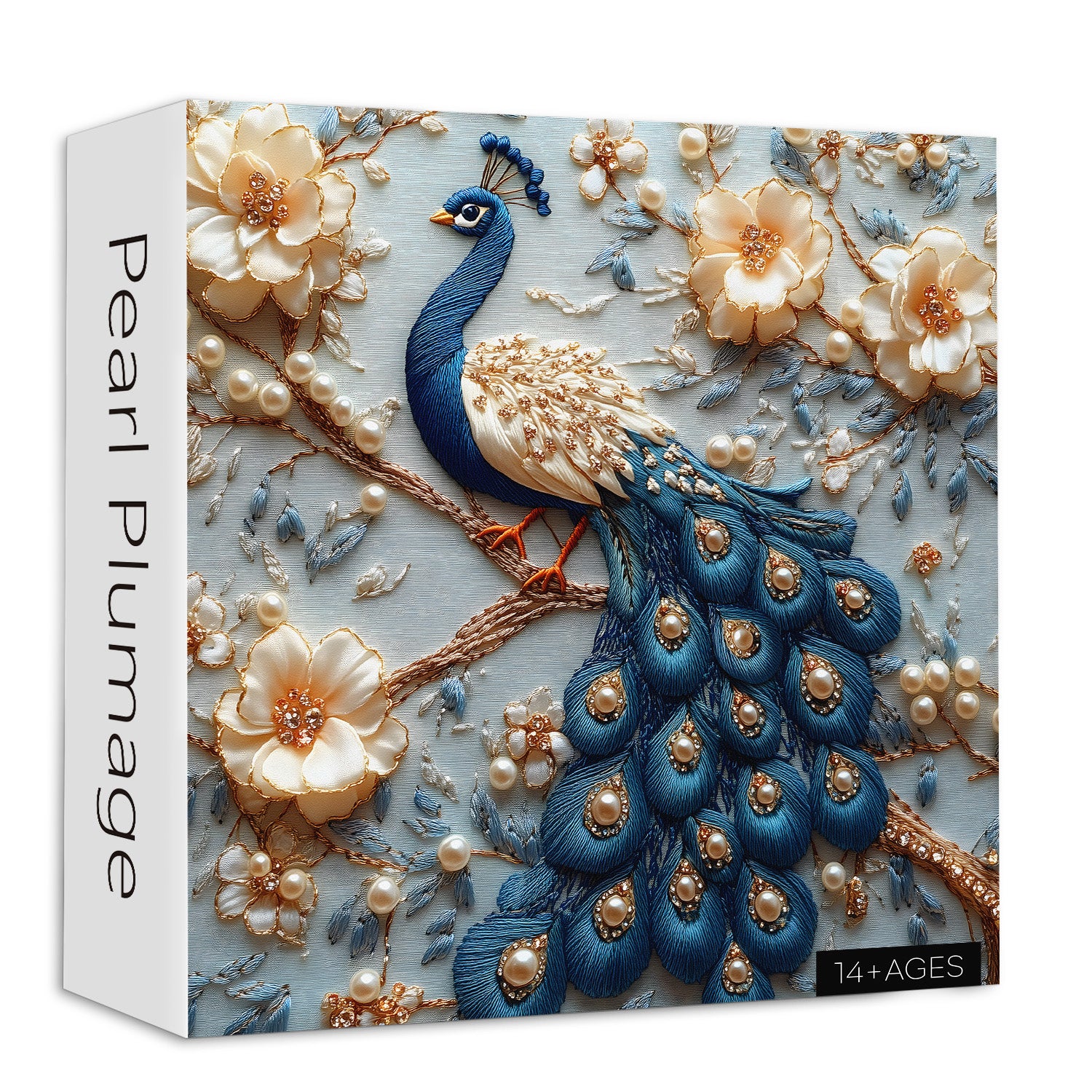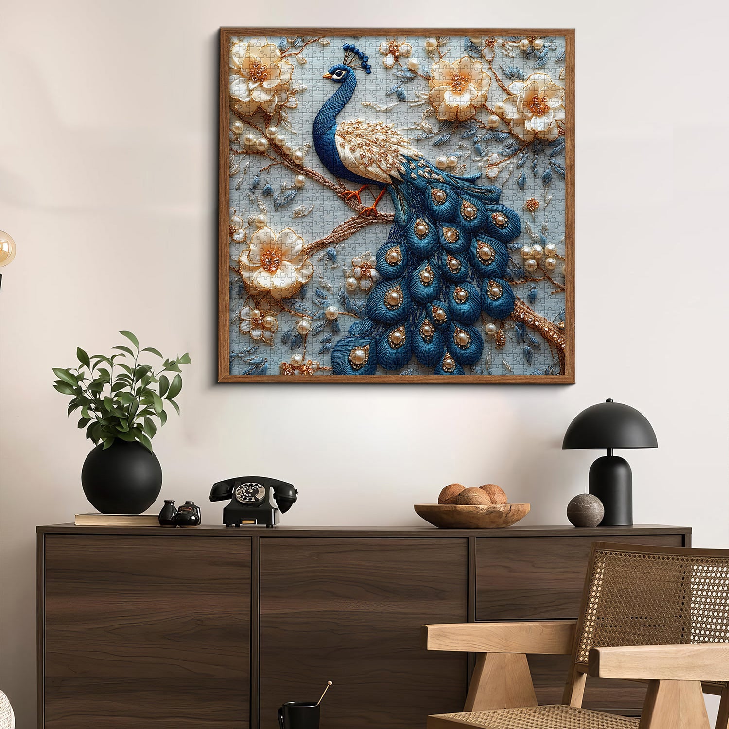 Composition: Le paon est positionné au milieu des fleurs de couleur crème et des branches délicates, avec des perles éparses rehaussant l'arrangement orné et élégant.