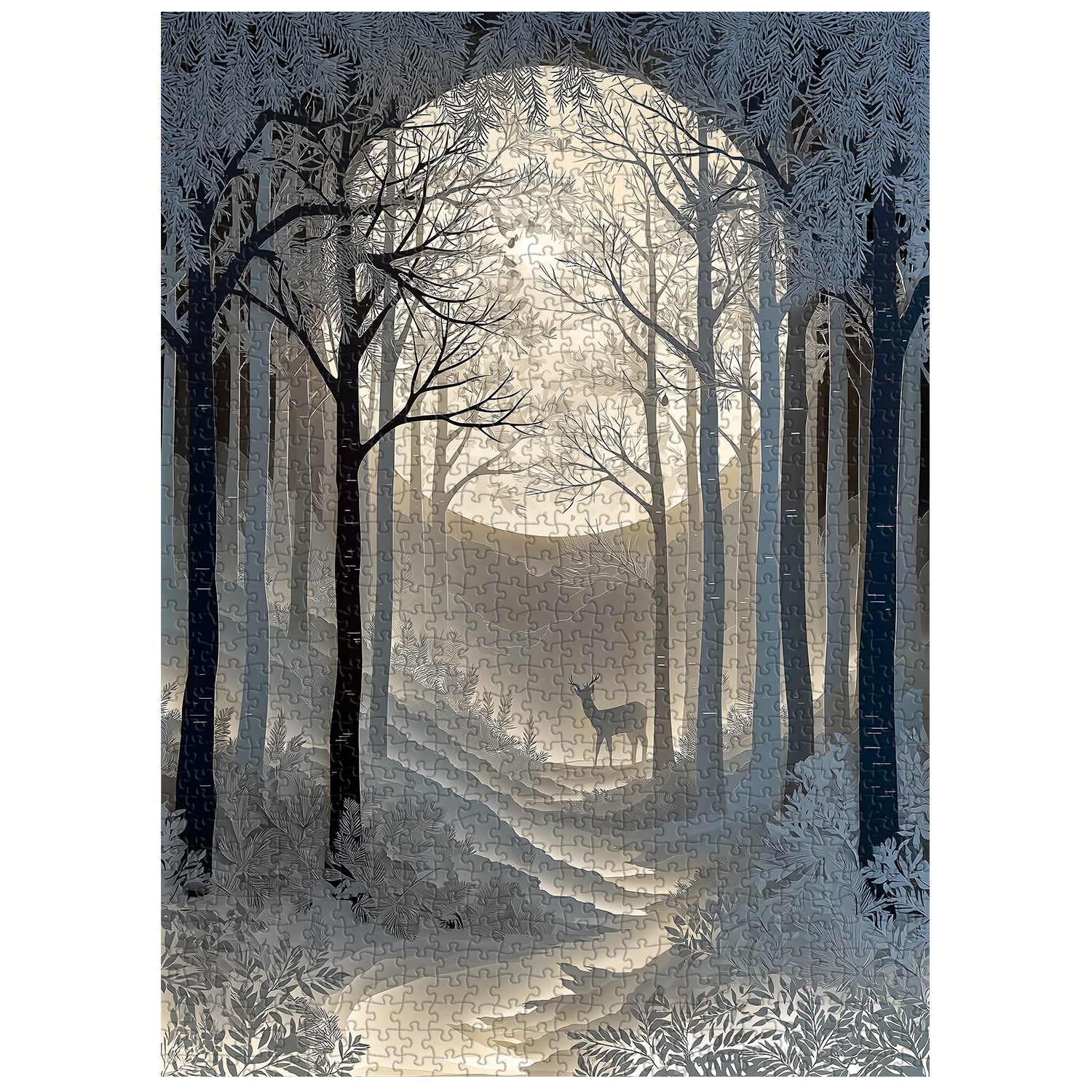 Composition: Un tracé profond et axé sur la perspective (le chemin mène le regard vers le cerf et la lune lointaine) qui met l'accent sur l'immensité tranquille de la forêt la nuit.