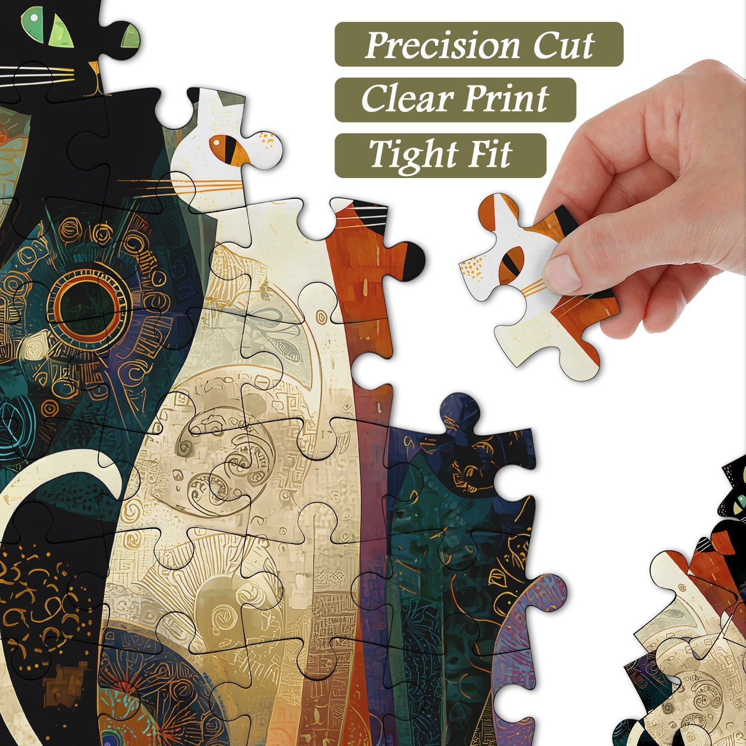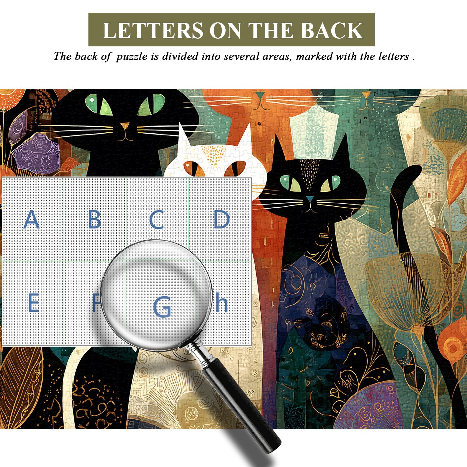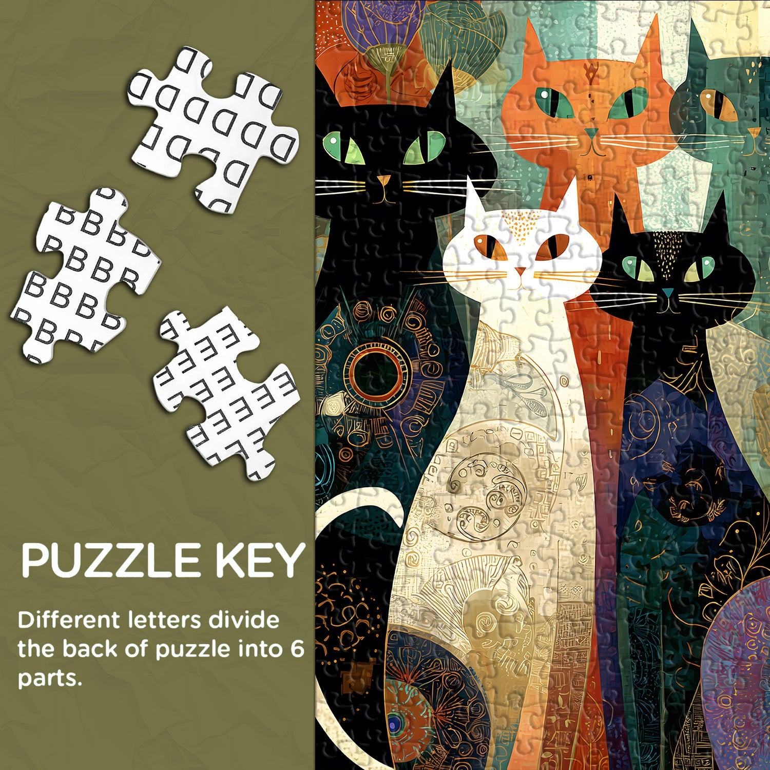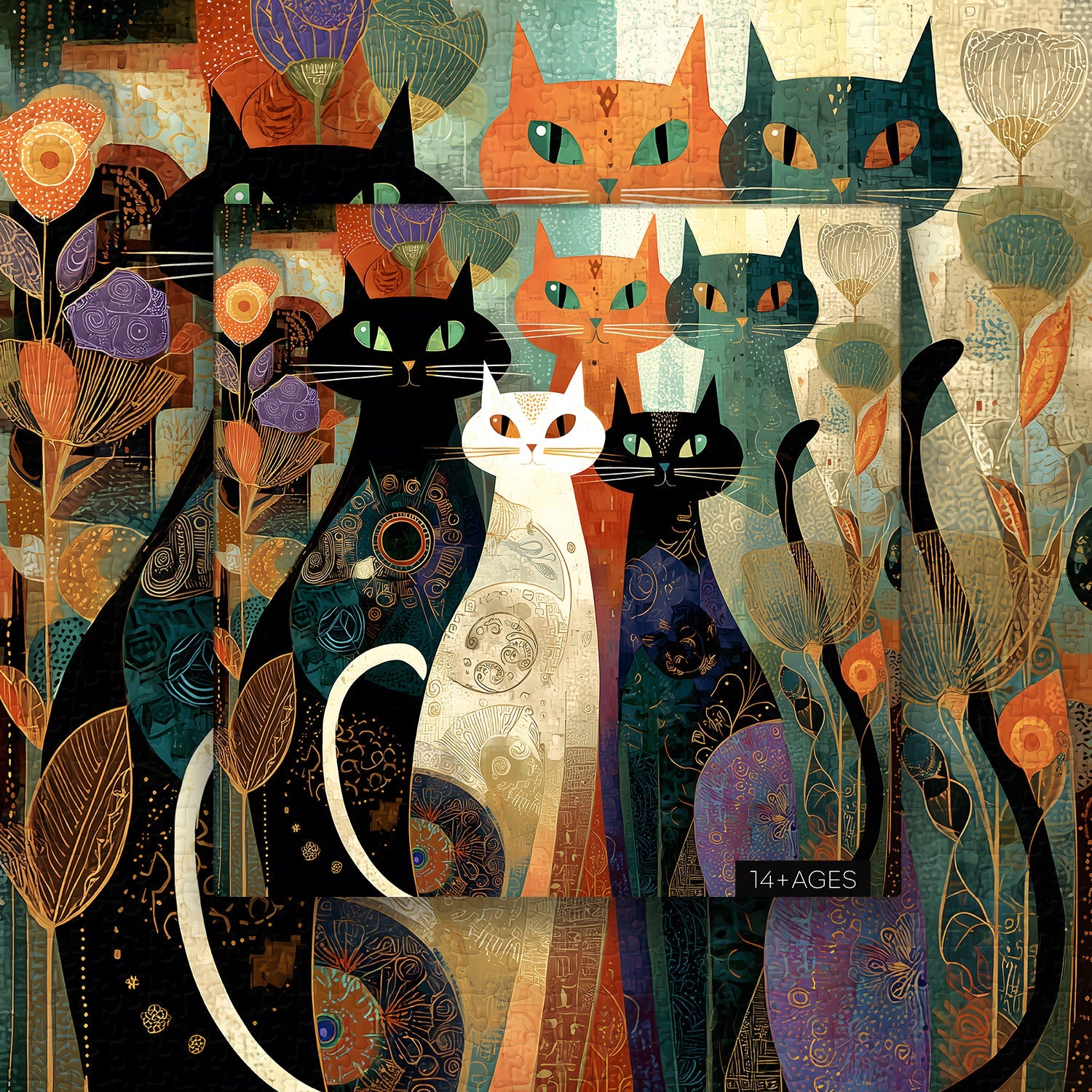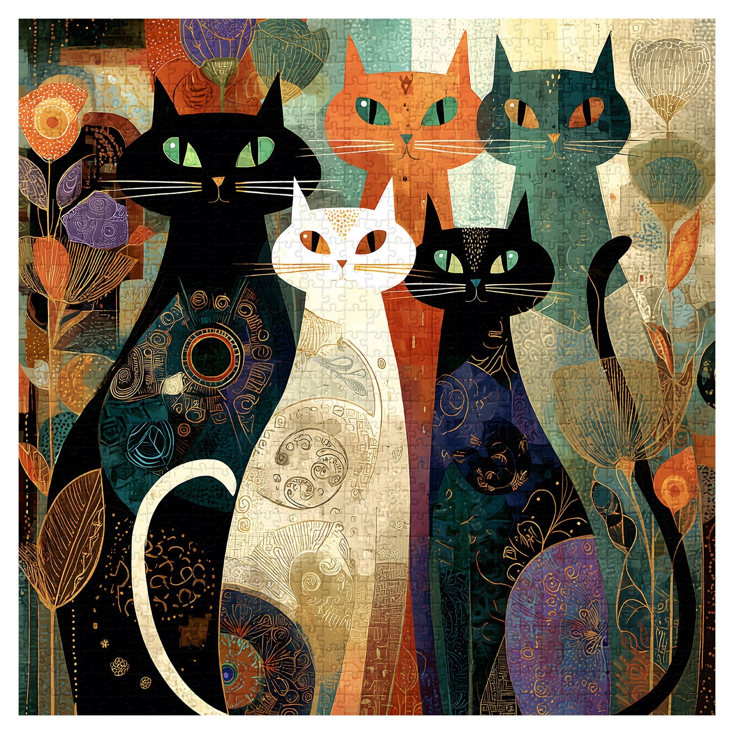 Design artistico del gatto Boho: Un'illustrazione vivace e moderna in stile bohémien con cinque gatti dai motivi unici circondati da stravaganti motivi floreali. La ricca tavolozza di colori terrosi e i dettagli intricati lo rendono una festa per gli occhi, trasformando il tempo dei puzzle in un'esperienza di apprezzamento dell'arte.