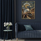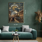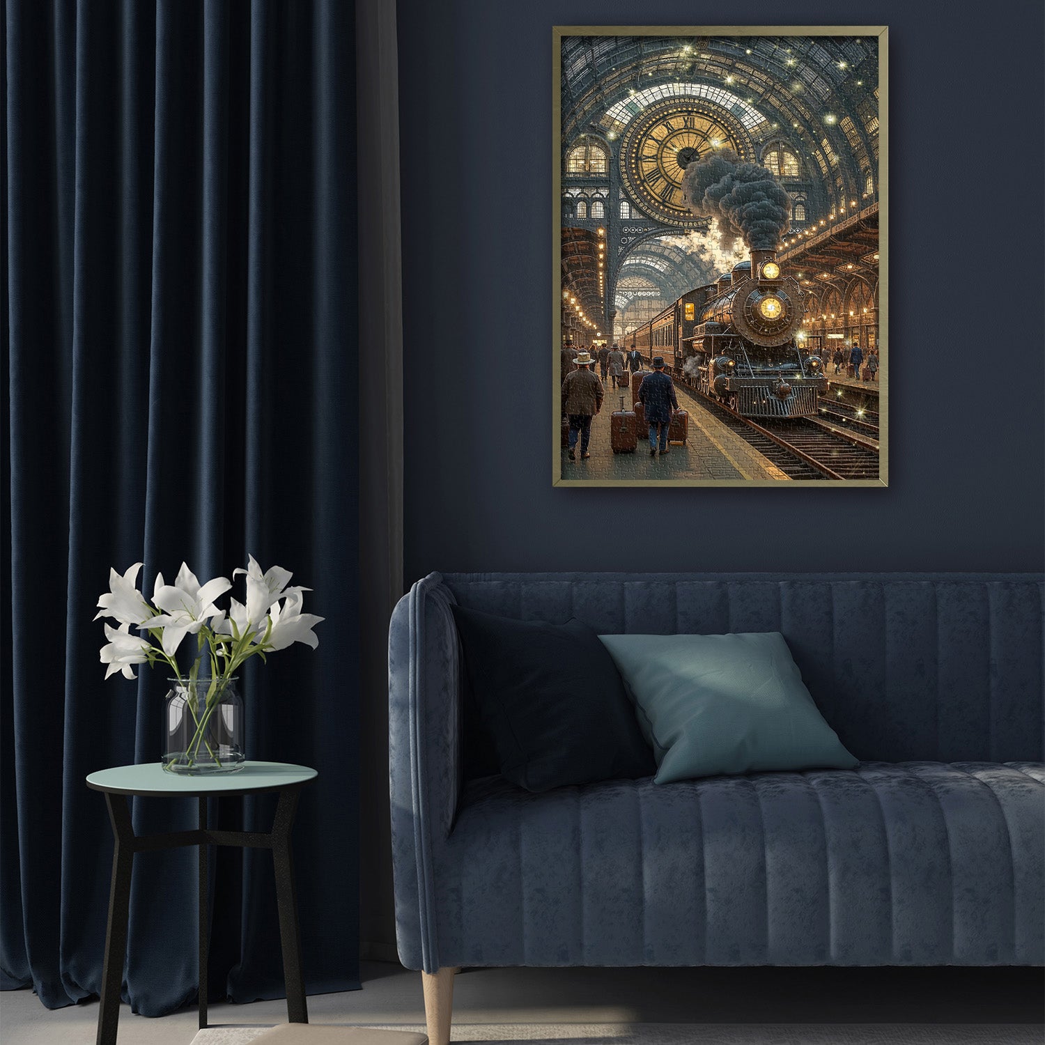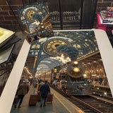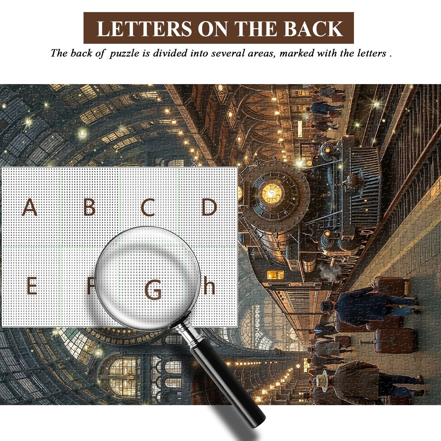 ⚙️🧍Elementi chiave: Contiene una locomotiva a vapore dettagliata, un enorme orologio antico, soffitti ad arco in vetro e viaggiatori vestiti d'epoca, il tutto reso con dettagli intricati del pezzo del puzzle.