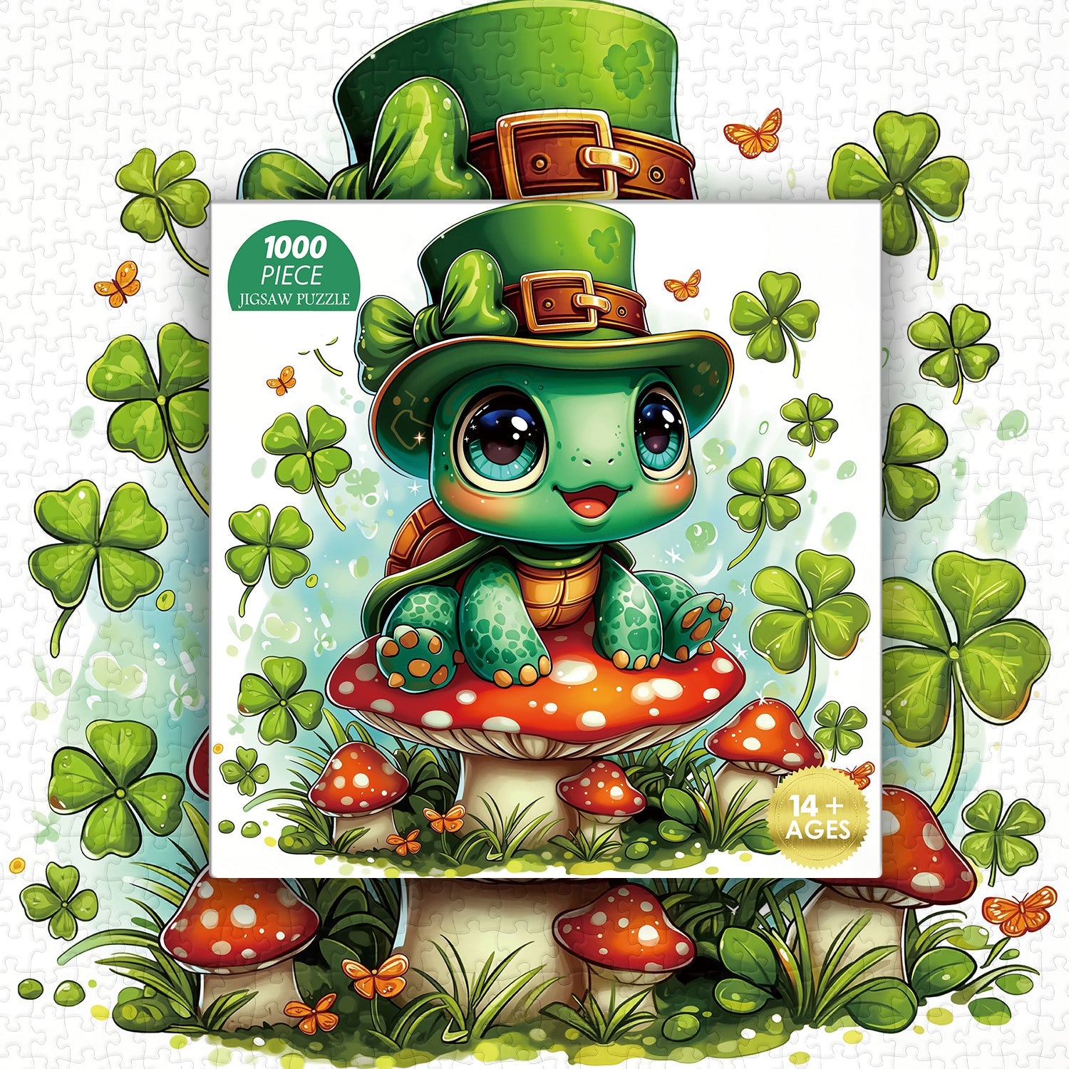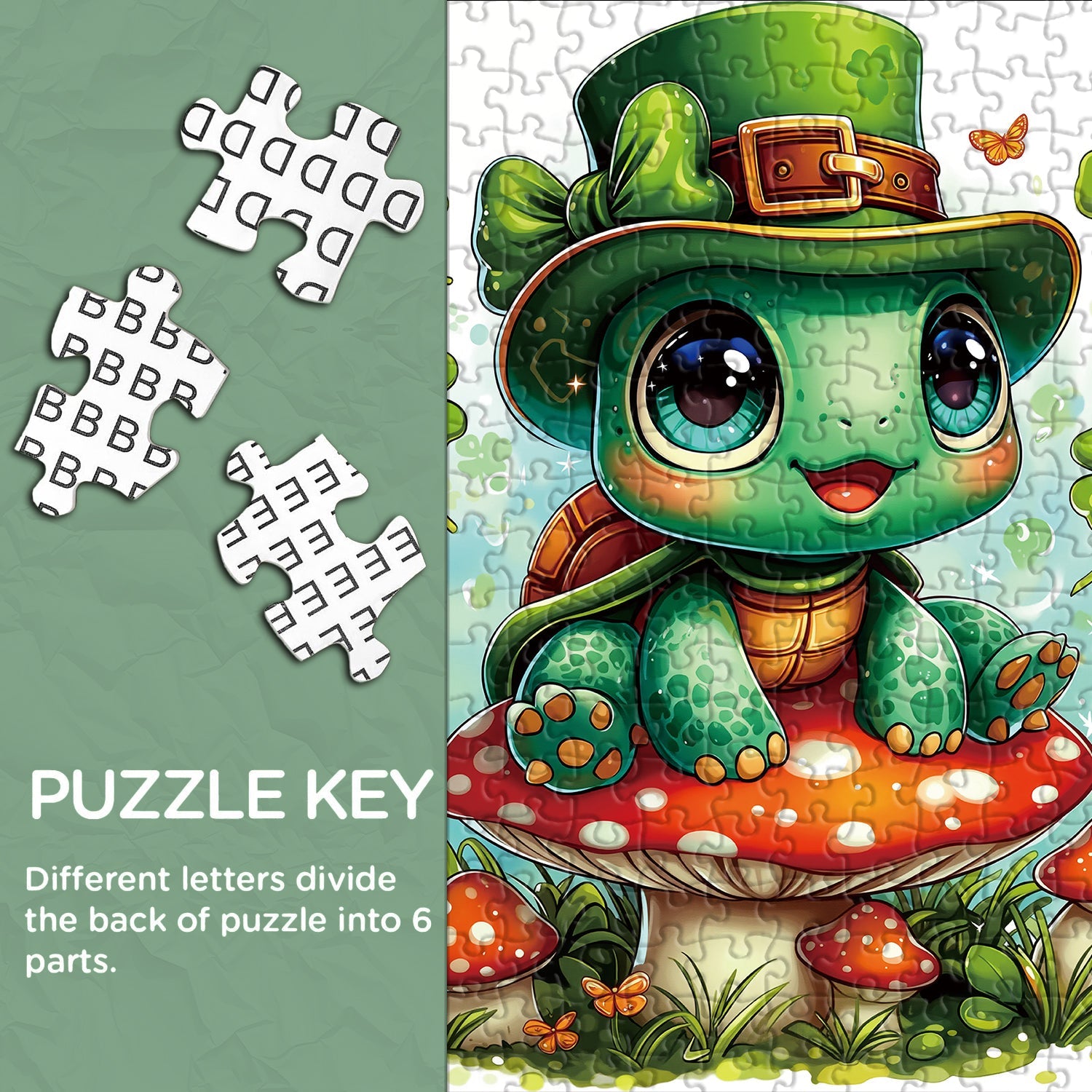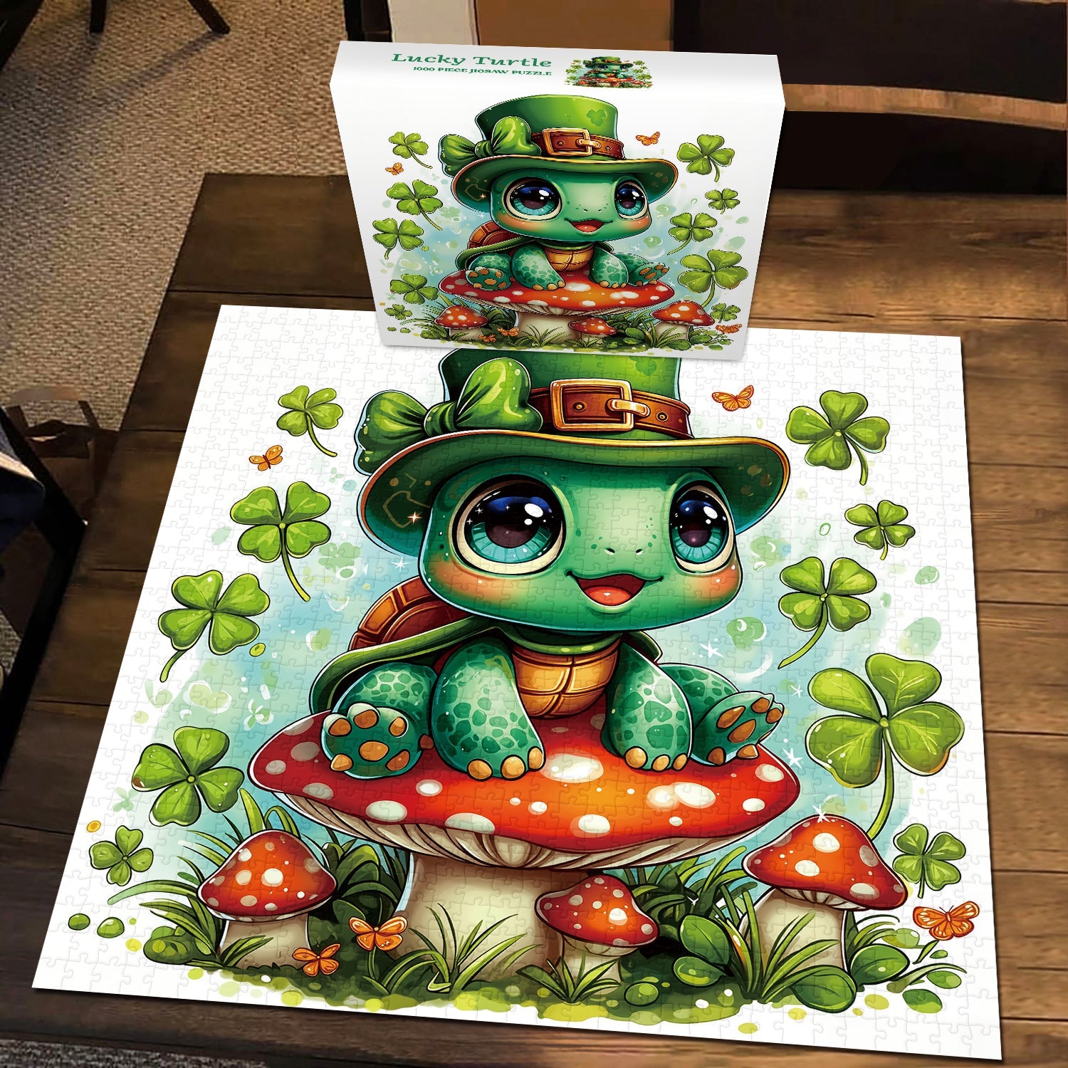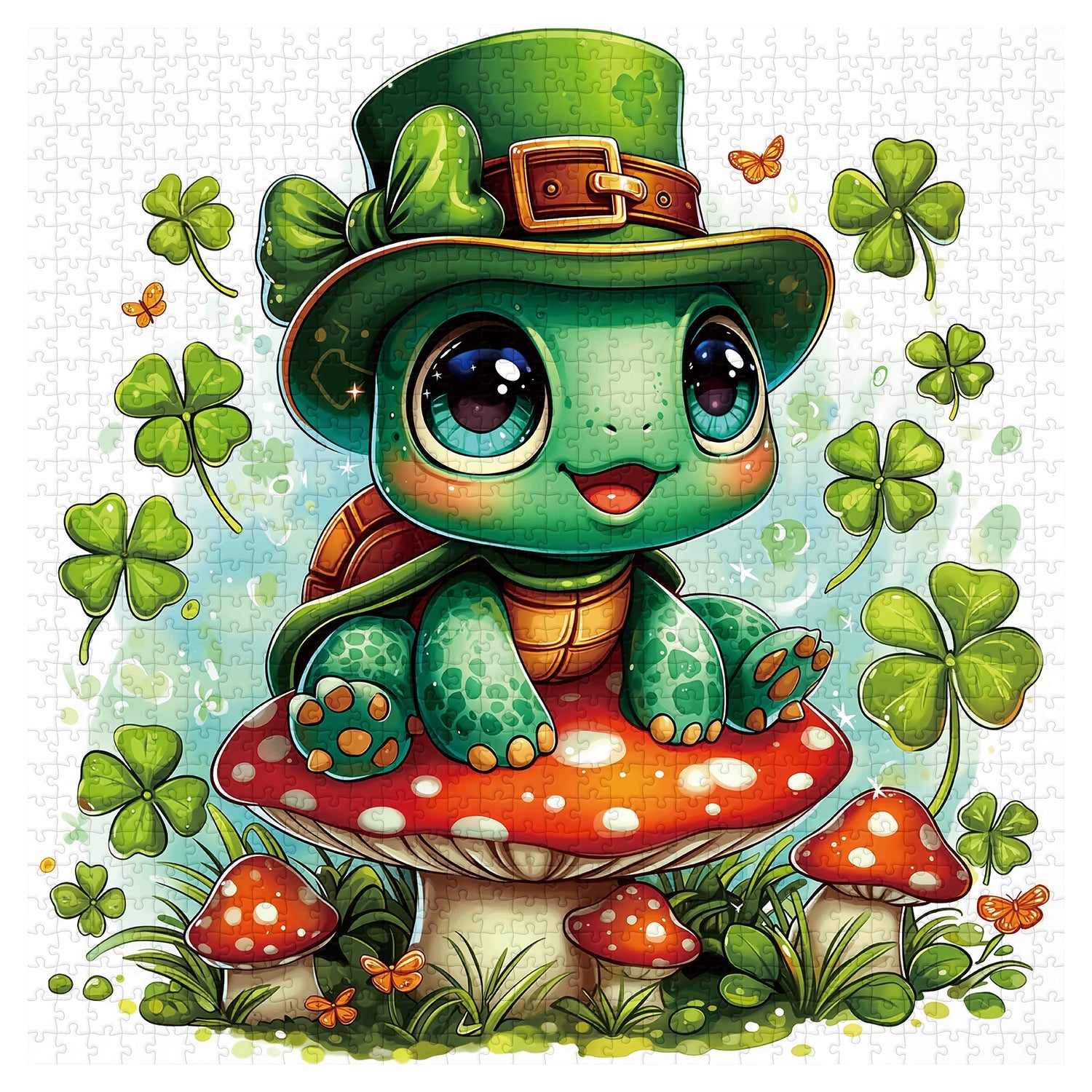 Entra nel giocoso mondo del giorno di San Patrizio con Tartaruga fortunata puzzle, con un'adorabile tartaruga dagli occhi spalancati con un cappello da folletto, appollaiata su un fungo rosso brillante e circondata da fortunati quadrifogli e farfalle svolazzanti: ogni dettaglio vibrante irradia fascino irlandese ed energia gioiosa.