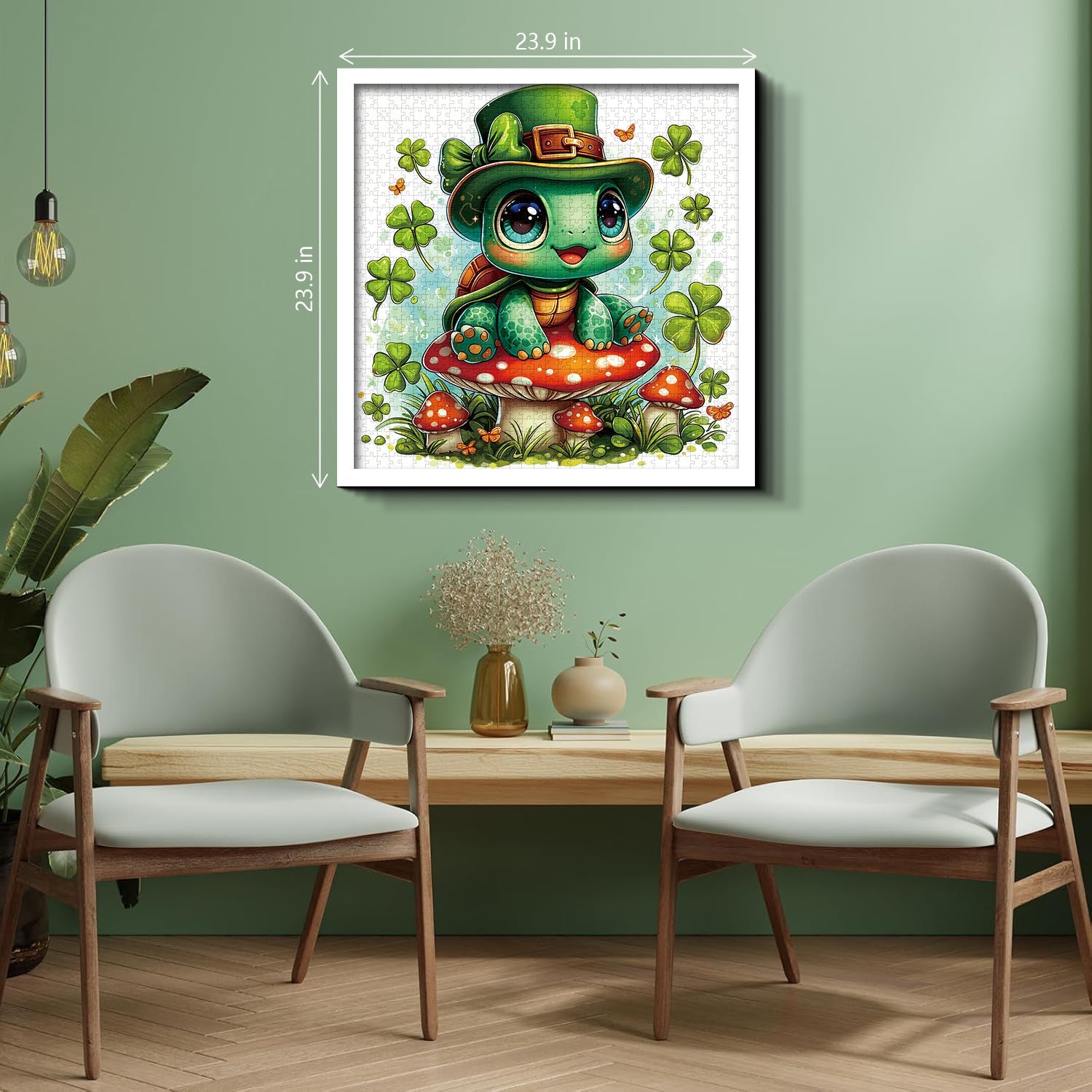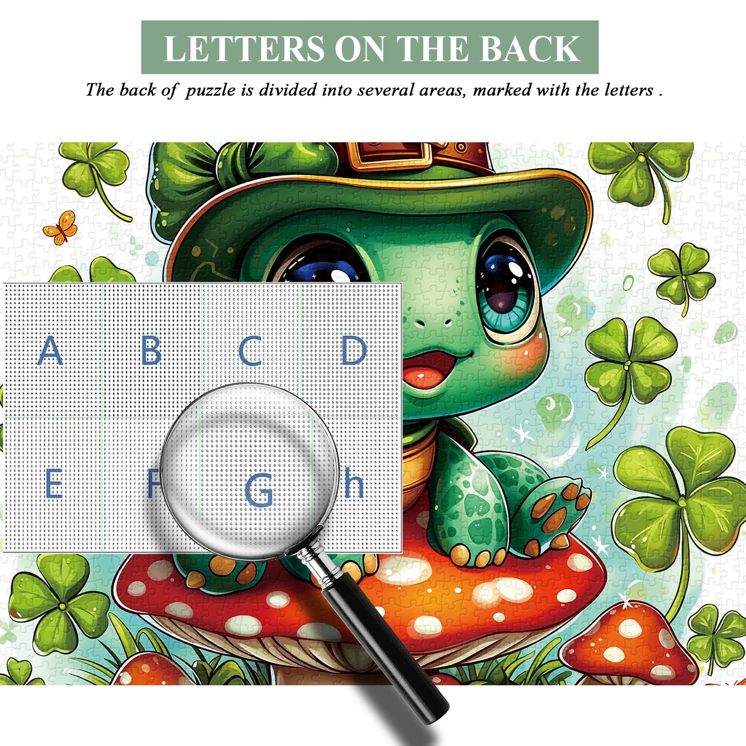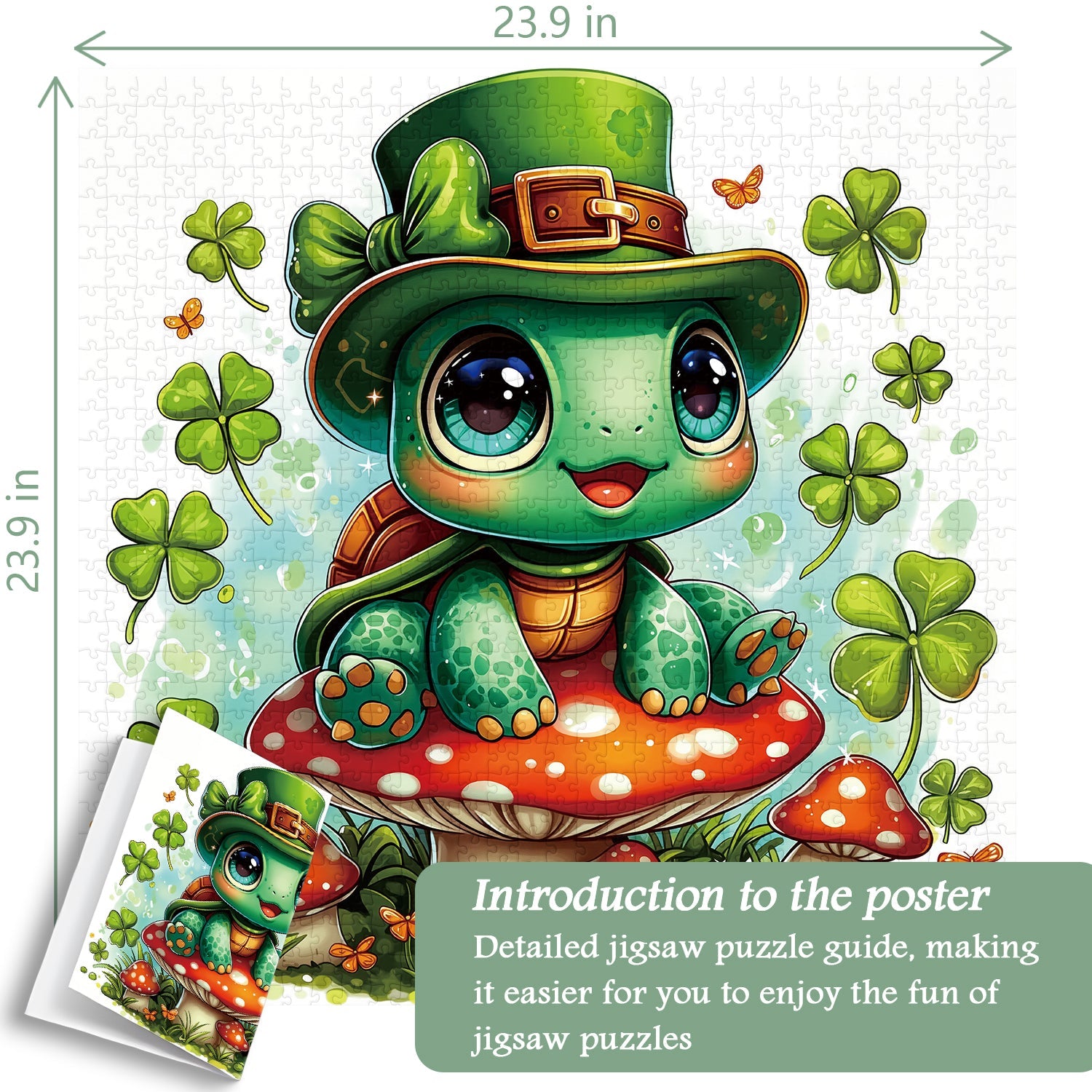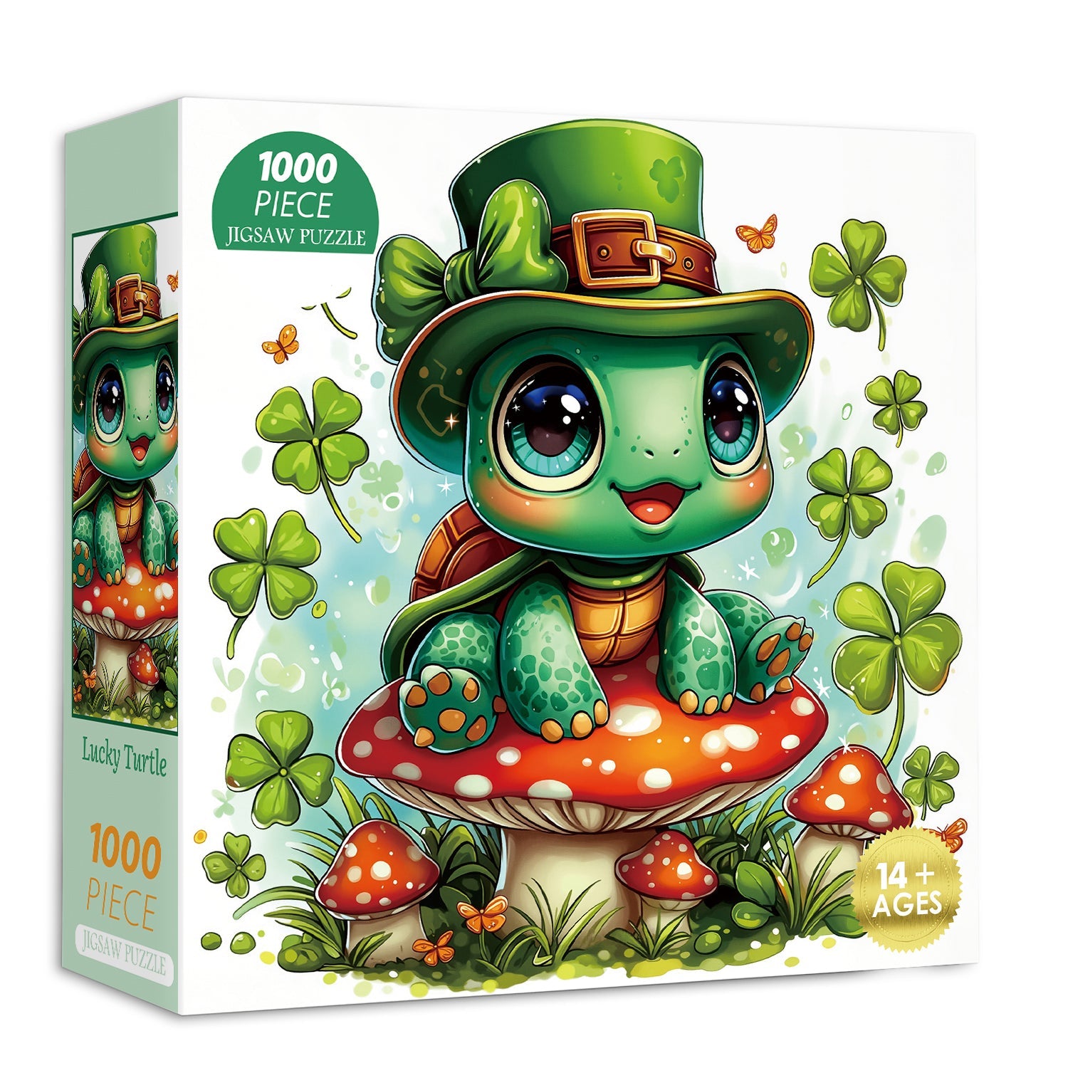 Entra nel giocoso mondo del giorno di San Patrizio con Tartaruga fortunata puzzle, con un'adorabile tartaruga dagli occhi spalancati con un cappello da folletto, appollaiata su un fungo rosso brillante e circondata da fortunati quadrifogli e farfalle svolazzanti: ogni dettaglio vibrante irradia fascino irlandese ed energia gioiosa.